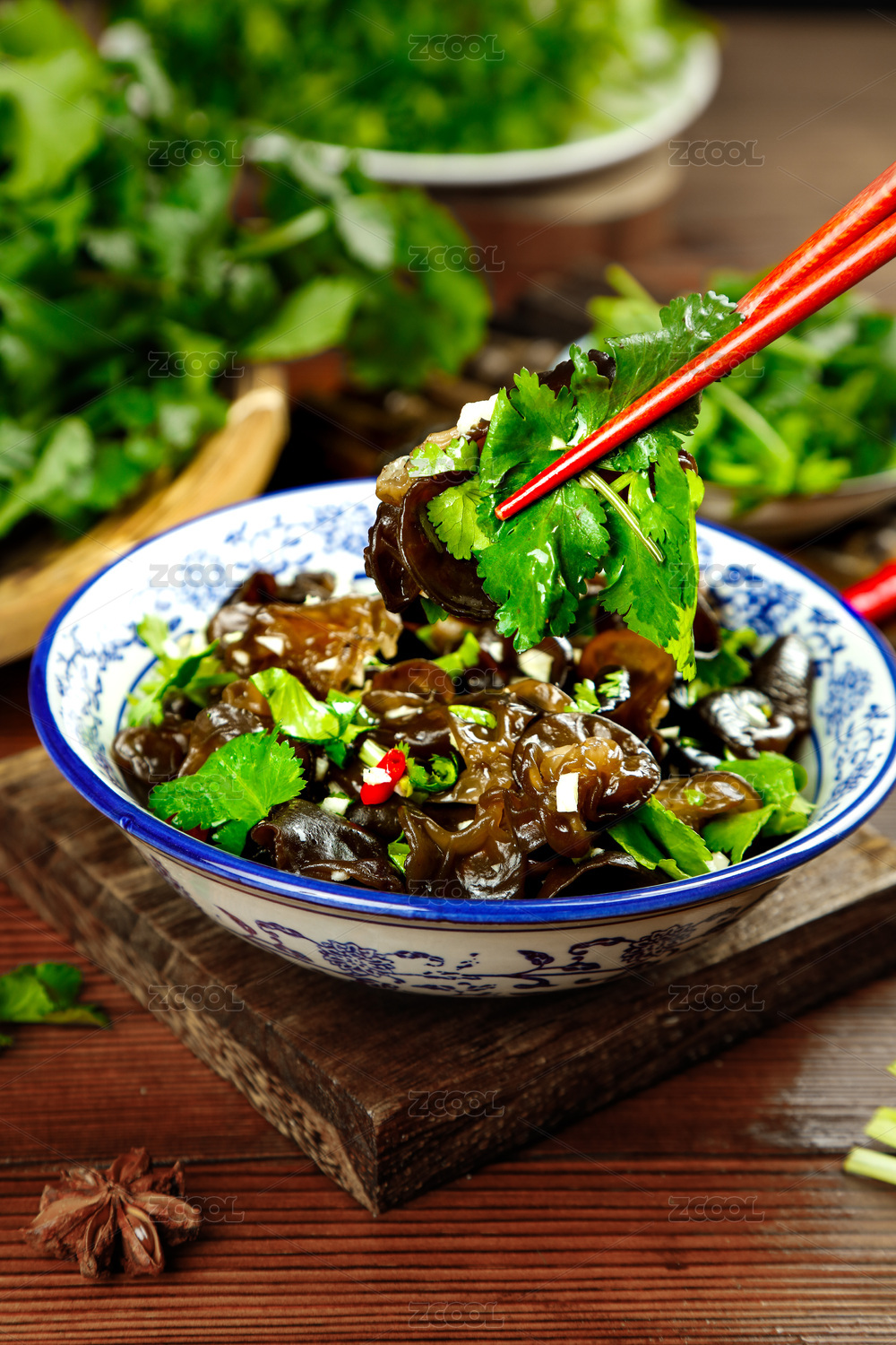 木板上放著一碗涼拌黑木耳和筷子上夾著香菜