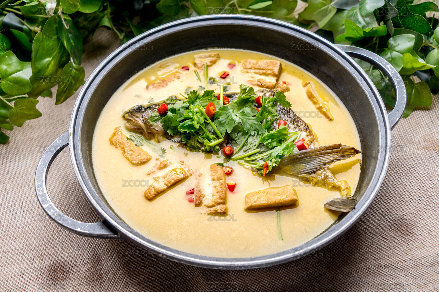 鮮美多汁的魚(yú)頭燉豆腐盛放在黑色鐵鍋中