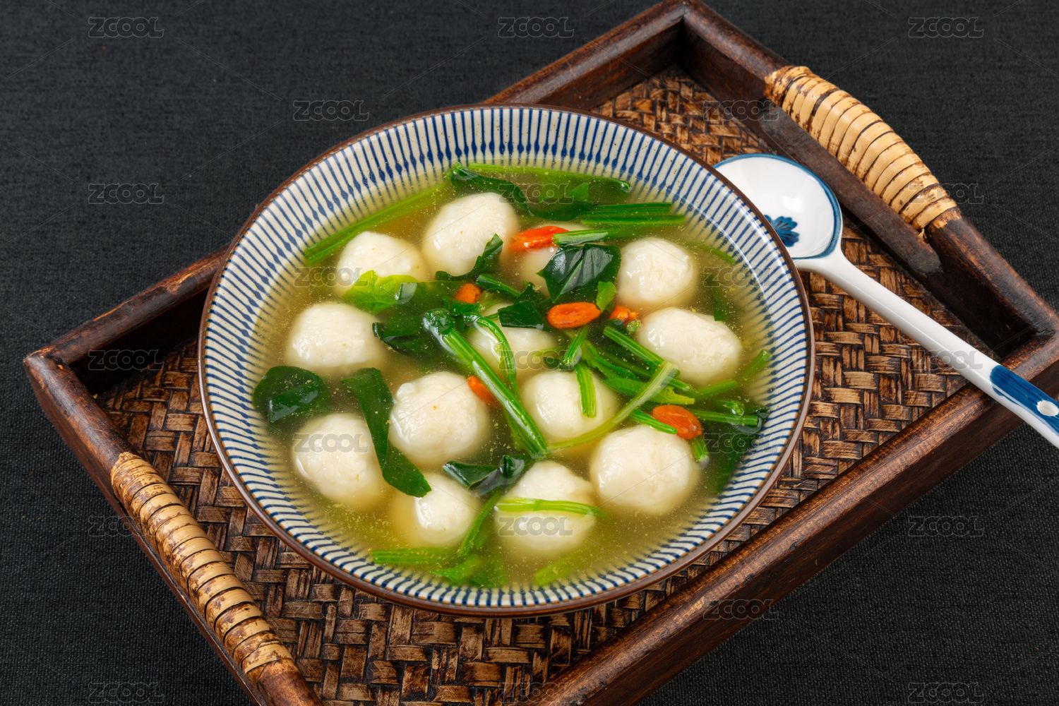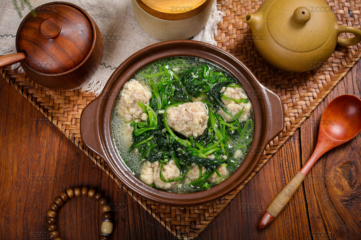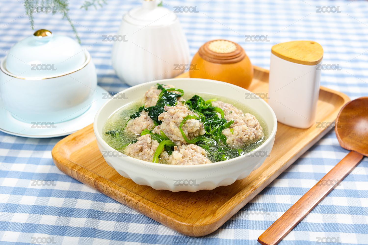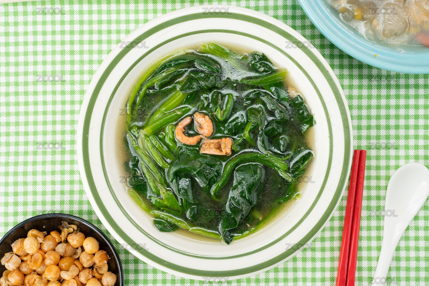 盛放著菠菜蛋花湯的青花碗擺放在桌面上