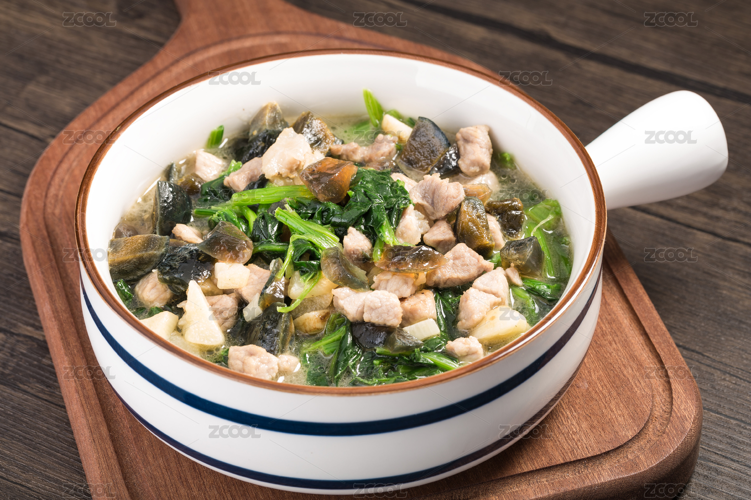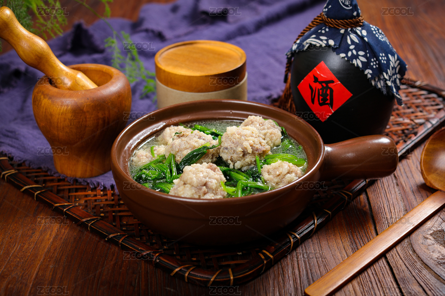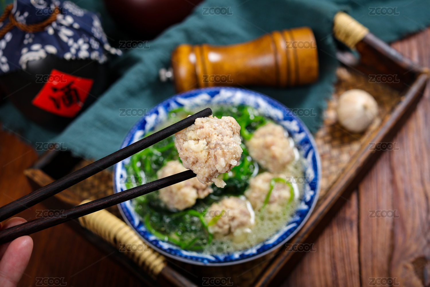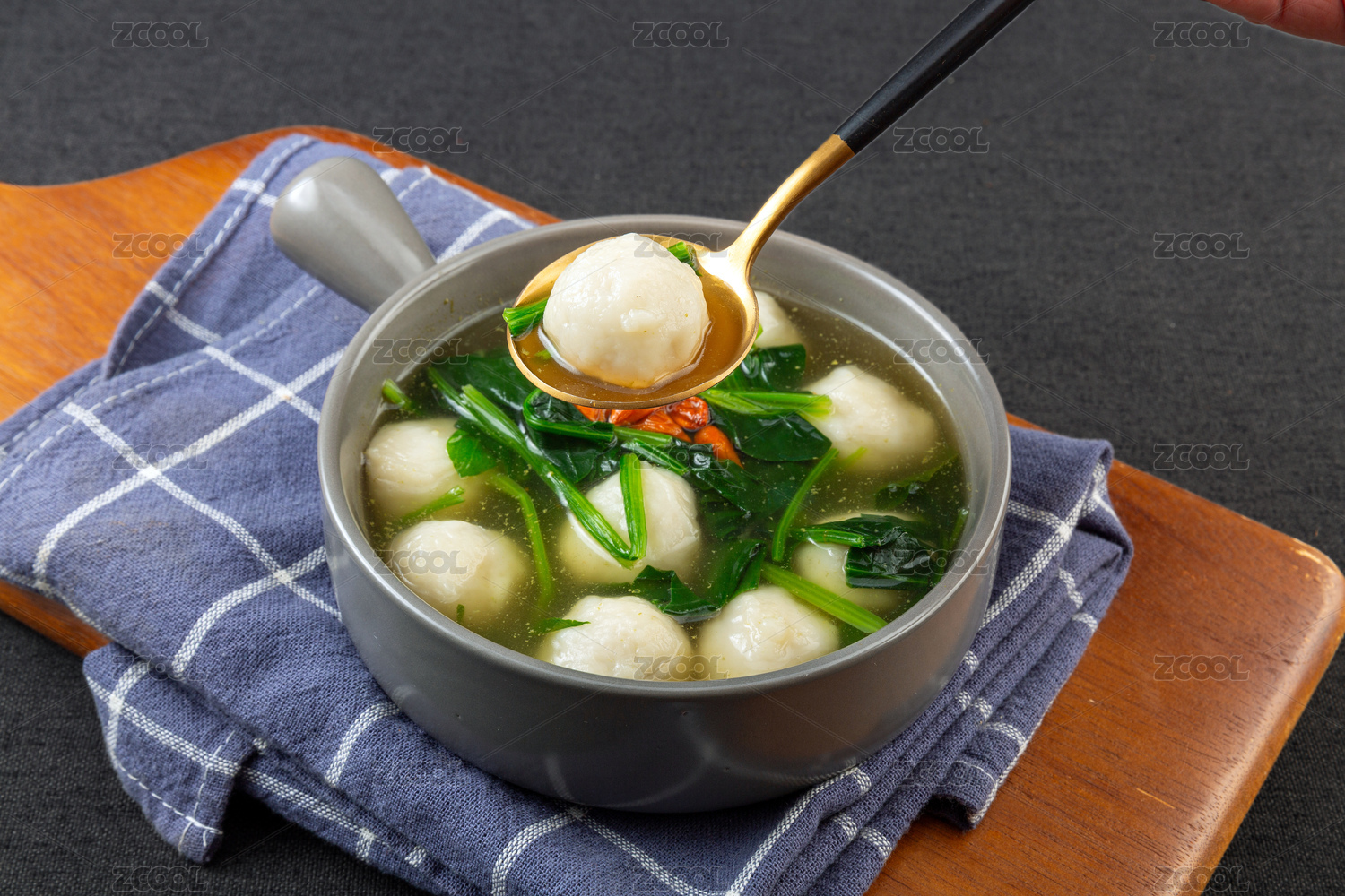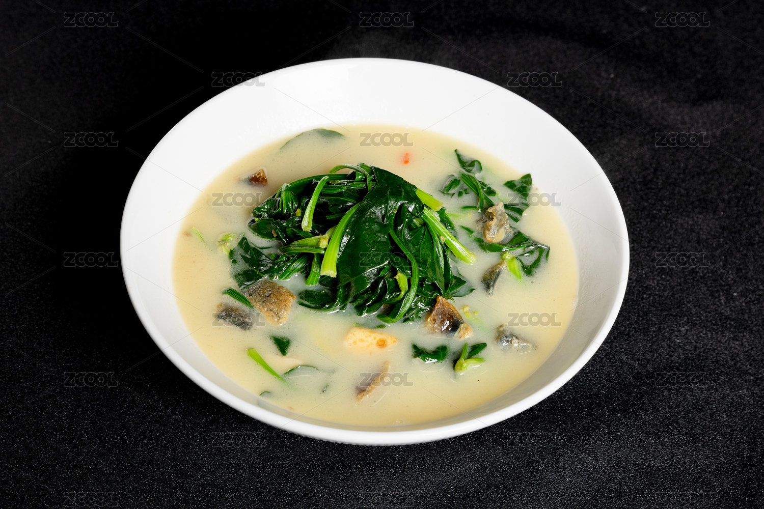 盛放著菠菜蛋花湯的青花碗擺放在桌面上
