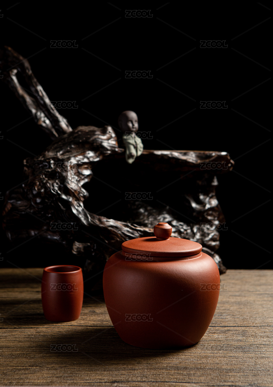 一把異形不規(guī)則紫砂壺特寫木桌面黑色背景