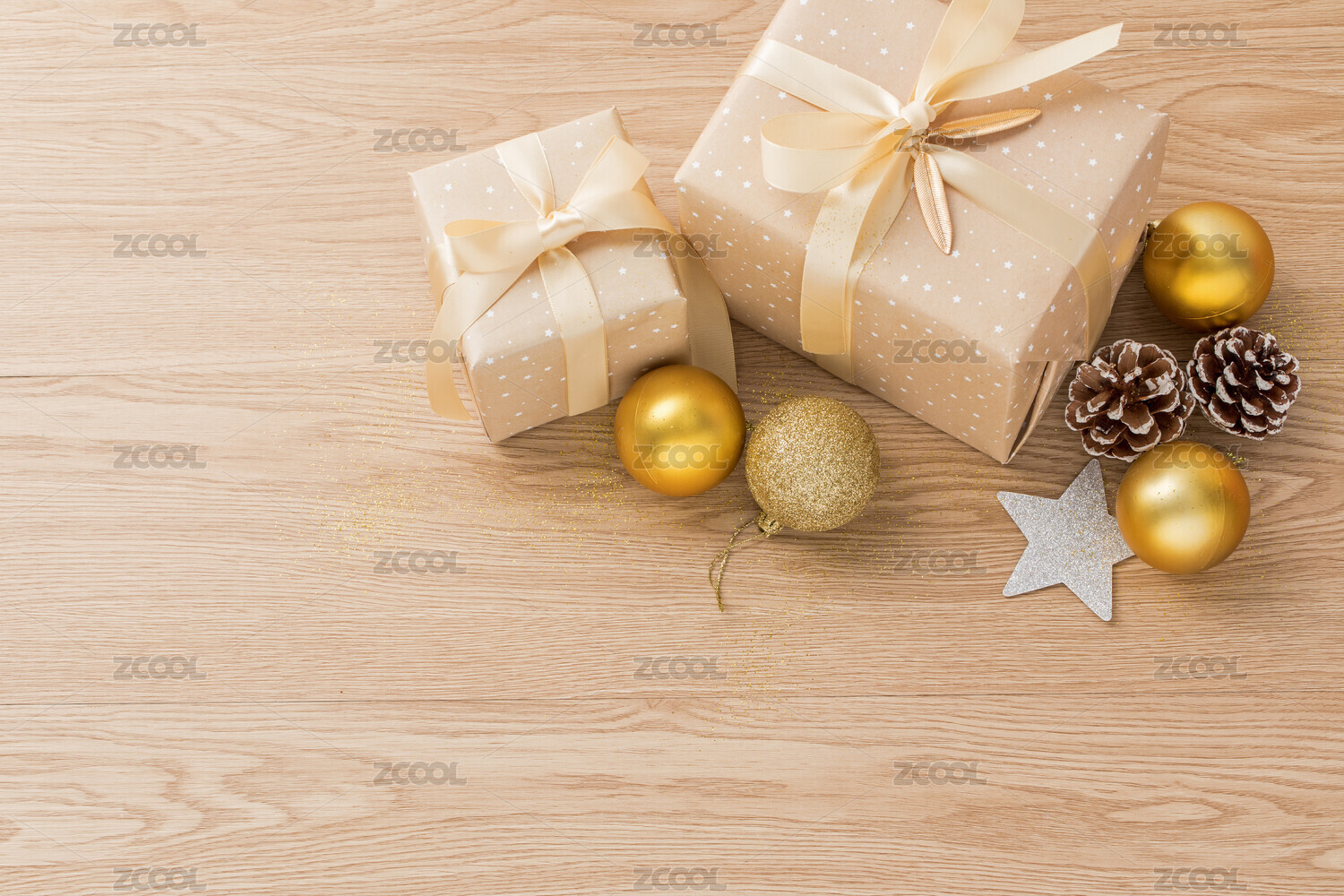 木桌面一角堆著禮盒和金色圣誕裝飾物
