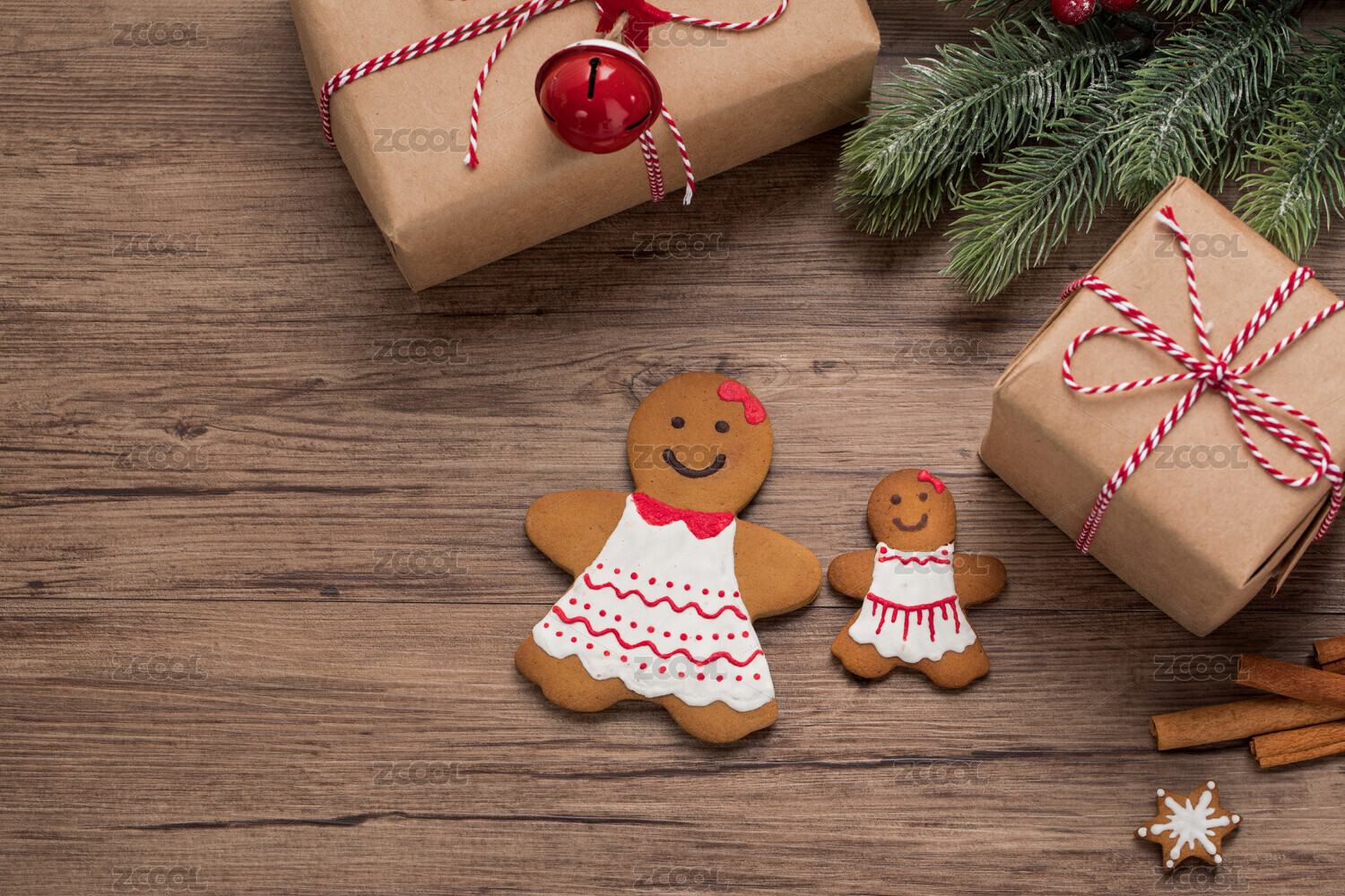 木桌面一角堆著禮盒和圣誕裝飾物