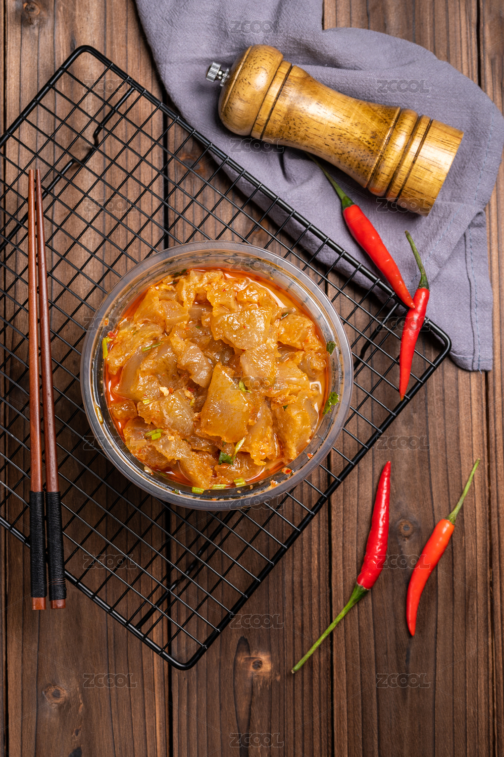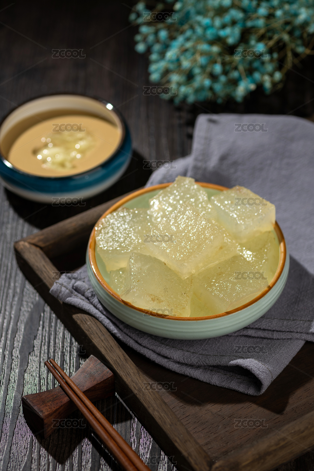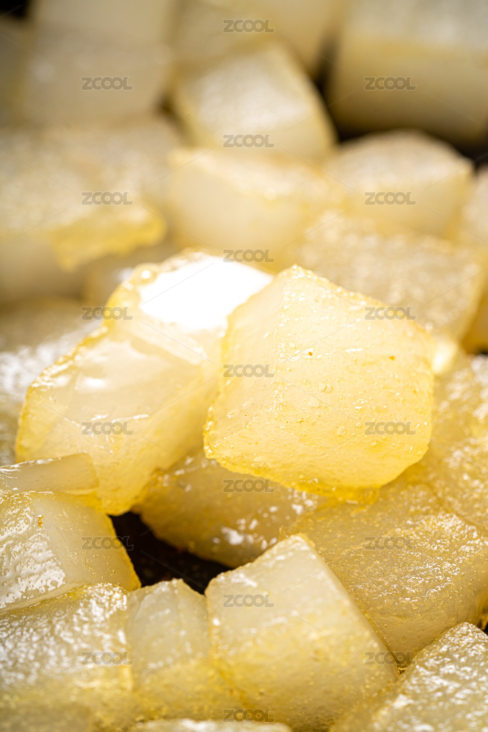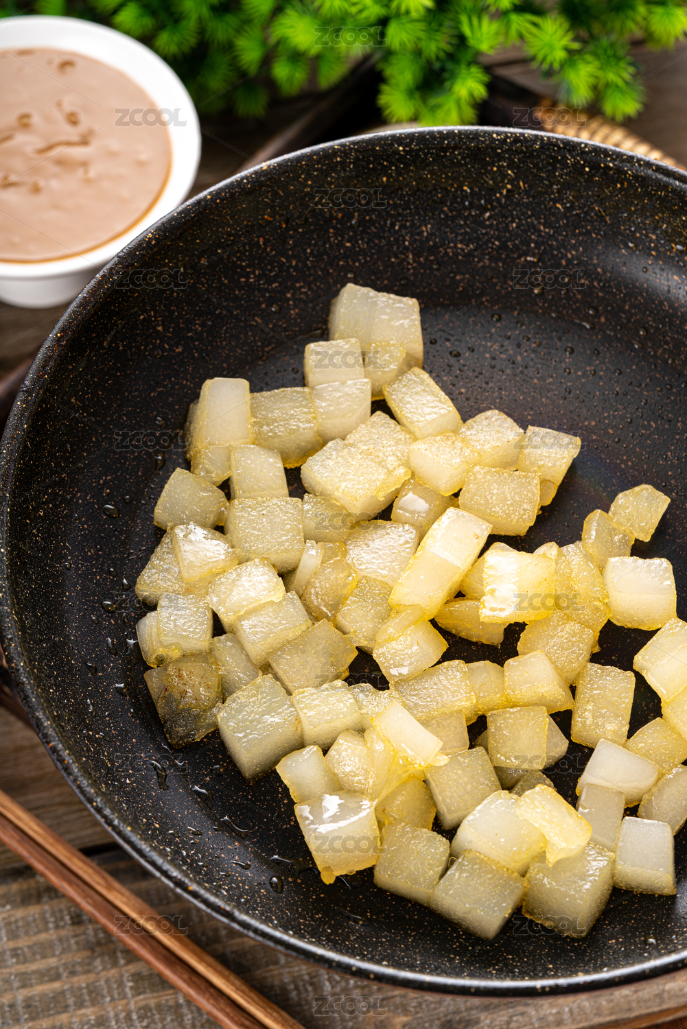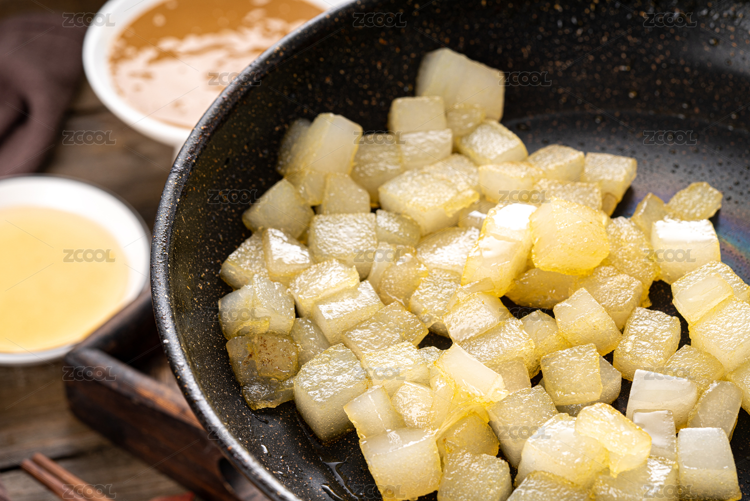 天津傳統(tǒng)小吃煎燜子特寫木桌面深色調(diào)