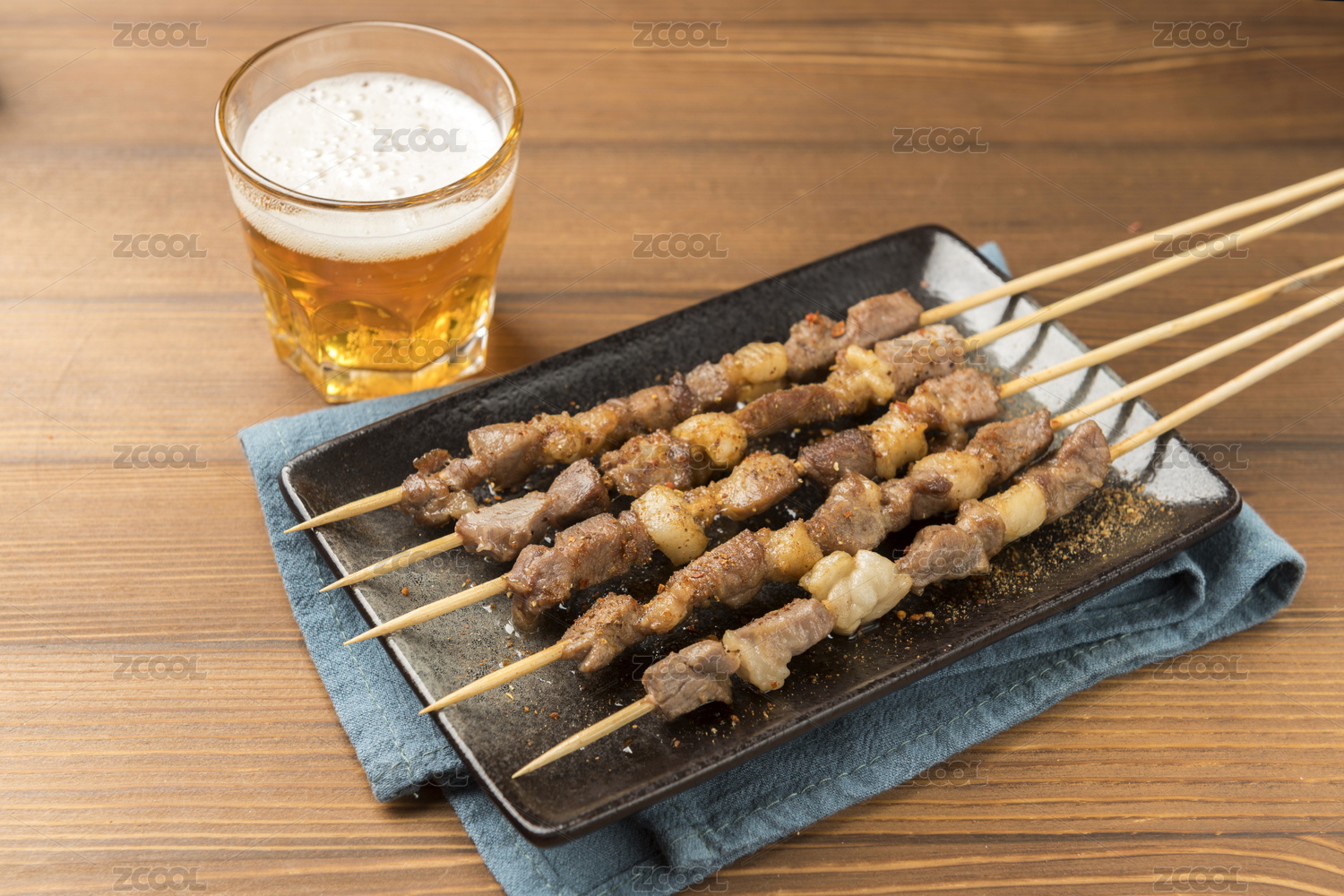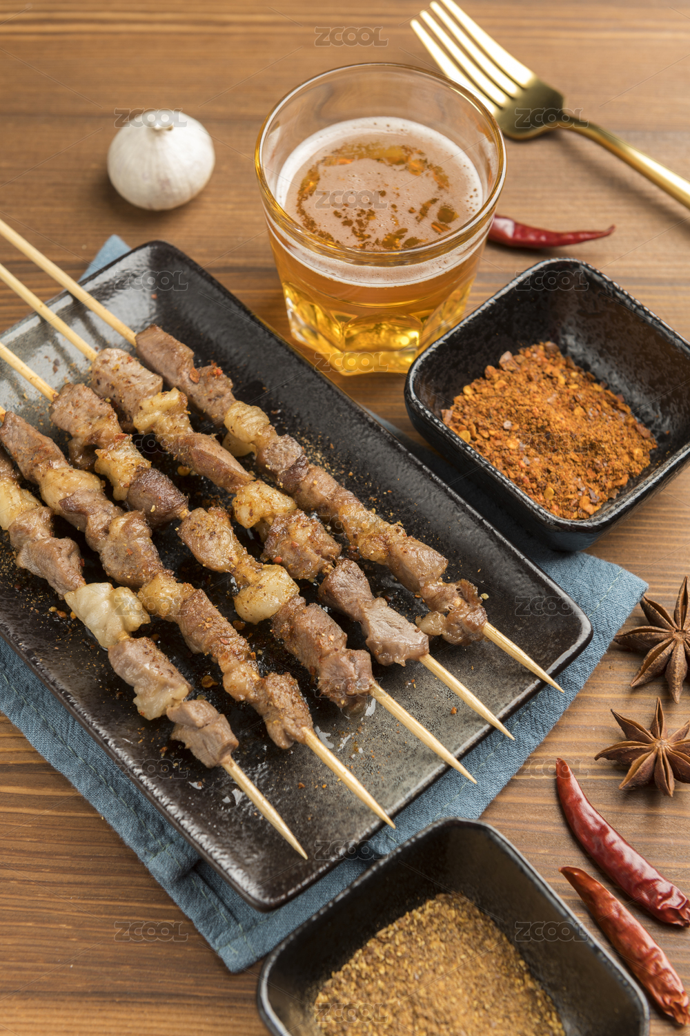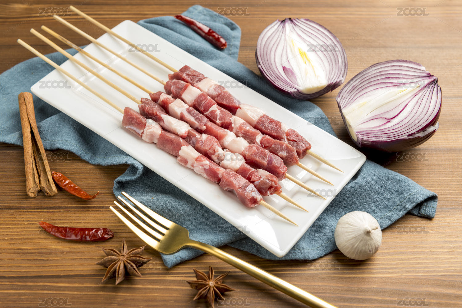 一盤烤羊肉串?dāng)[放在木桌面上特寫