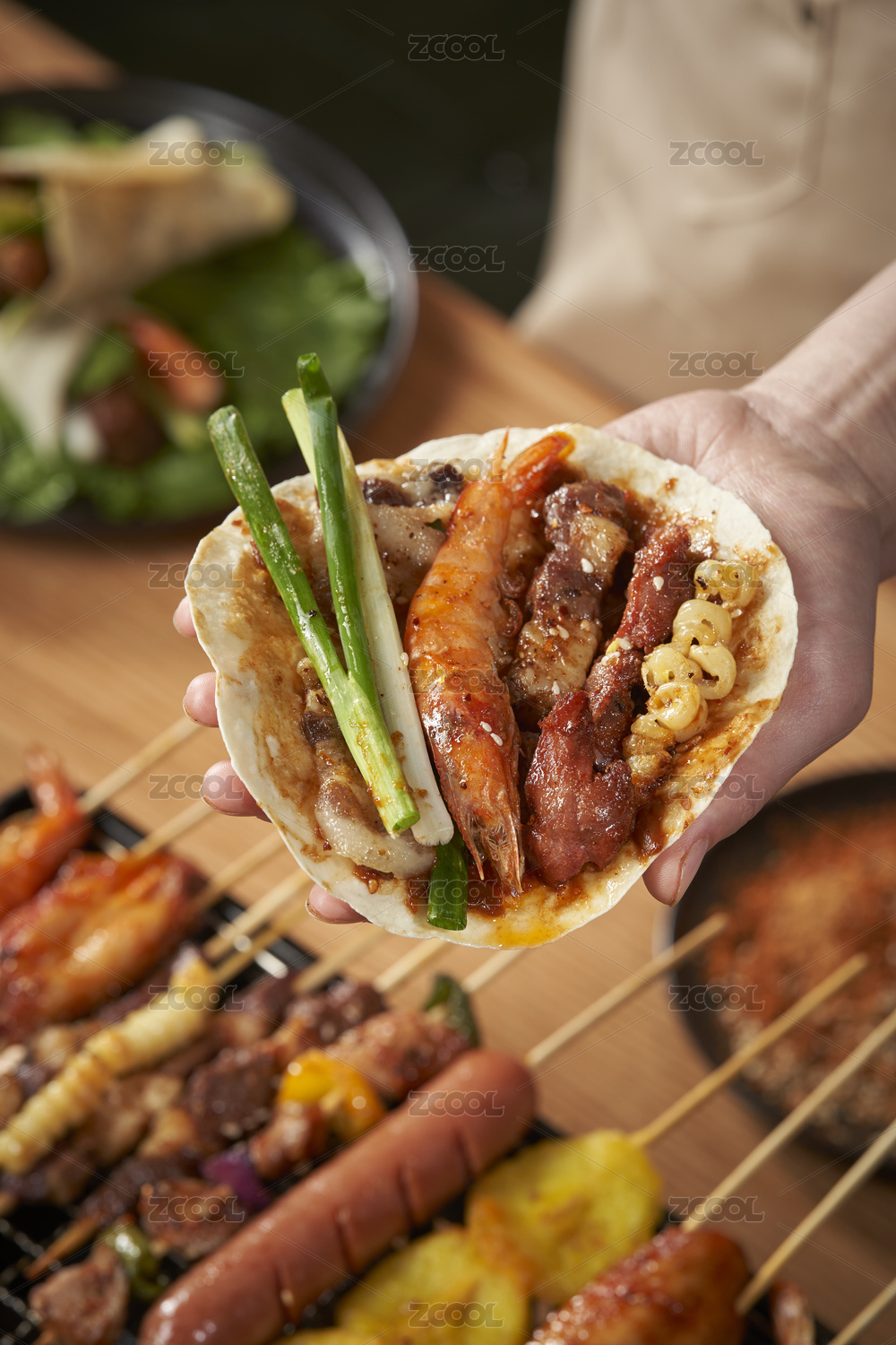 手拿著一個裝有羊肉串和洋蔥的卷餅
