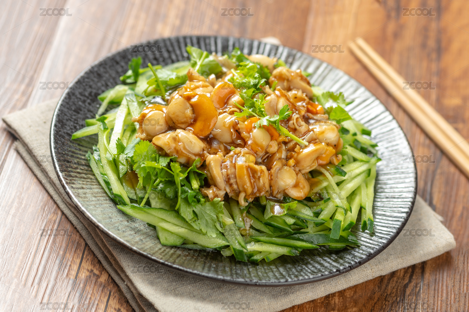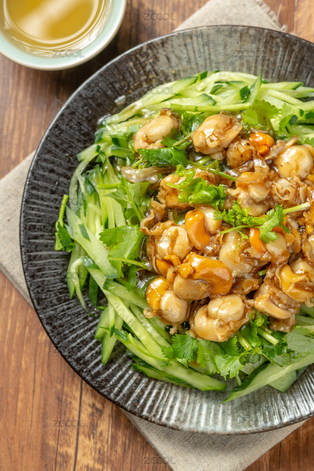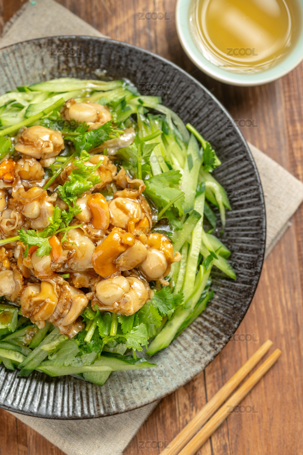 一盤溫拌全貝擺放在木桌面上