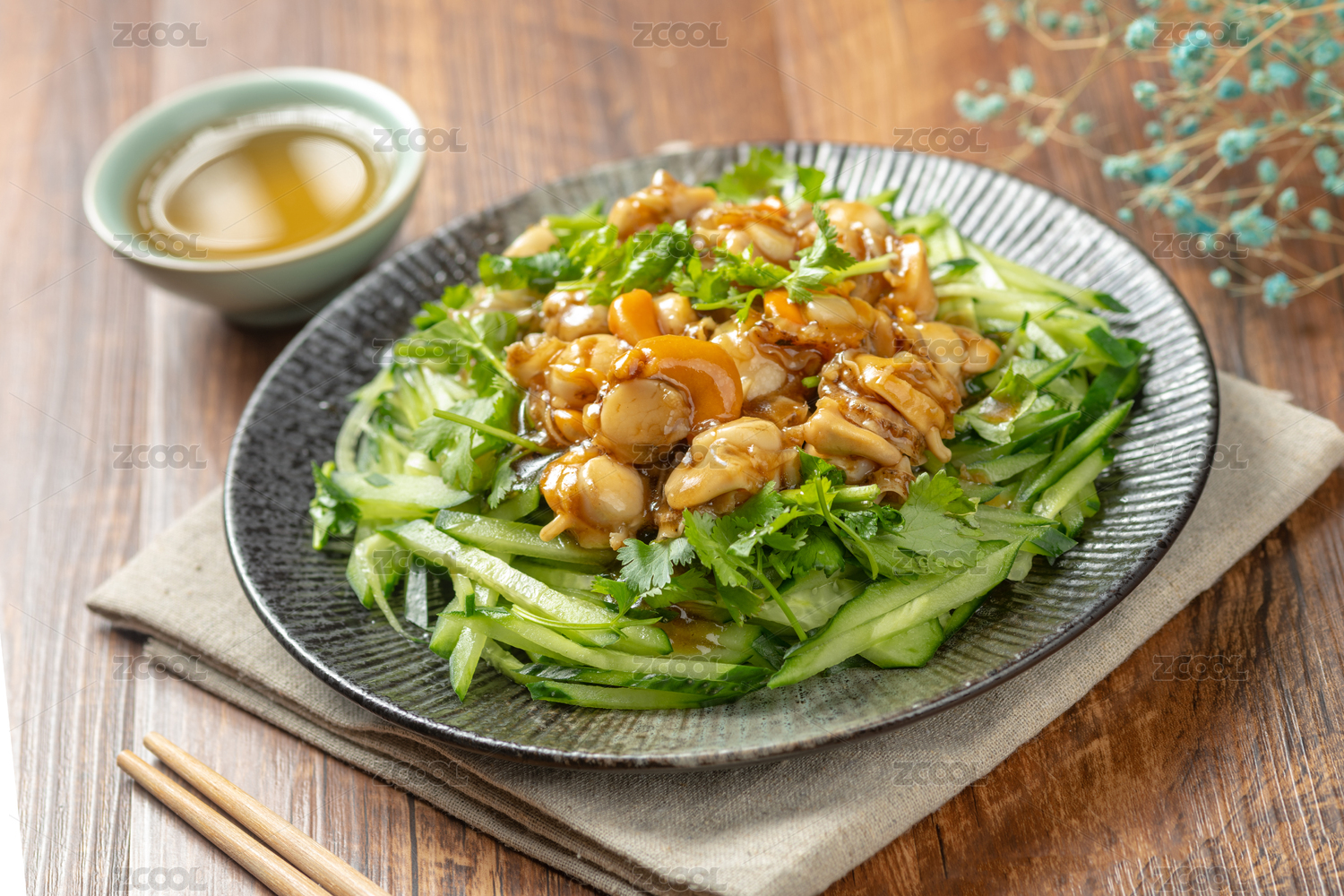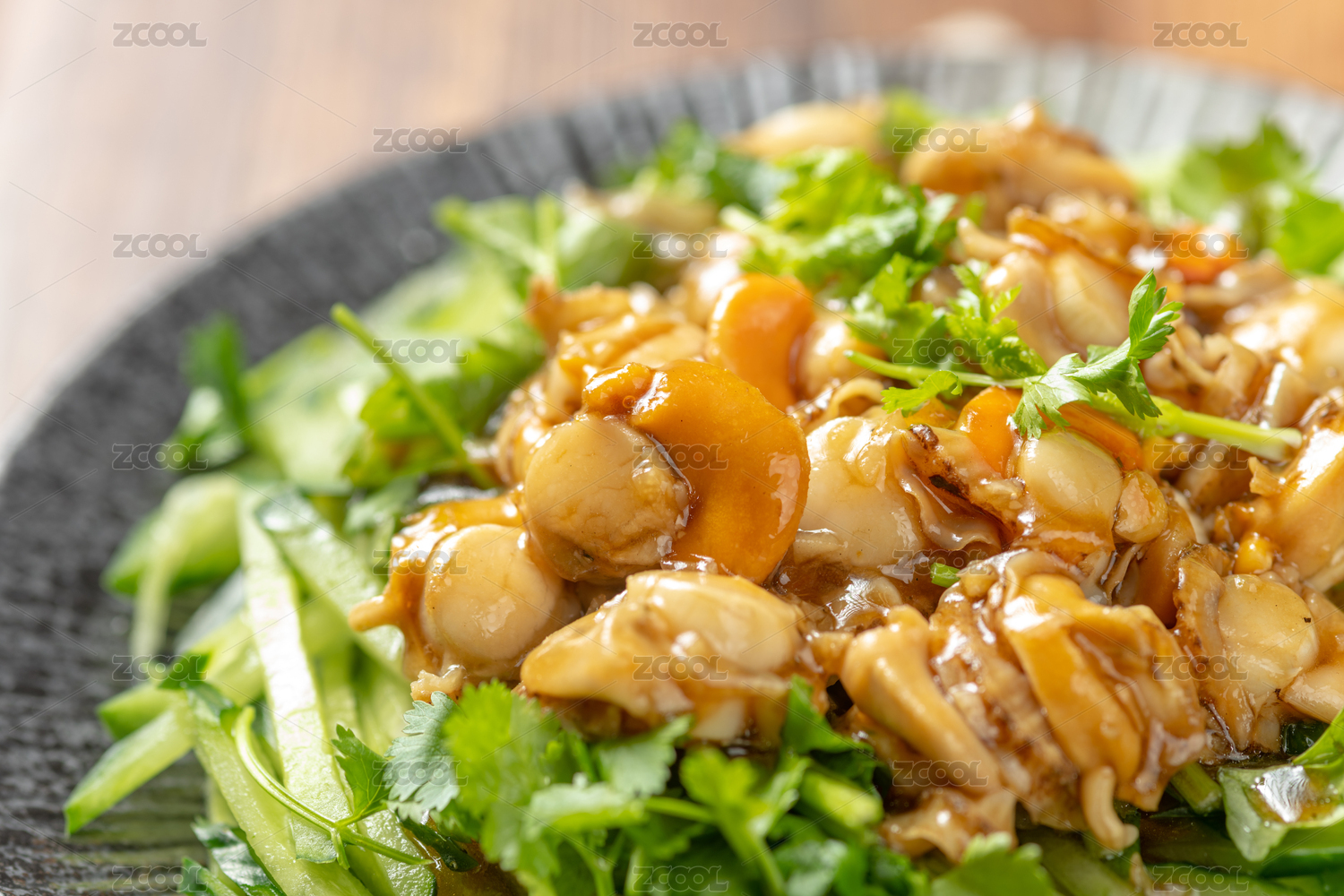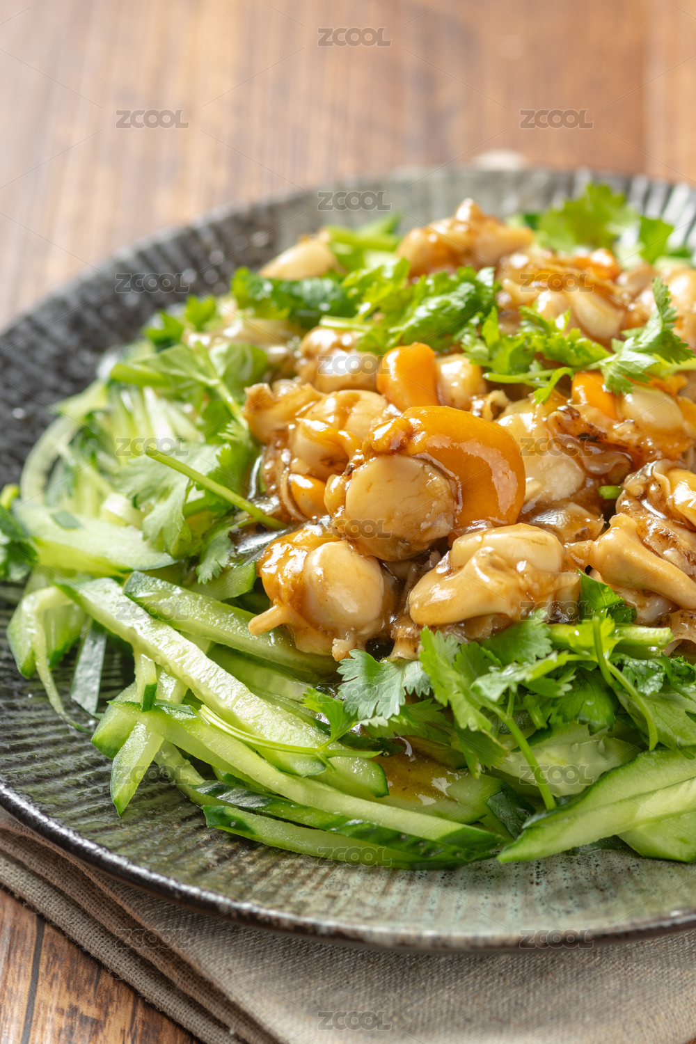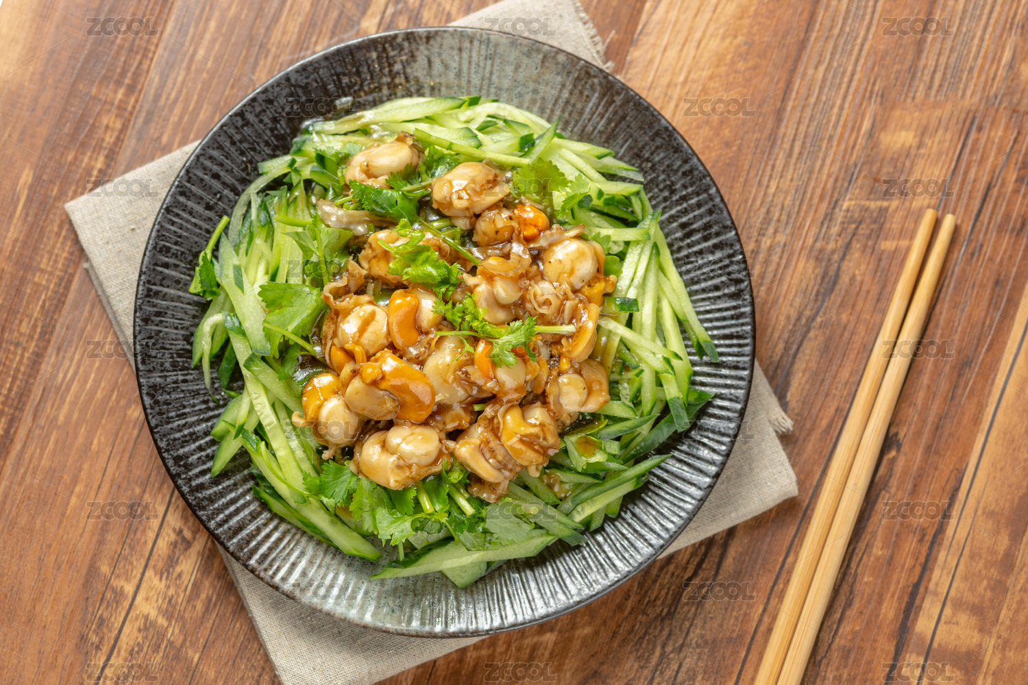 一盤溫拌全貝擺放在木桌面上