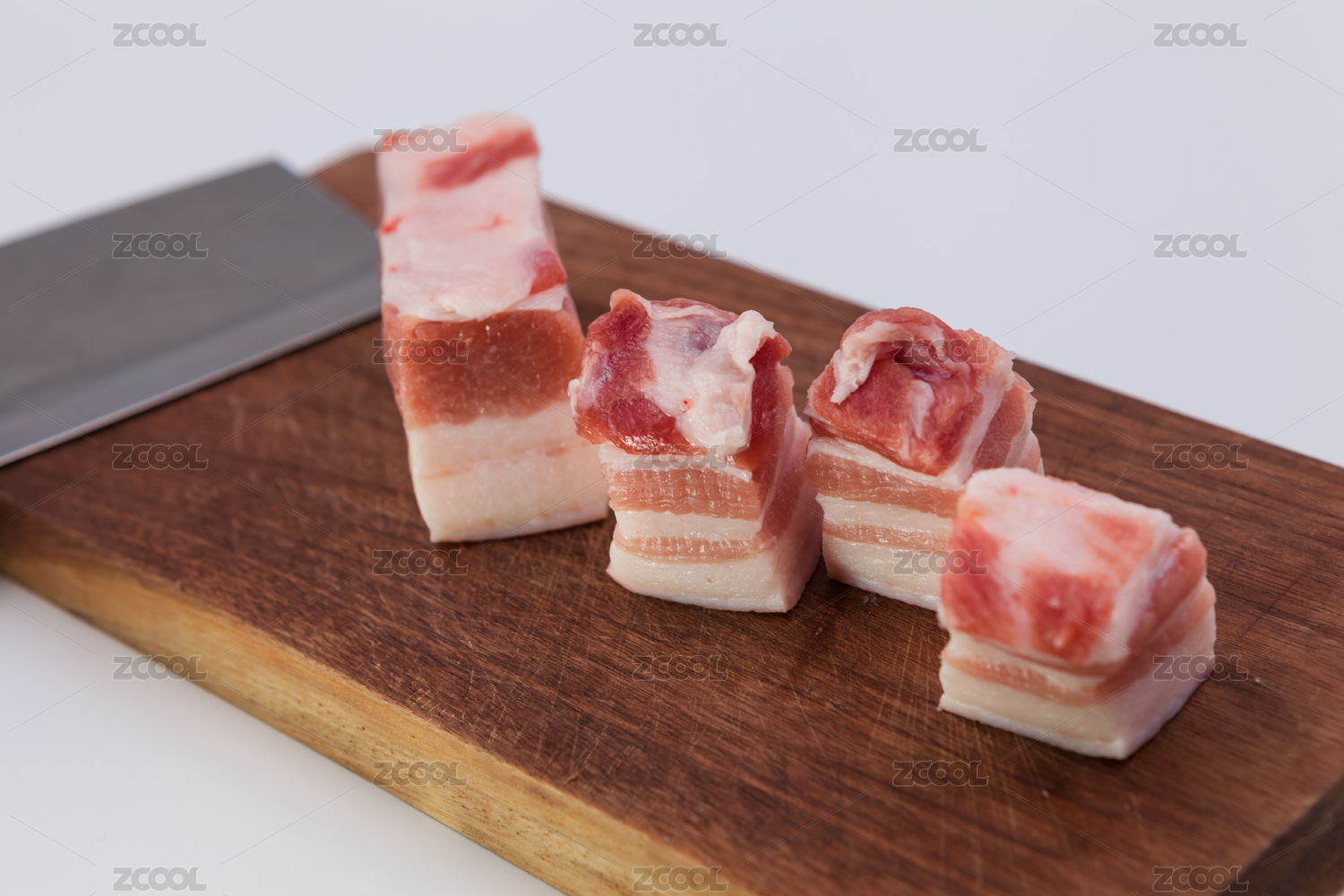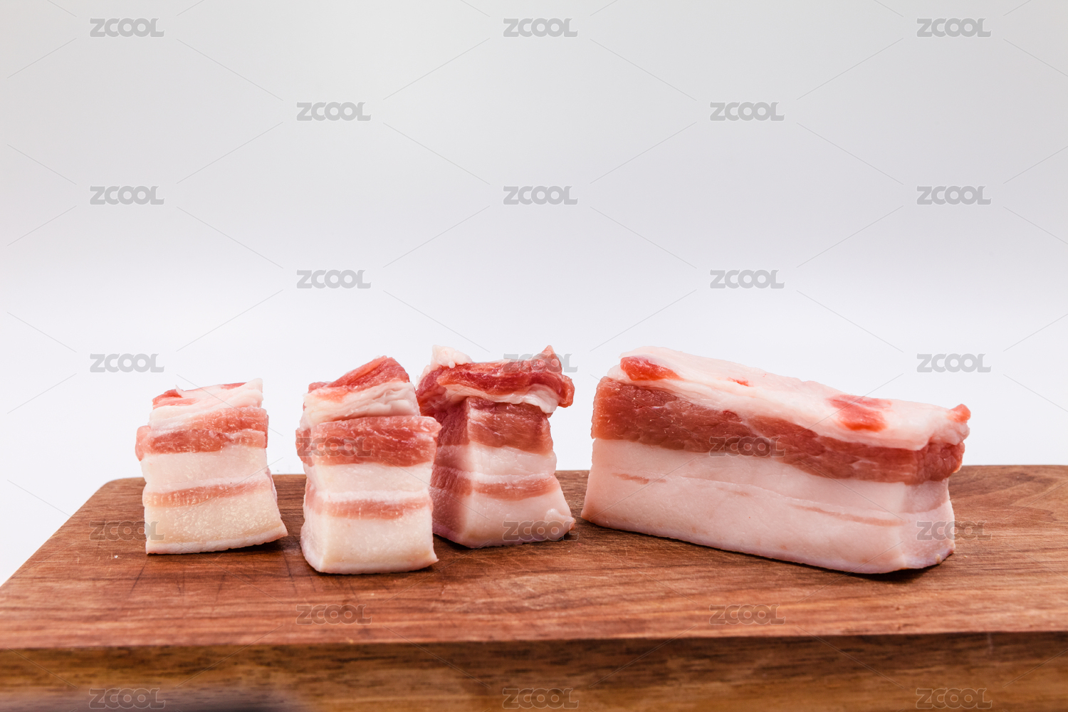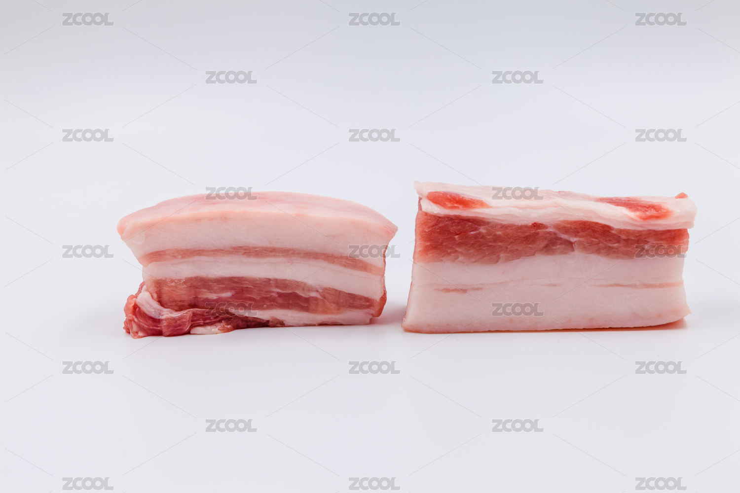 白色背景上餐盤(pán)中擺放的豬五花肉片