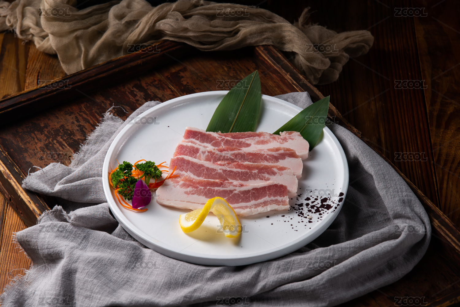 放在盤(pán)子里的二尺豬五花肉