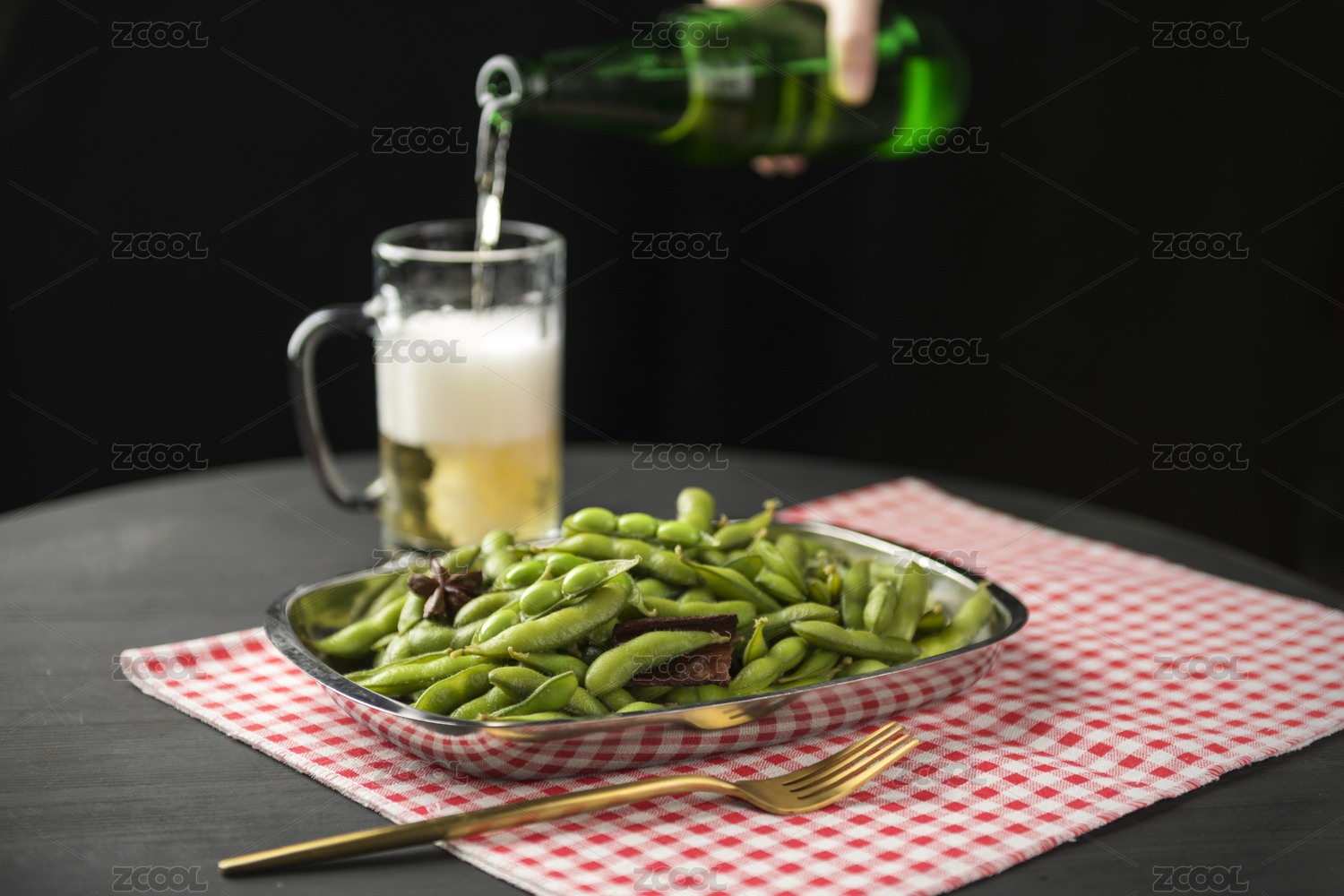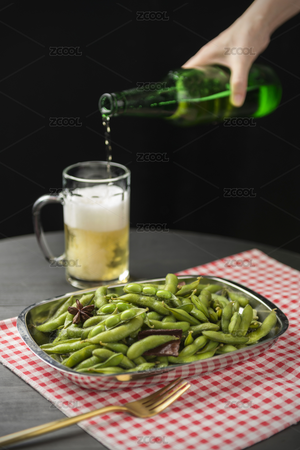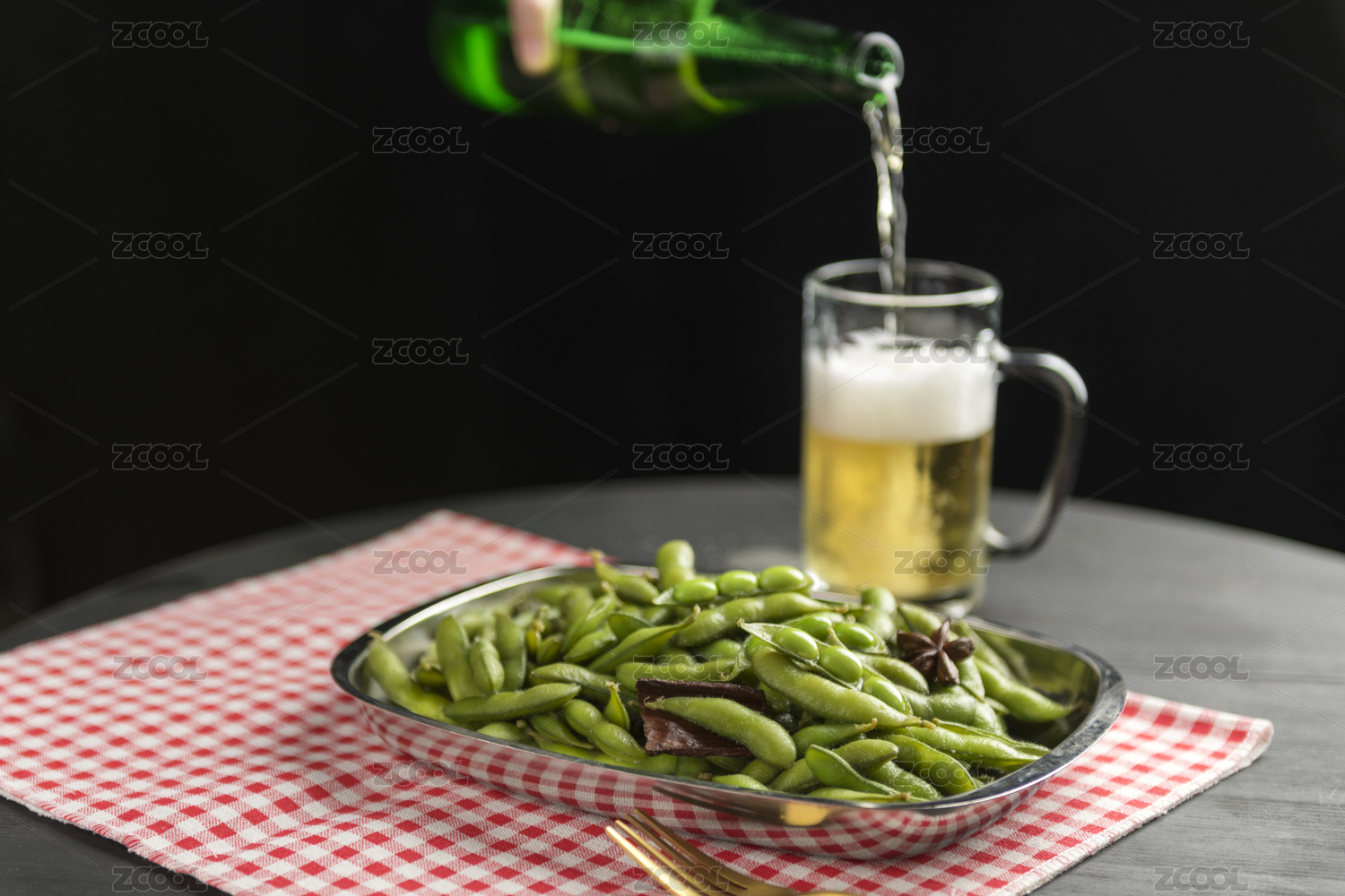 煮毛豆角和啤酒擺放在桌面上特寫