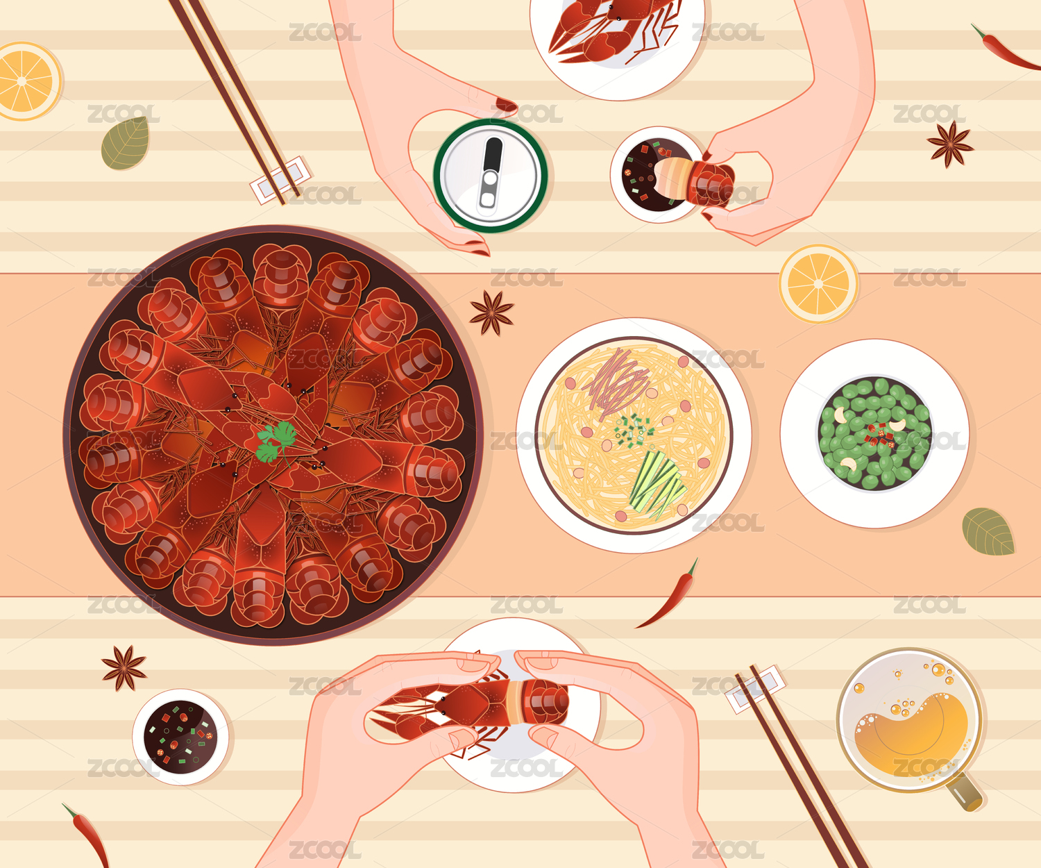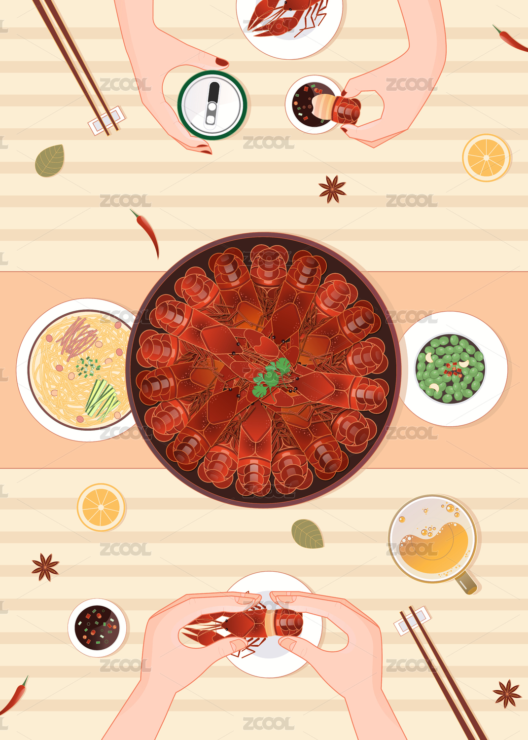 二人吃龍蝦喝啤酒俯視矢量插畫橫版