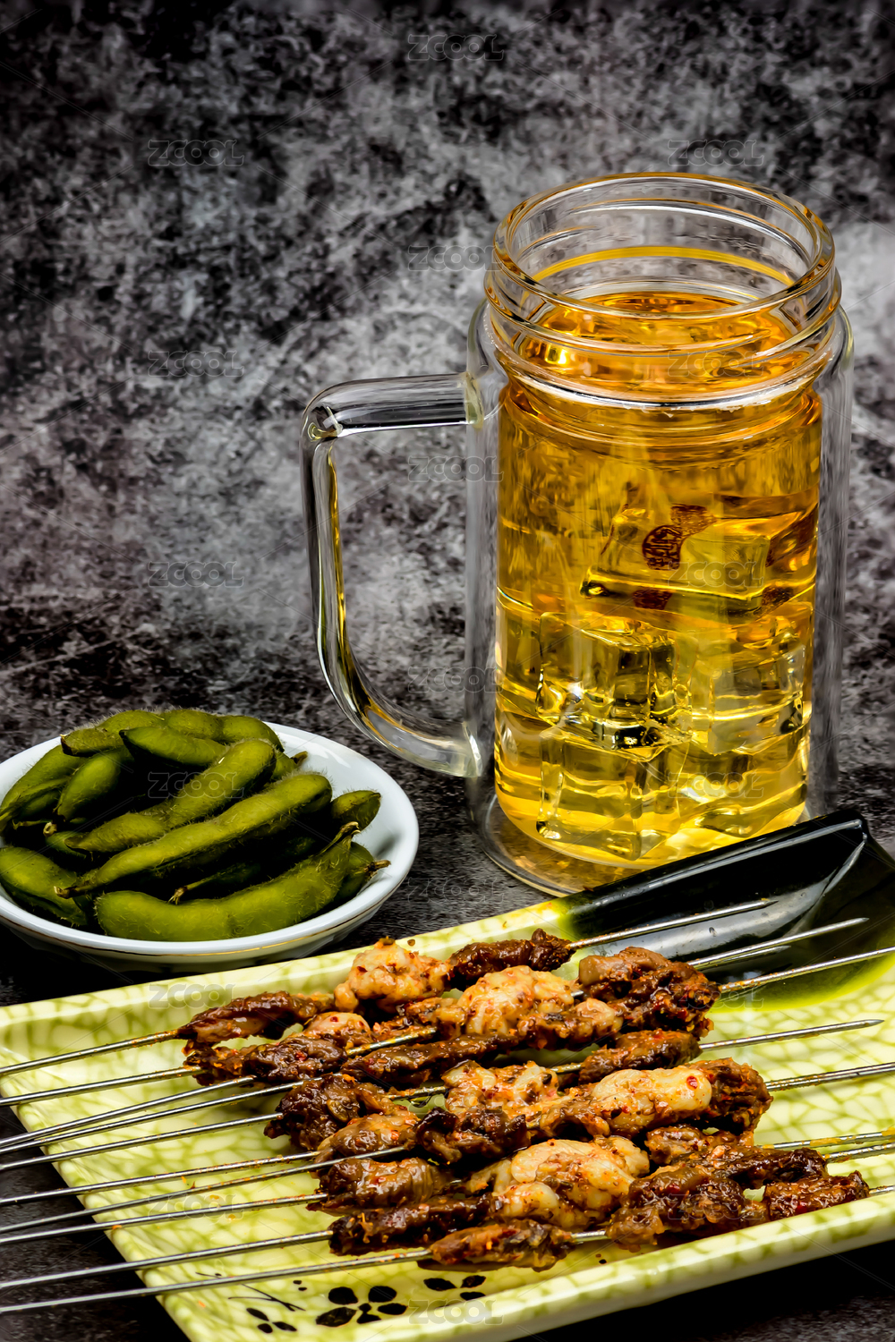 冰鎮(zhèn)啤酒、烤肉串和熟毛豆