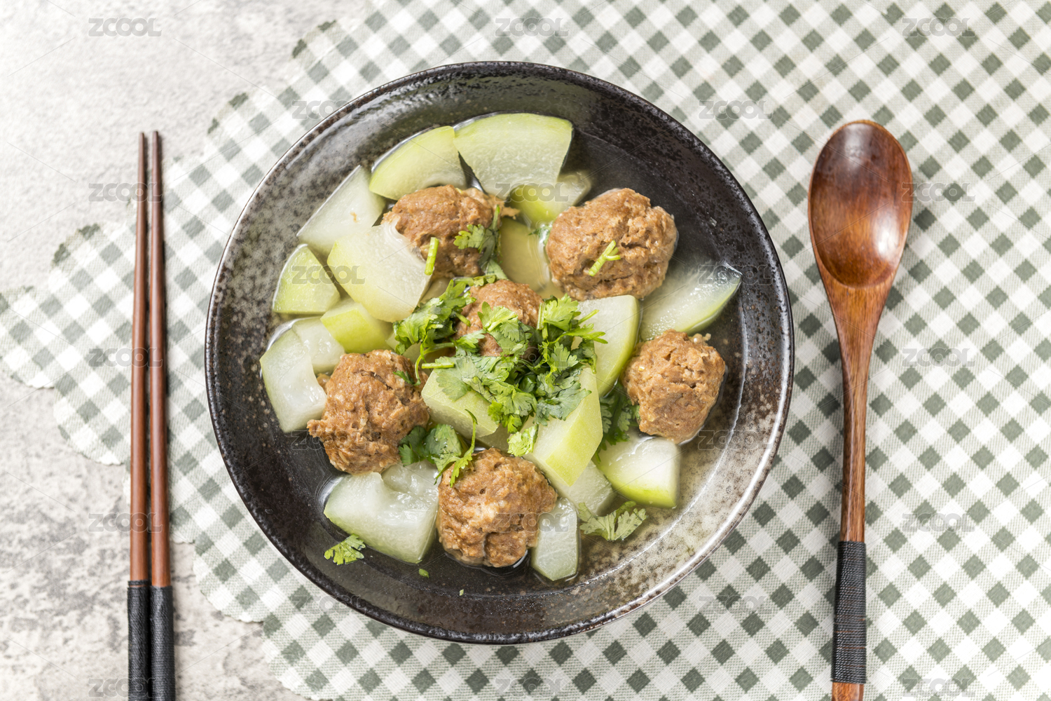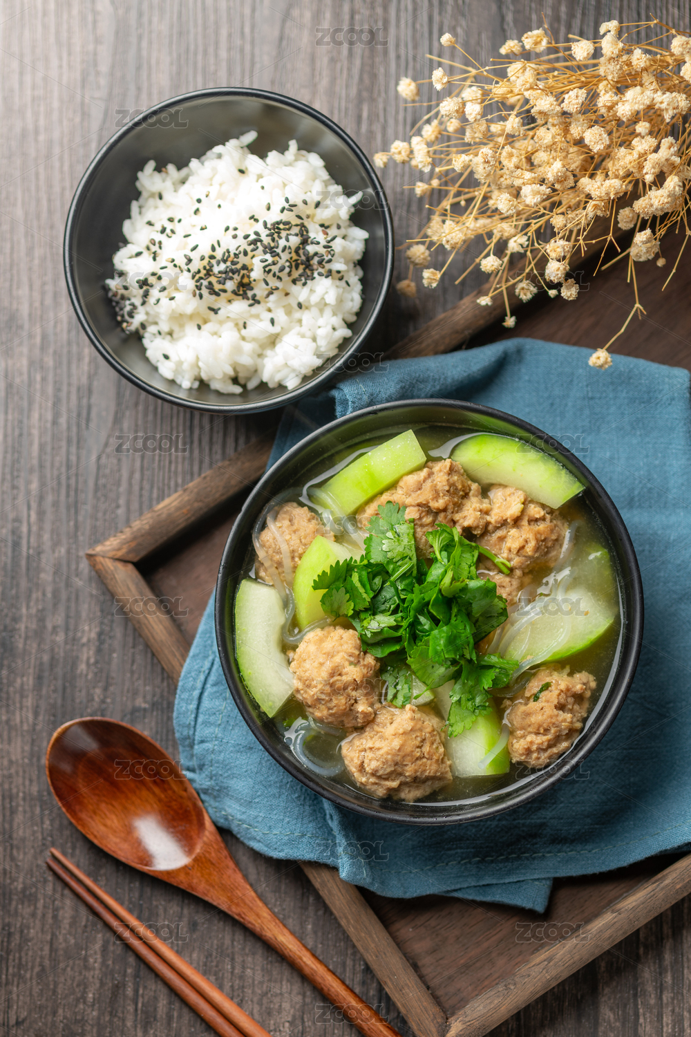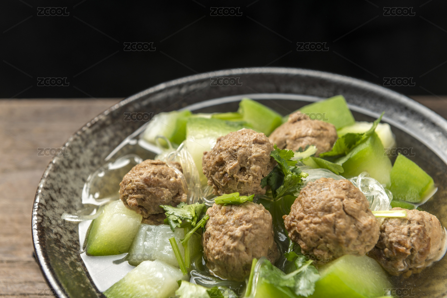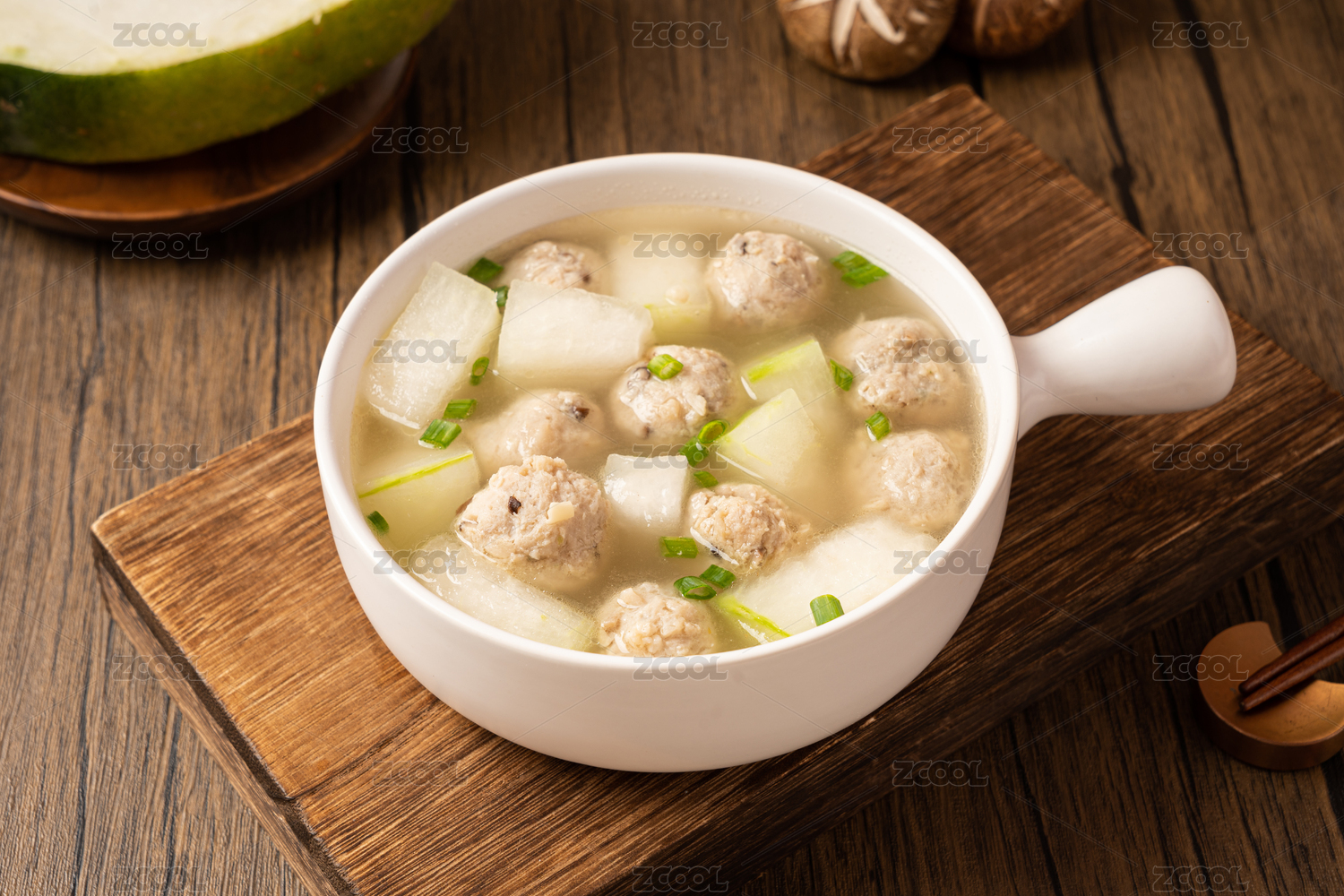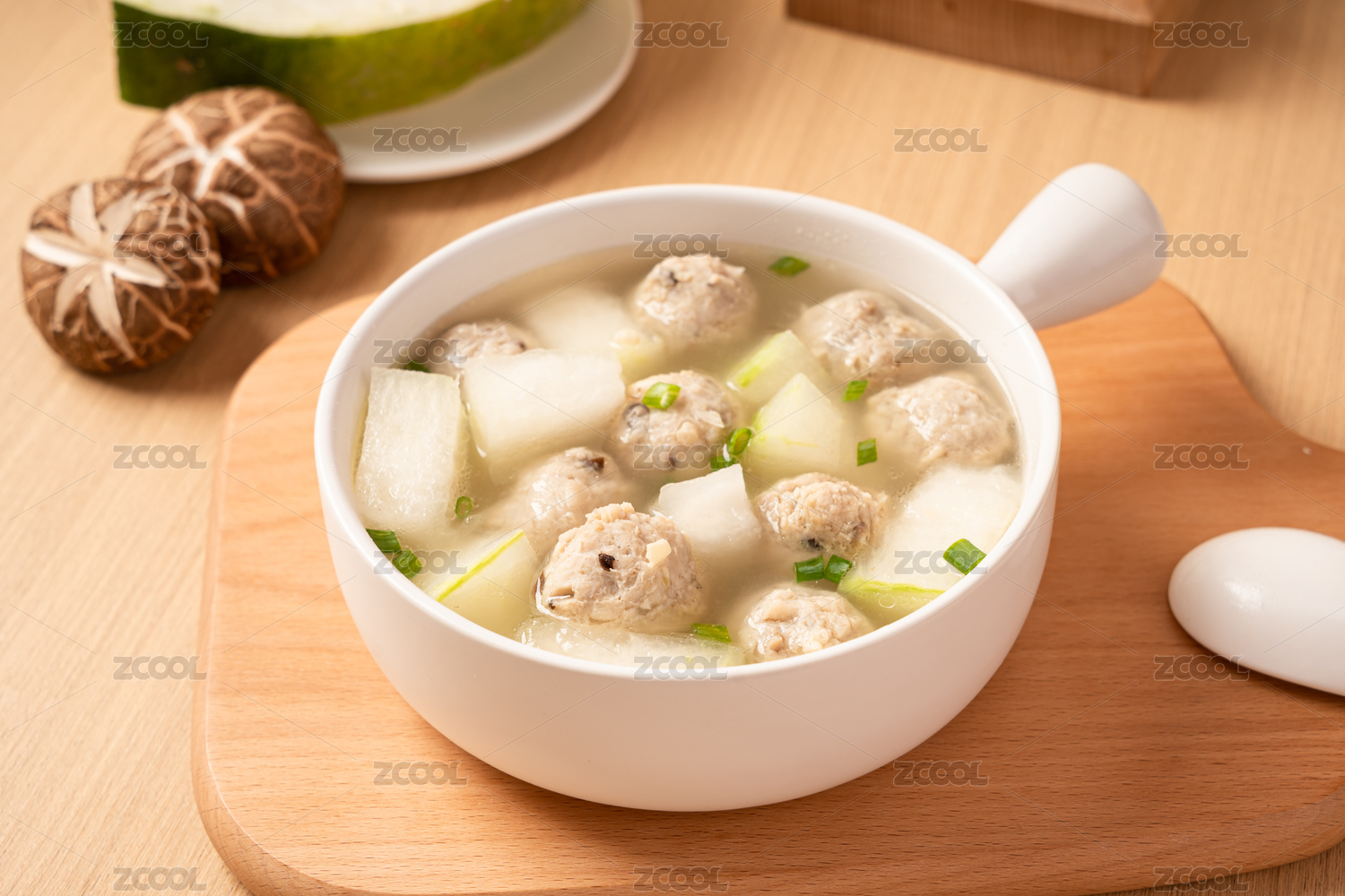 家常菜冬瓜丸子湯擺放在木桌面上特寫