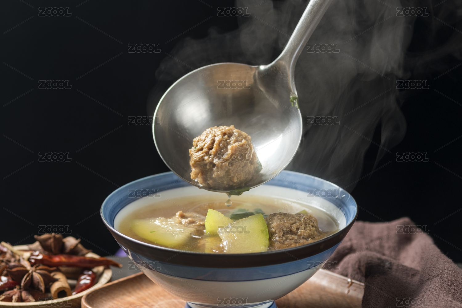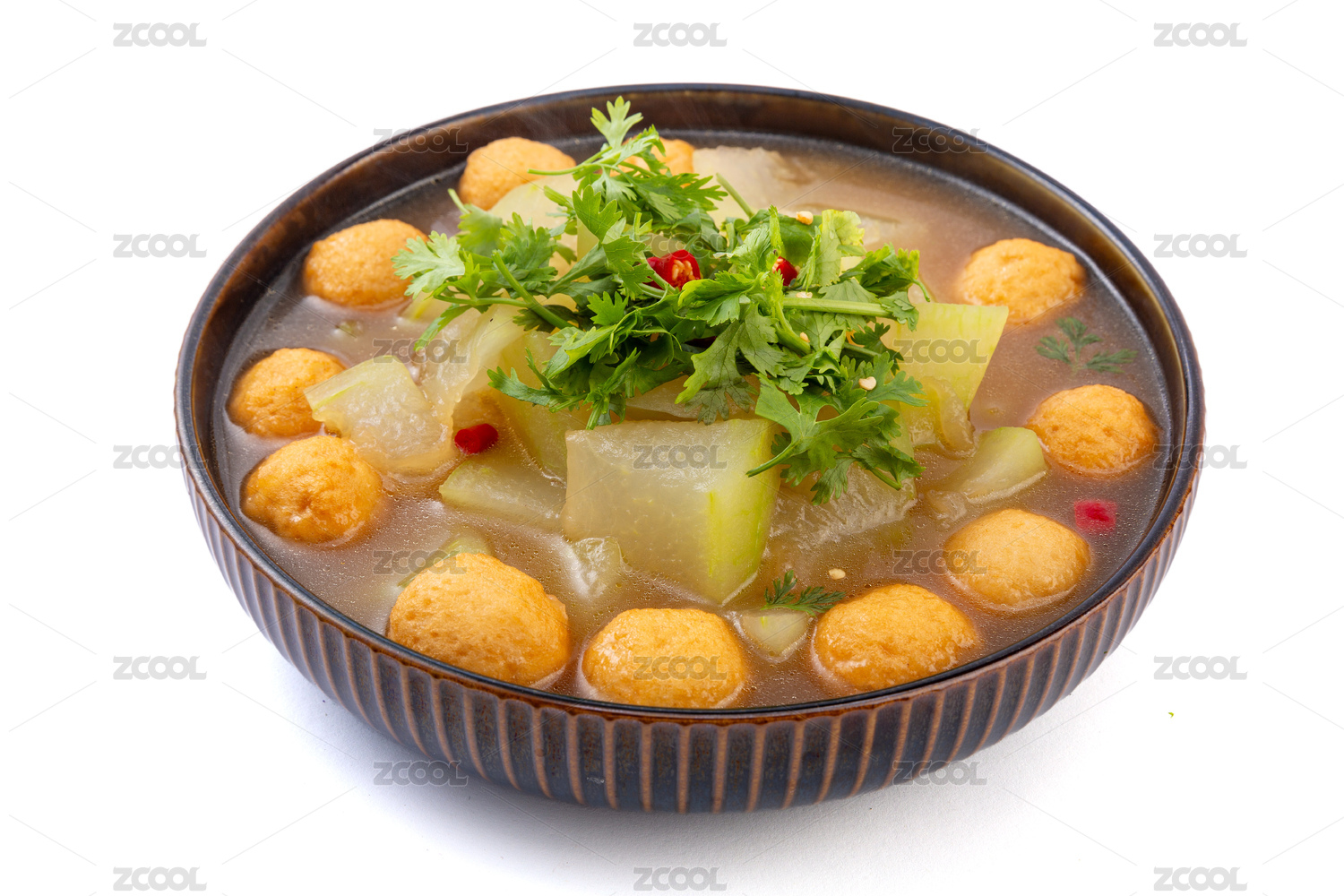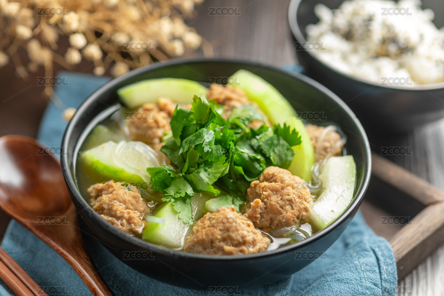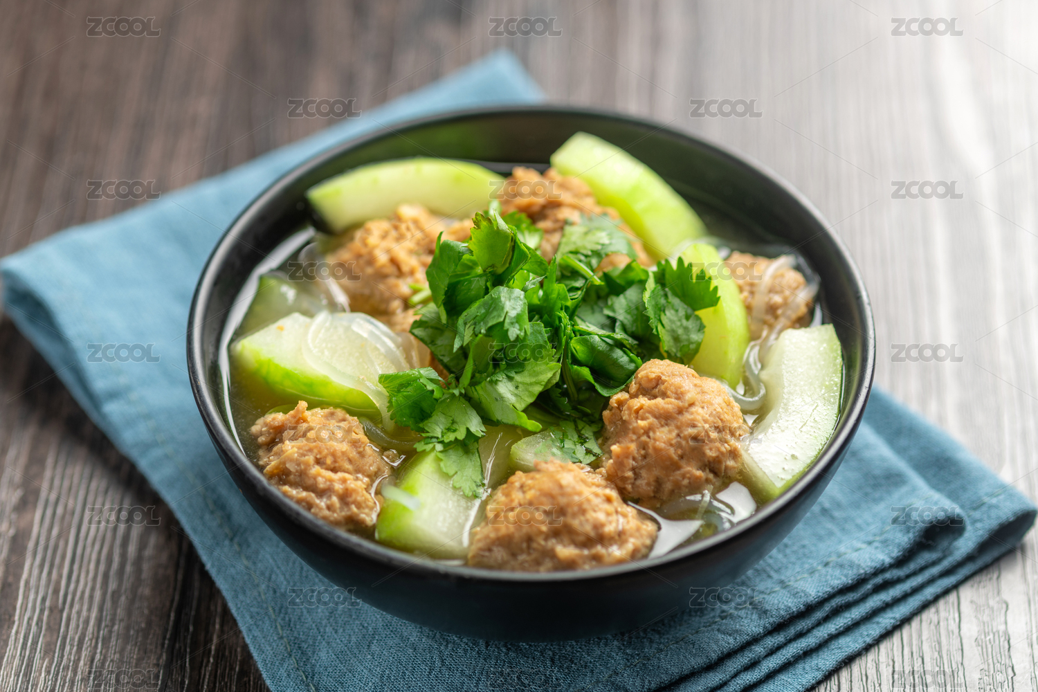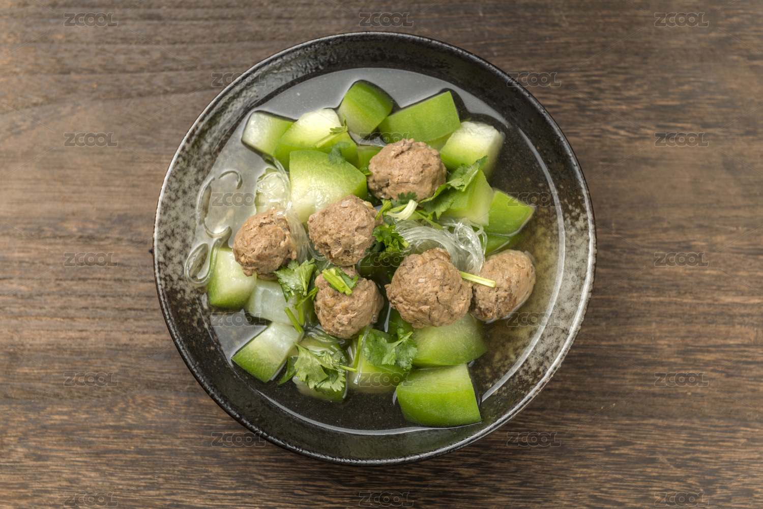 家常菜冬瓜丸子湯擺放在木桌面上特寫