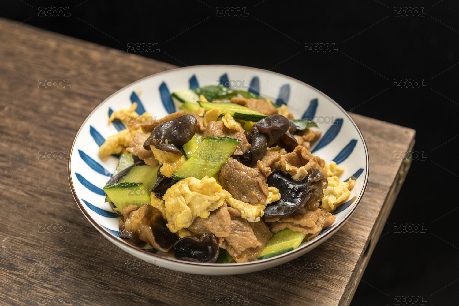 一盤傳統(tǒng)家常菜木須肉擺放在木桌面上
