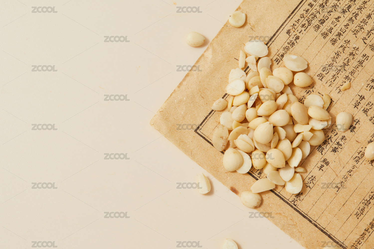 黃色背景古書上的中藥材桃仁