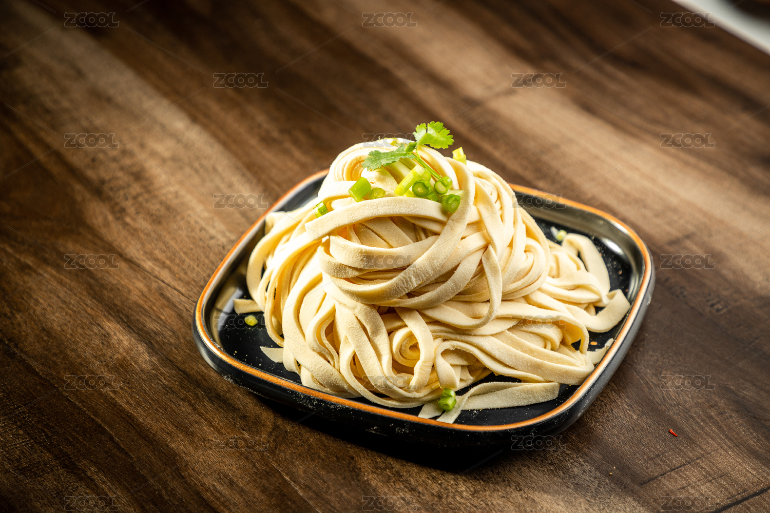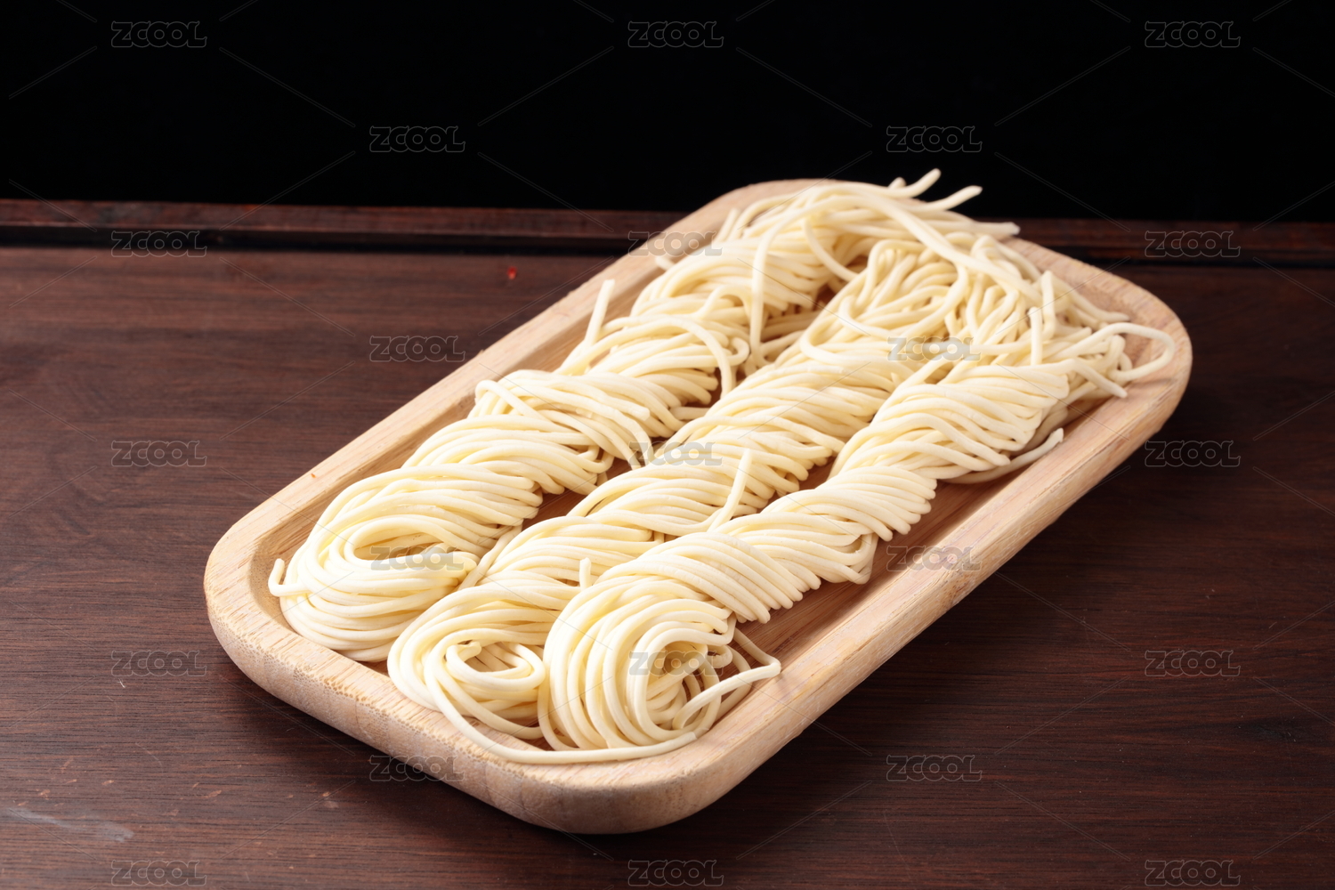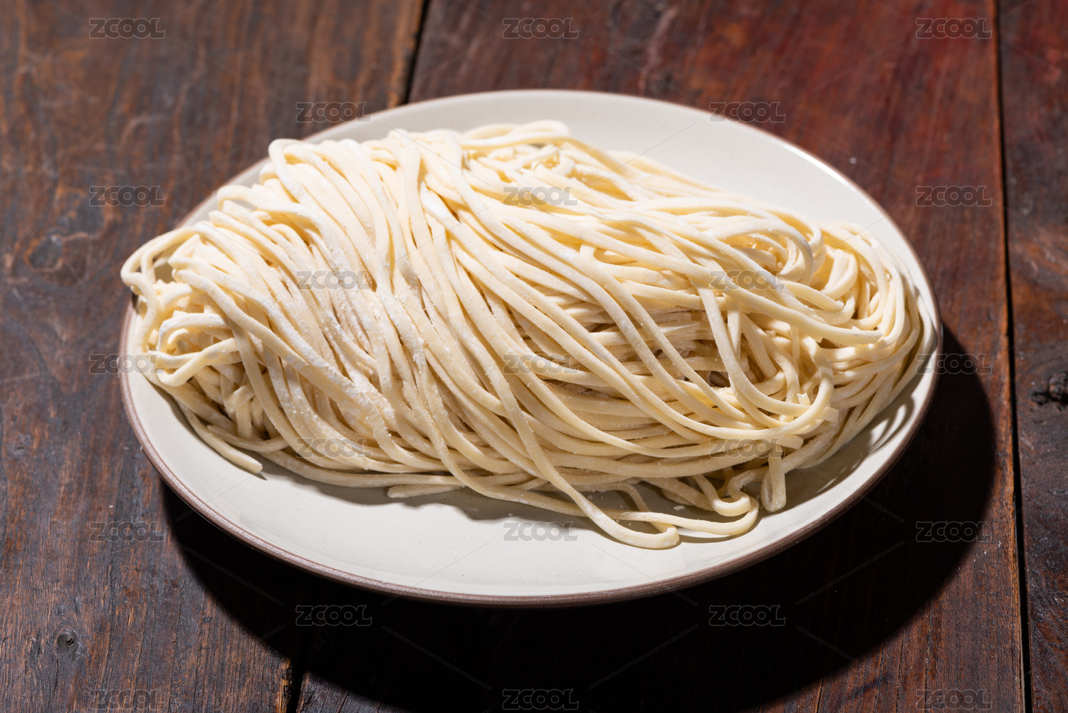 一盤生面條擺放在桌面上特寫