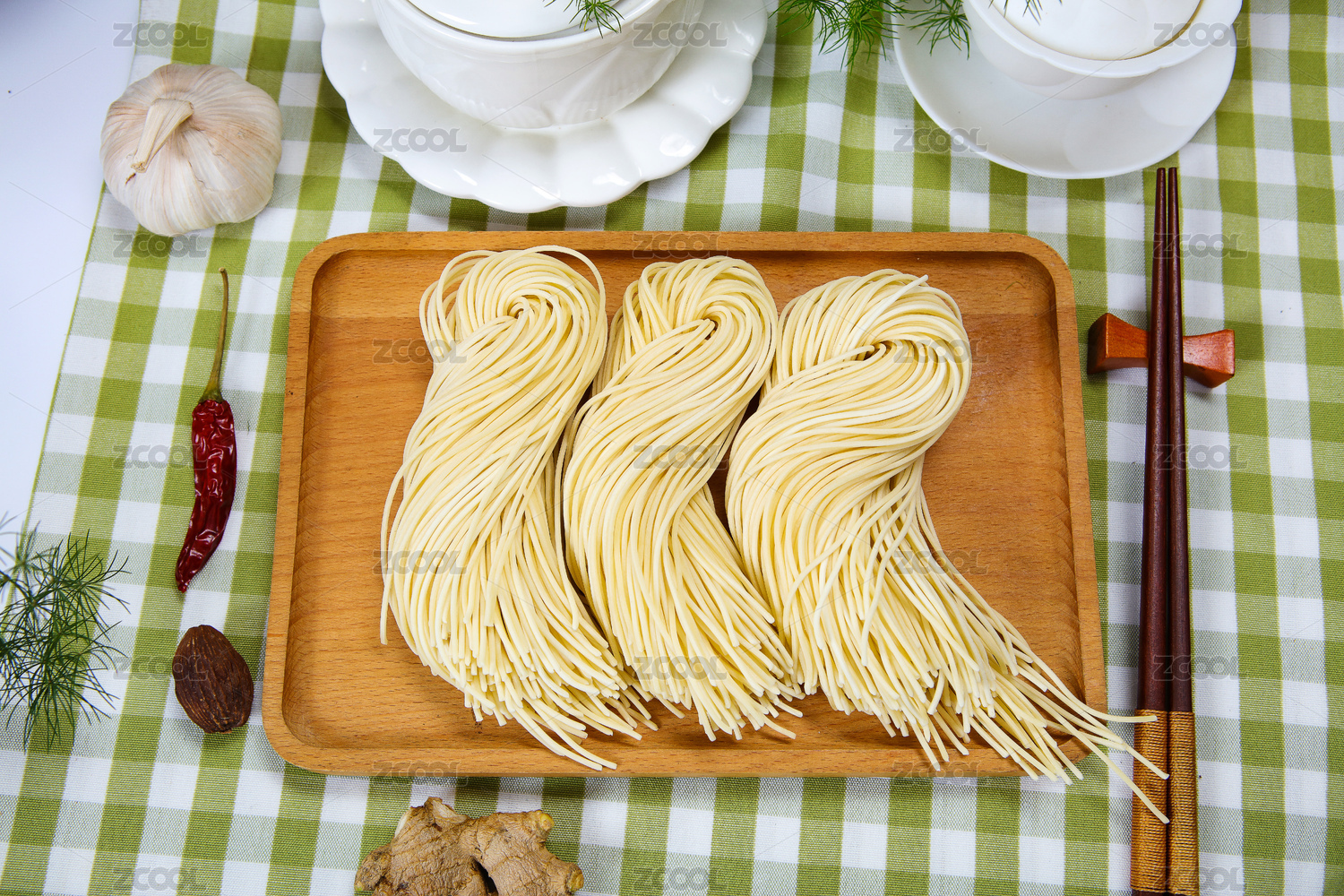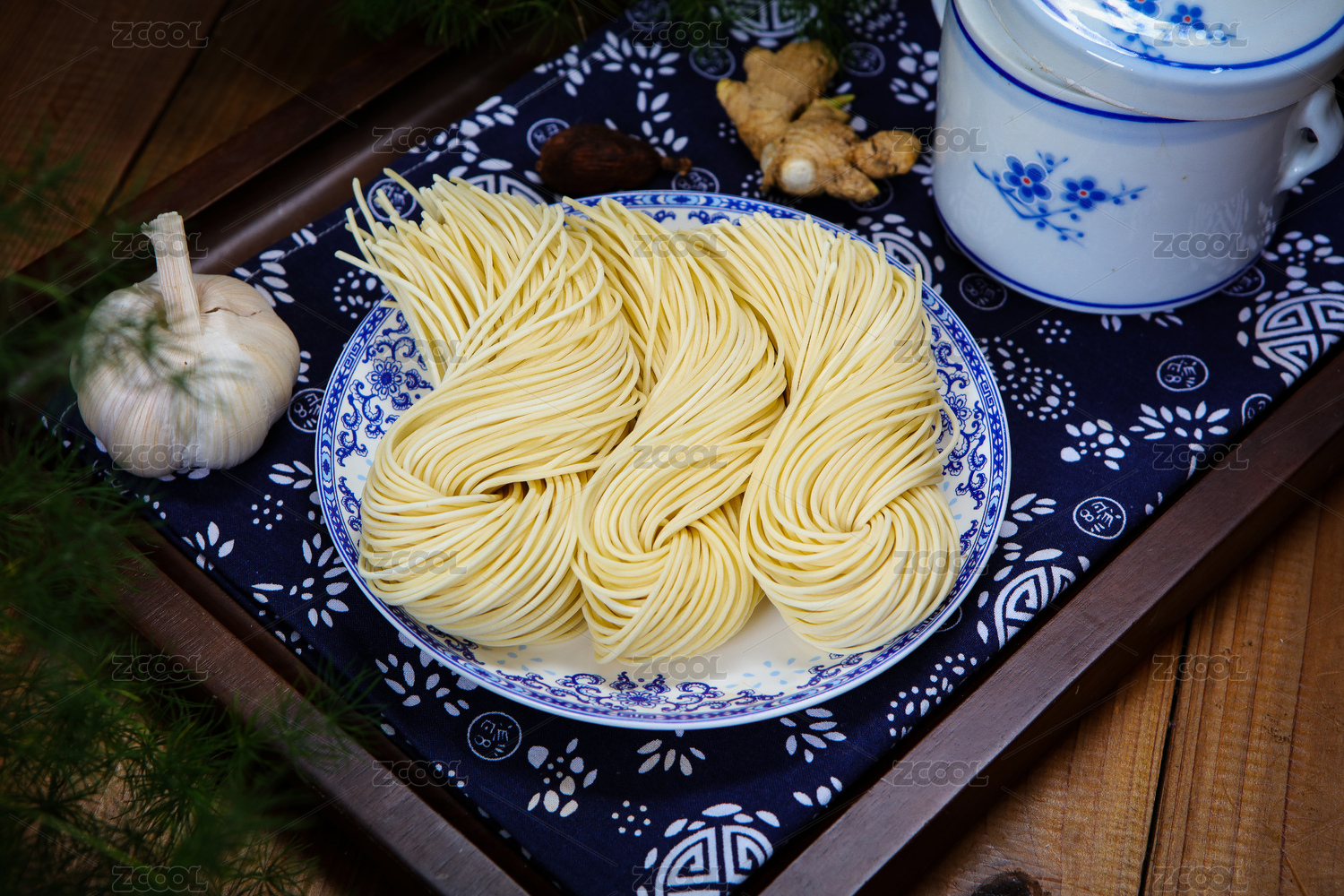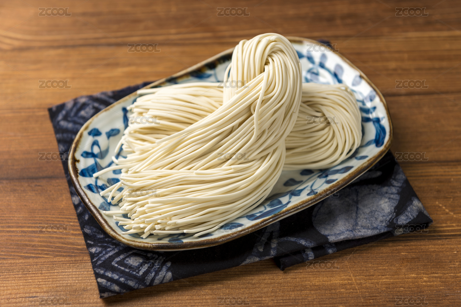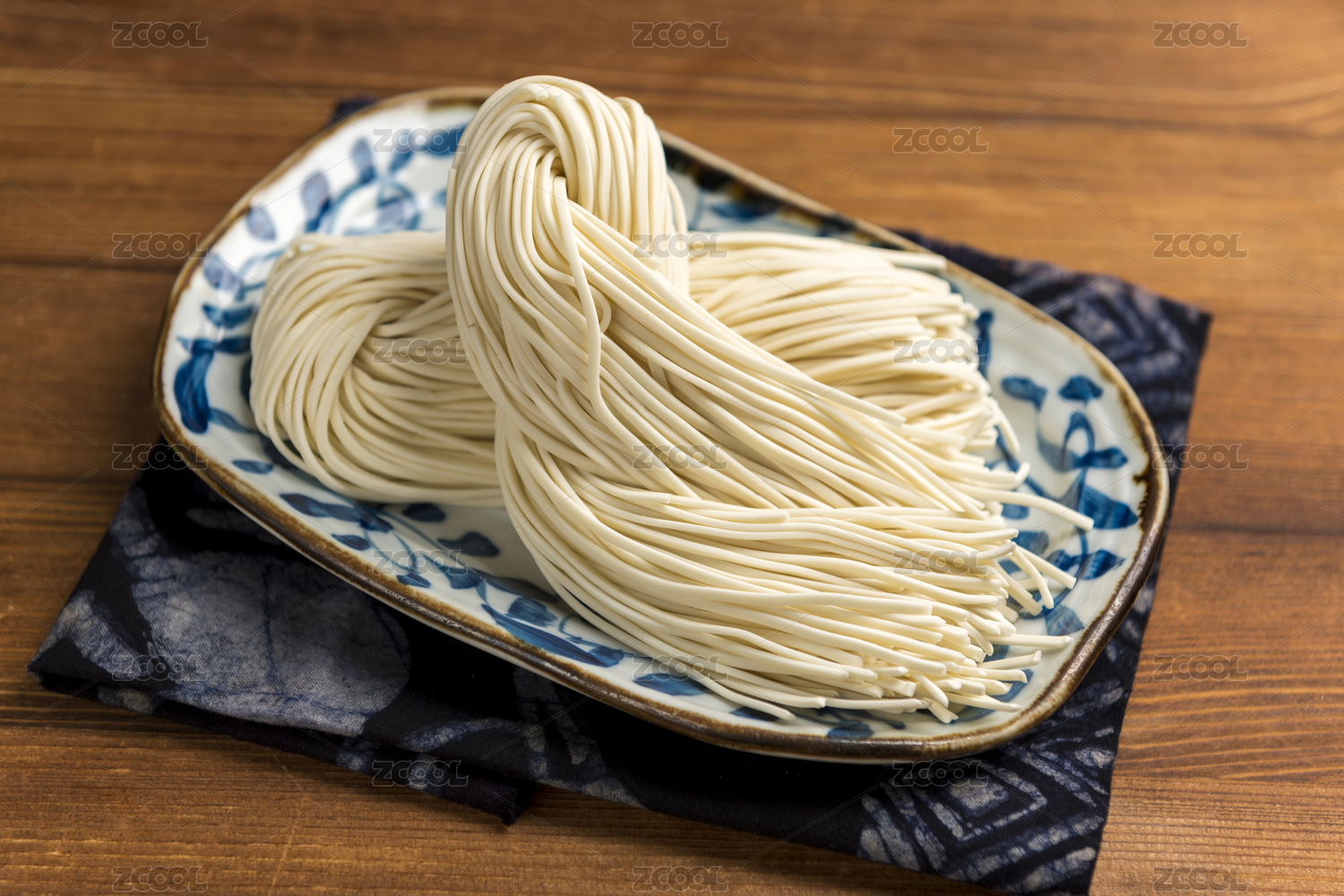 一盤生面條擺放在桌面上特寫