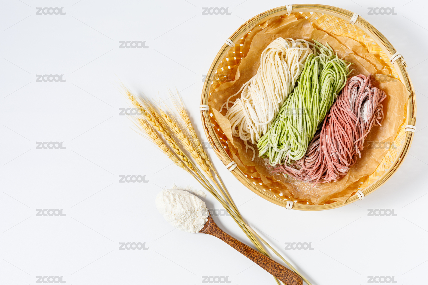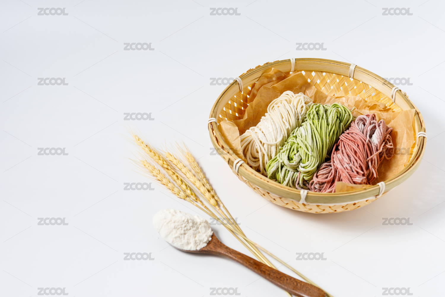 白色背景上放在竹籃里的三種顏色生面條