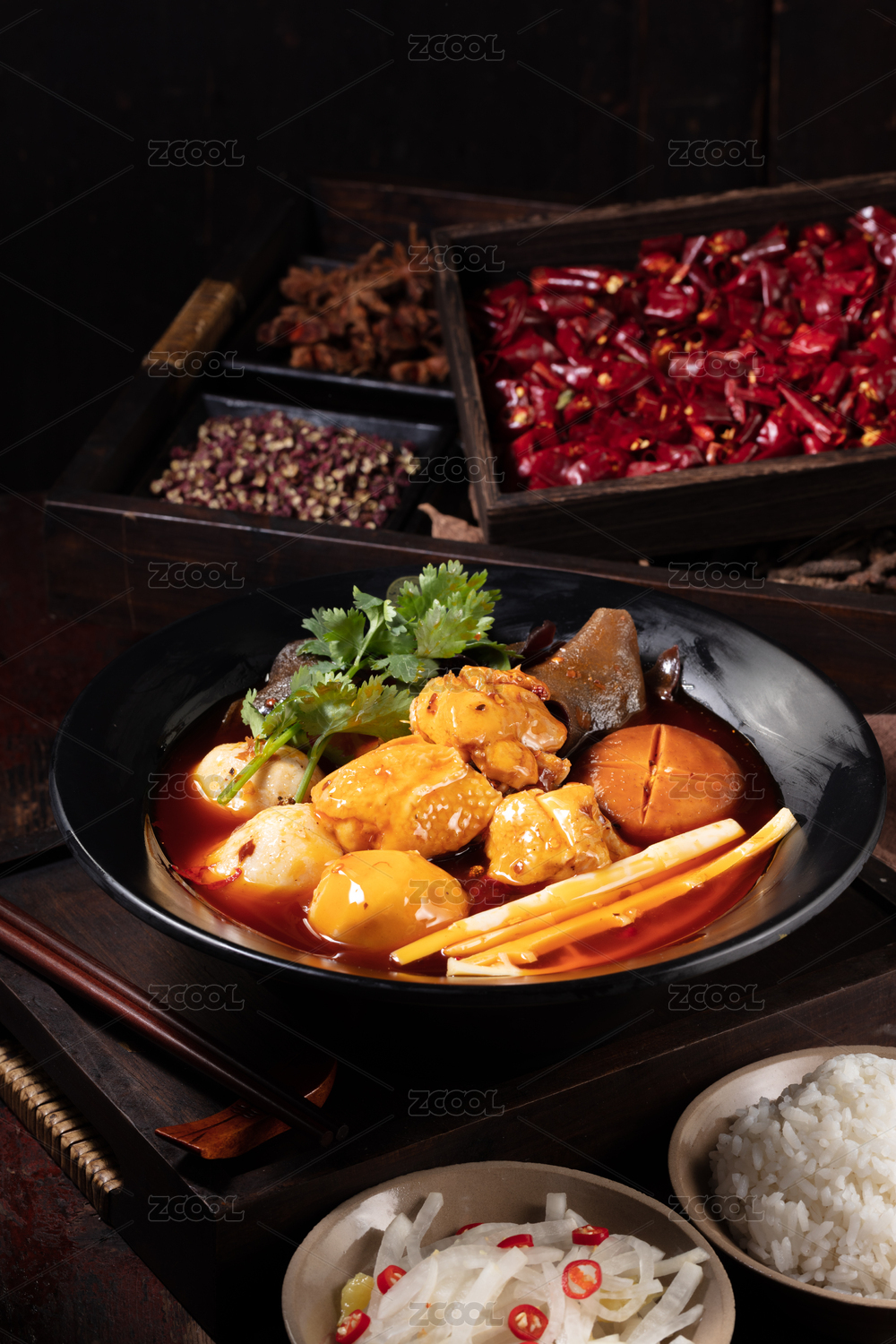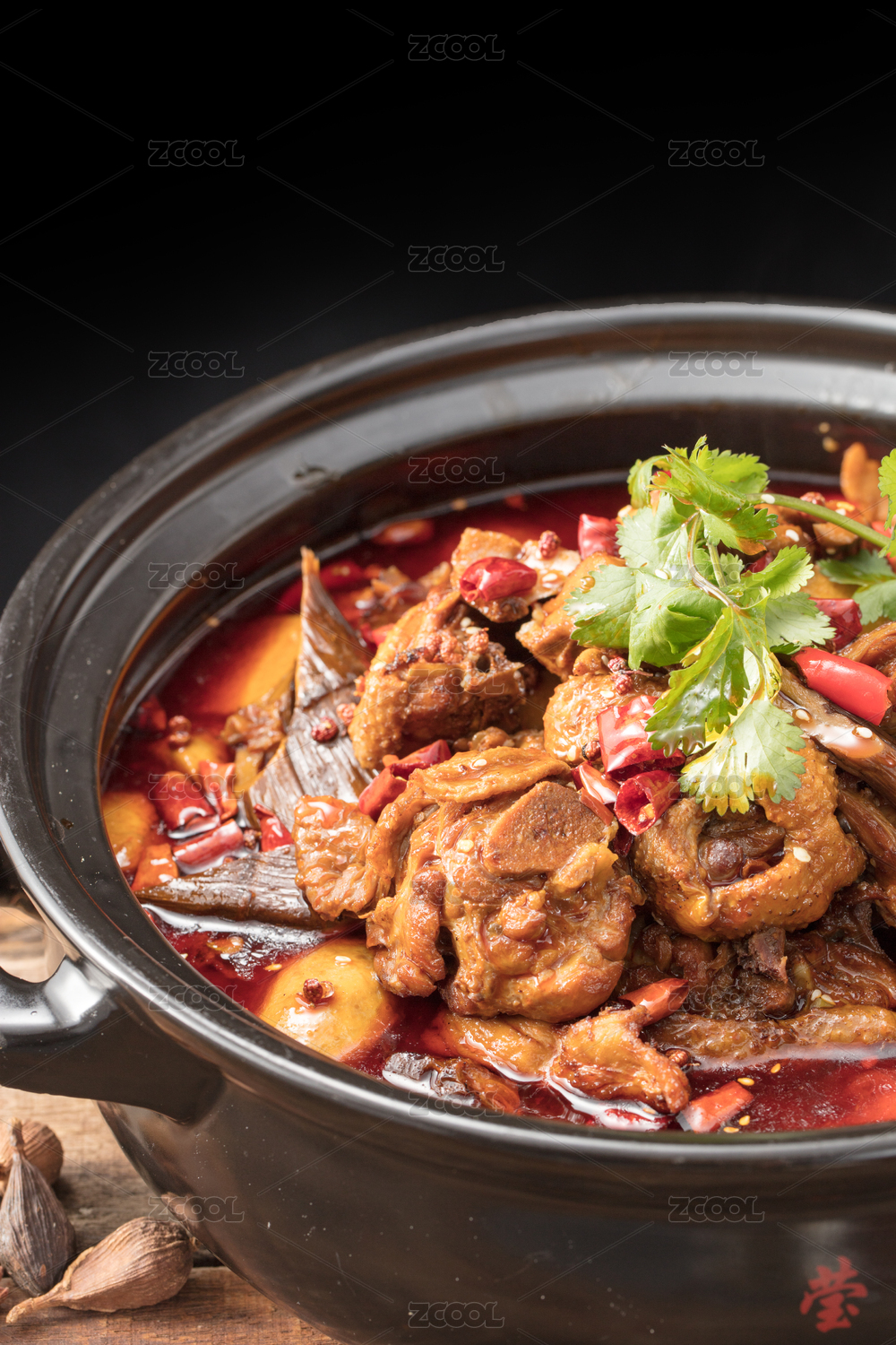 木桌上黑色大碗里的麻辣竹筍芋兒雞