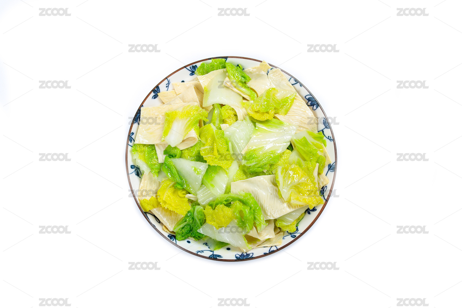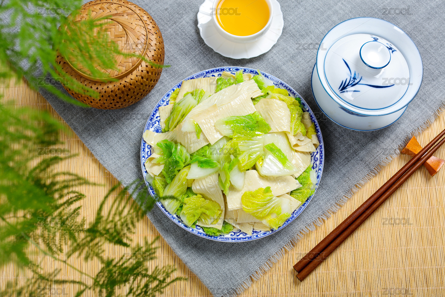 白色圓盤裝的韭菜蘆筍炒腐皮絲