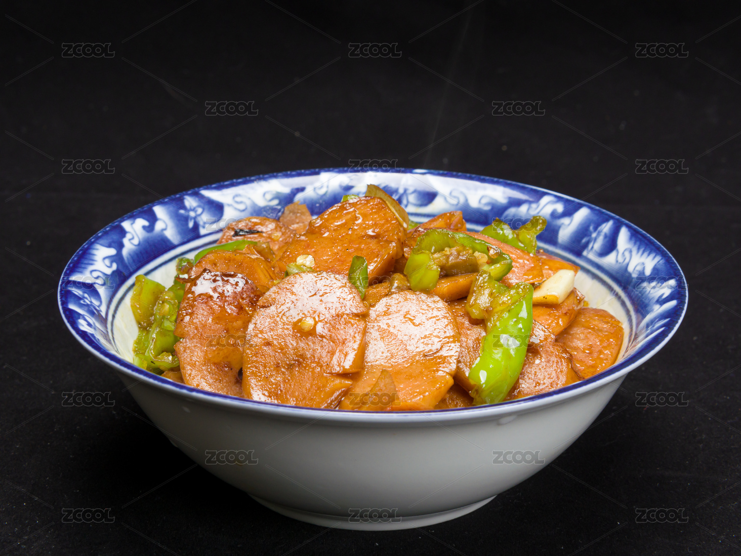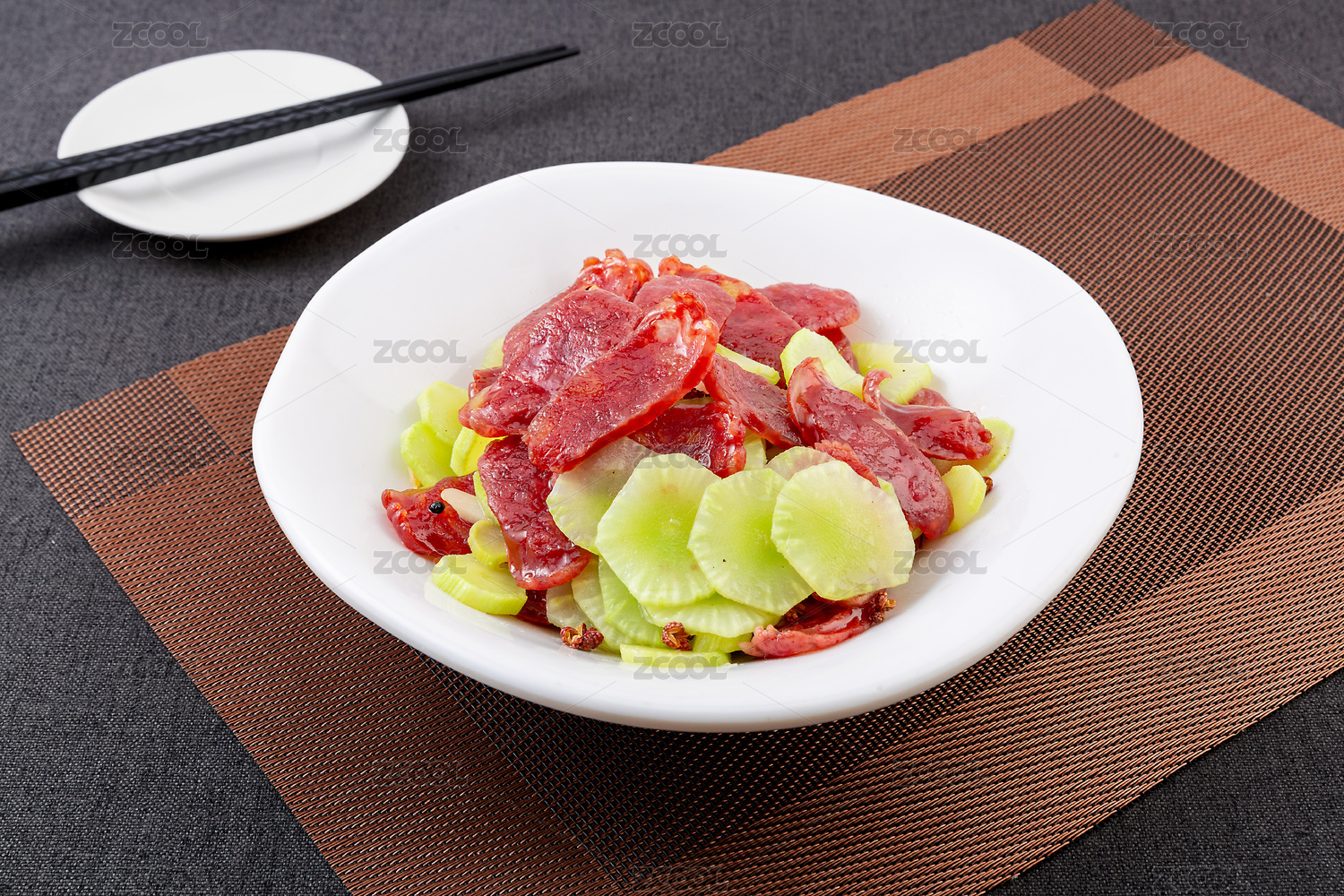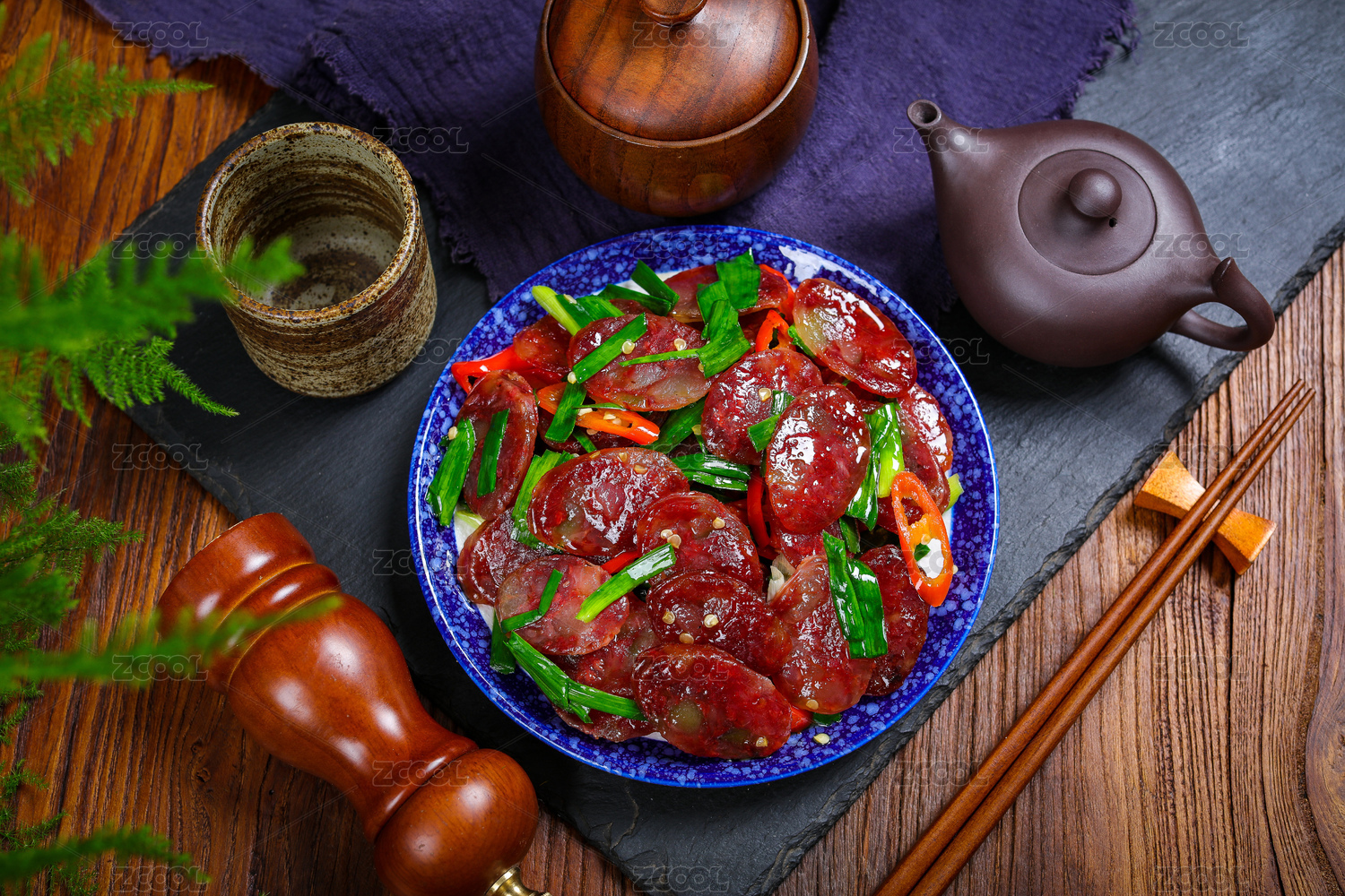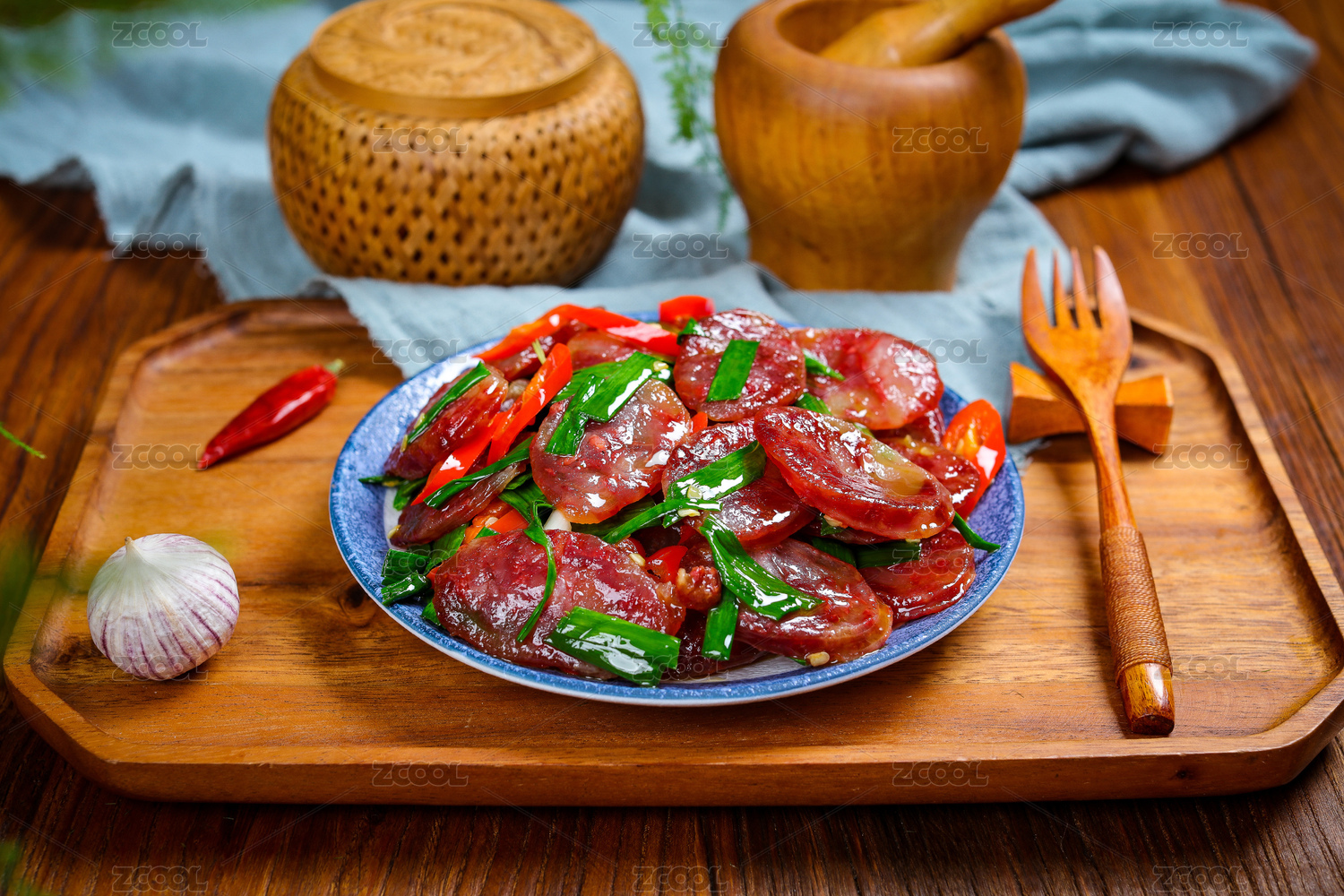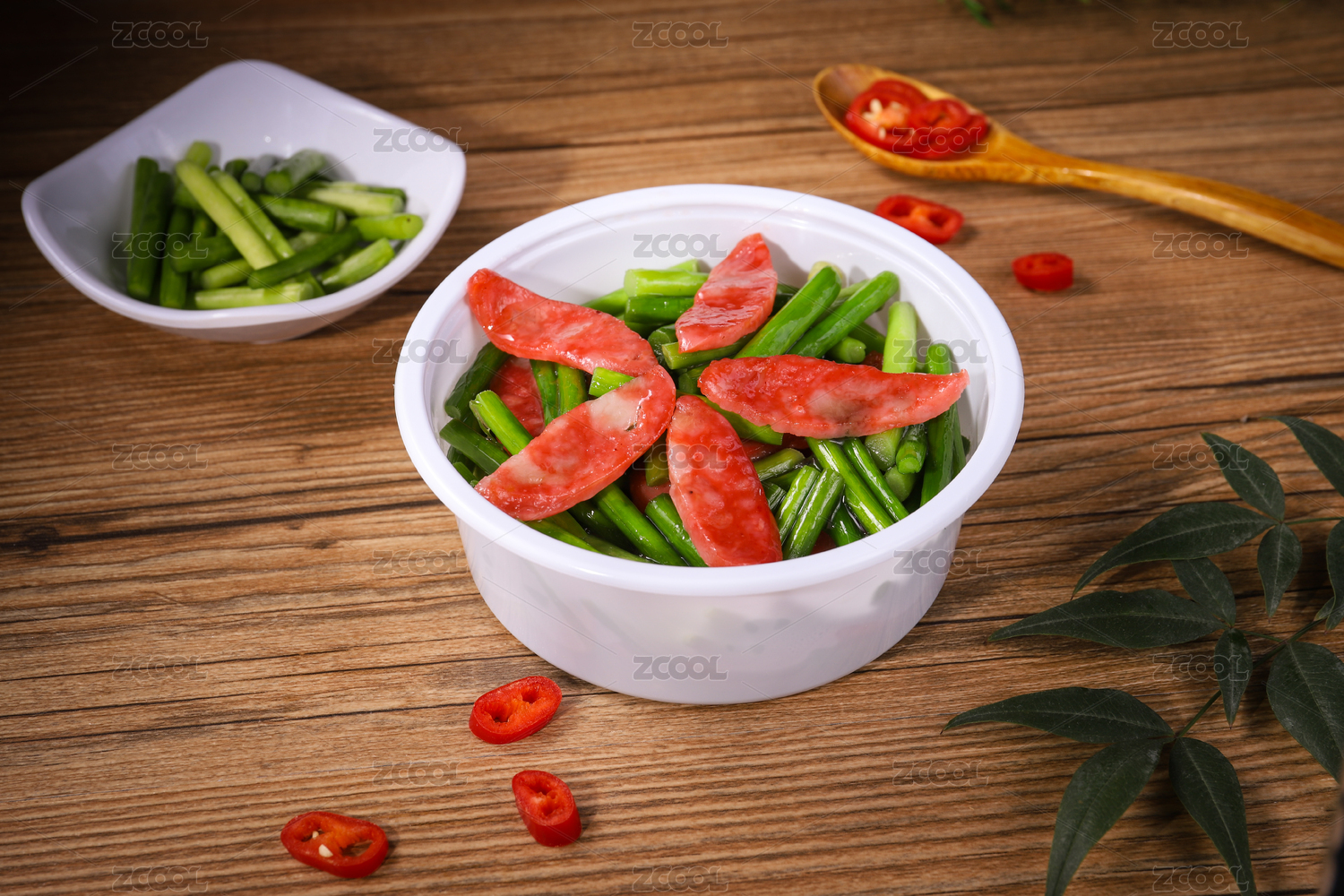 木紋背景上碗里的蒜苔炒香腸