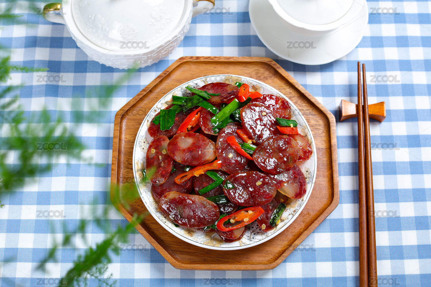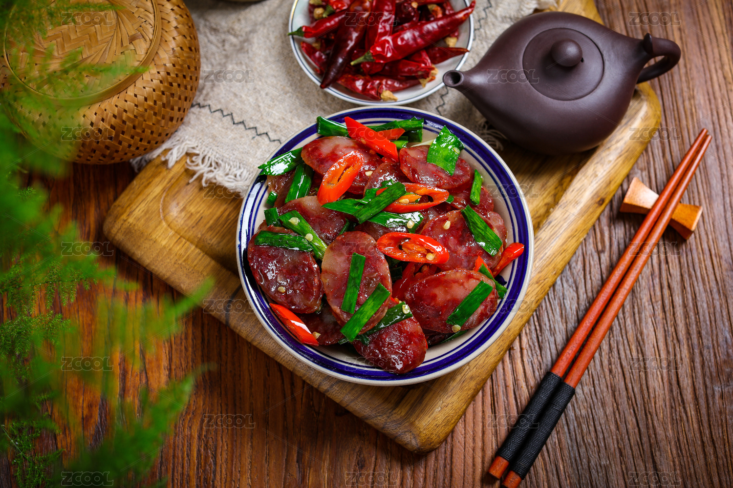 木底上放著一盤辣椒炒香腸和筷子上夾著香腸