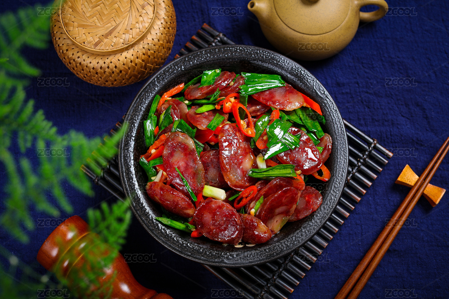 淺藍色背景上黑色瓷盤中的蒜苗炒香腸