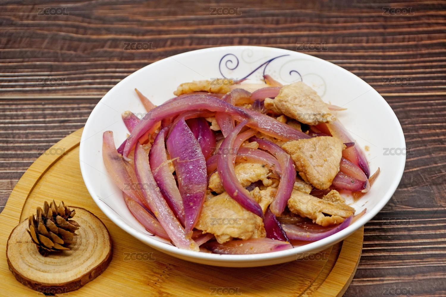 木桌背景中的一盤(pán)洋蔥炒肉