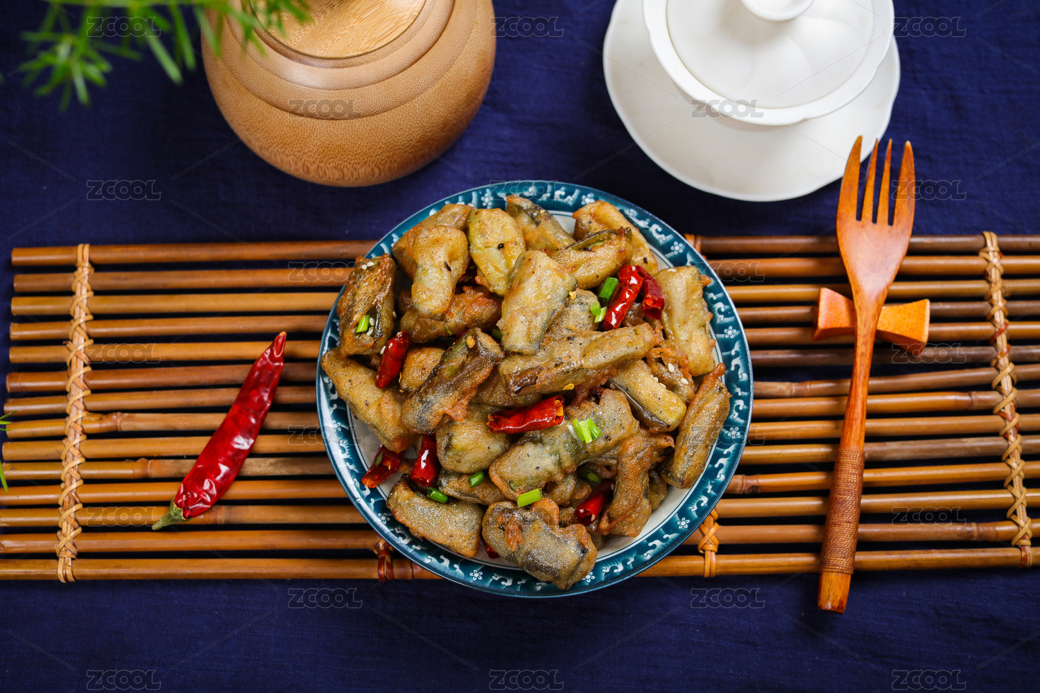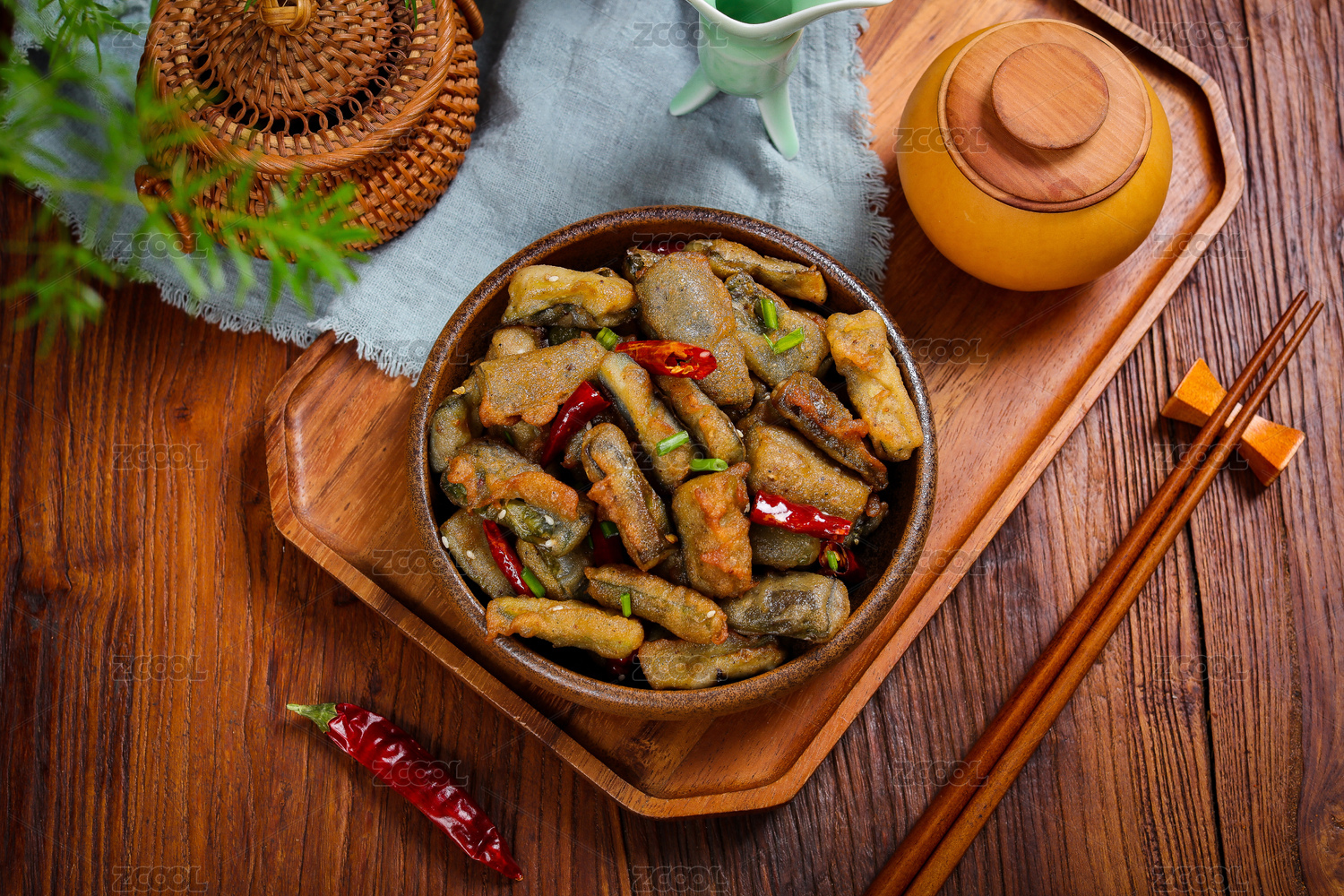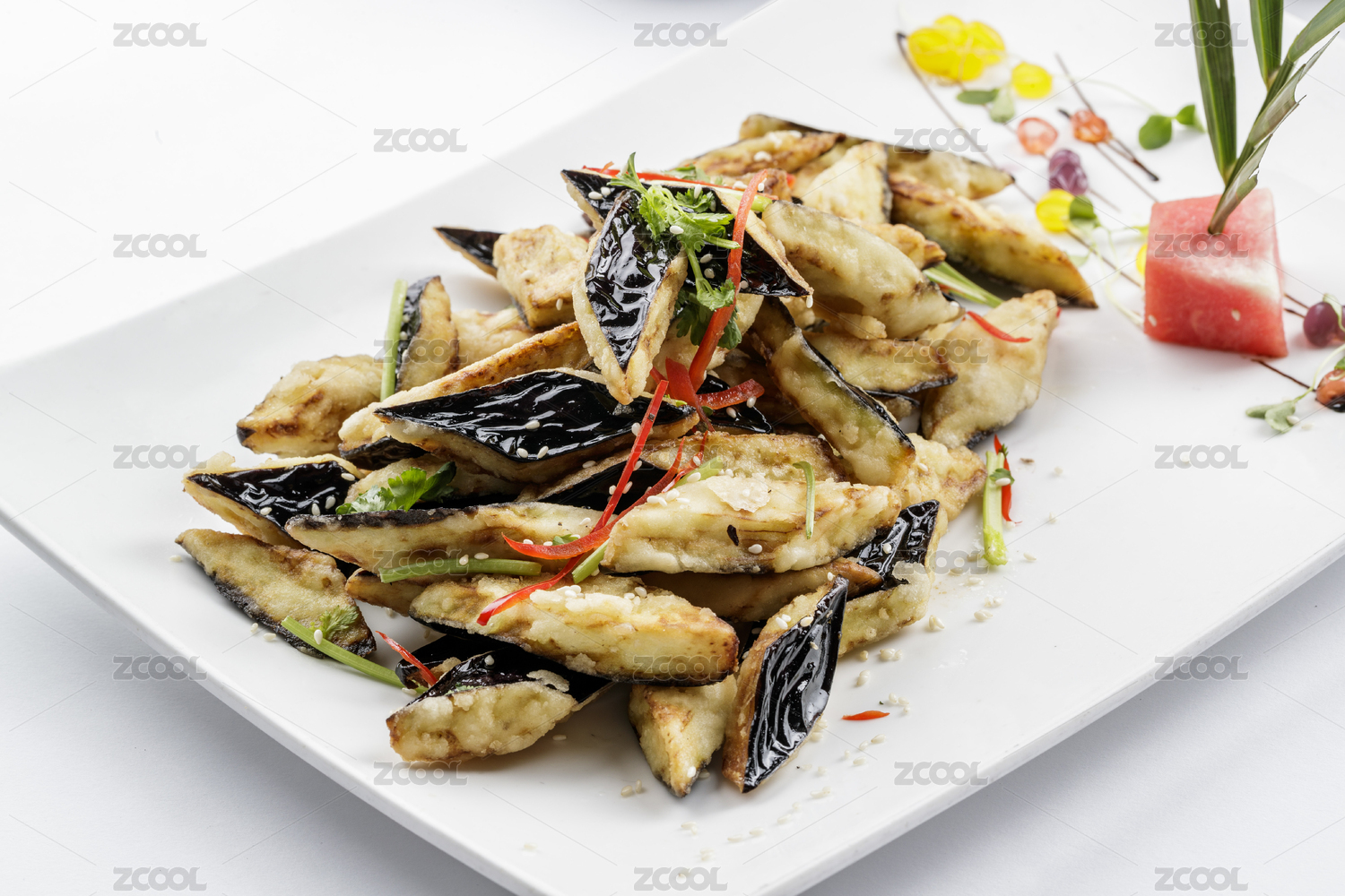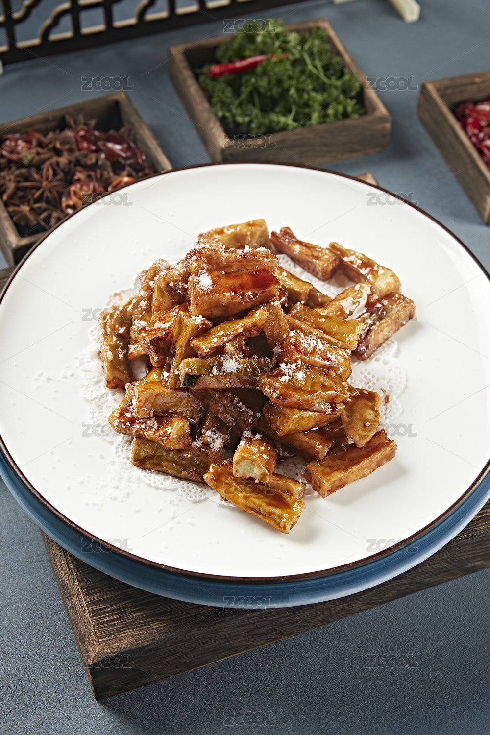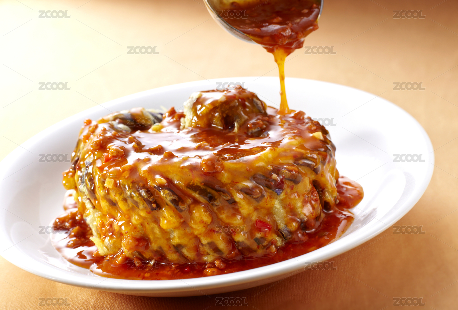 木托盤上白色碗里麻辣炒雞炸茄子套餐