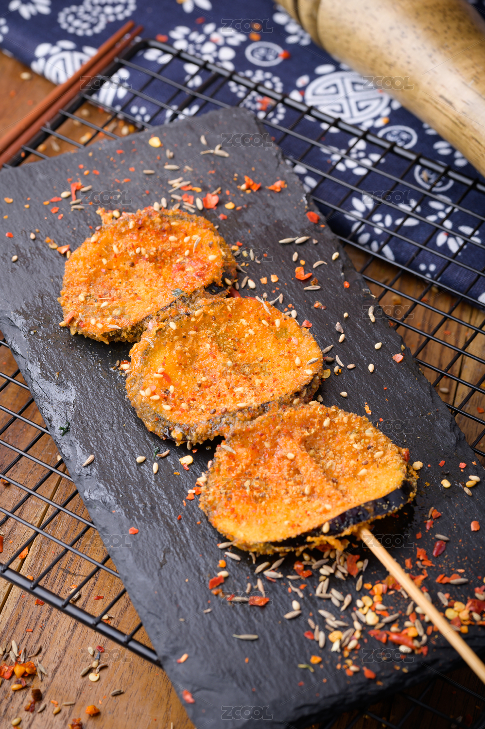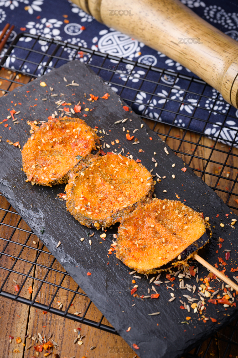 黑色烤架上放著兩串撒著辣椒面油炸茄子片