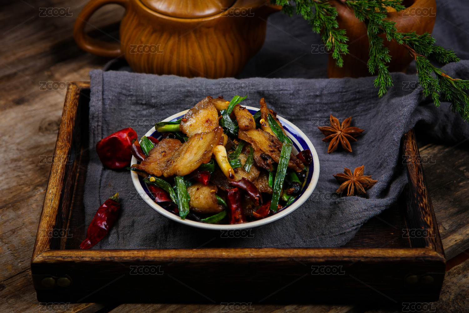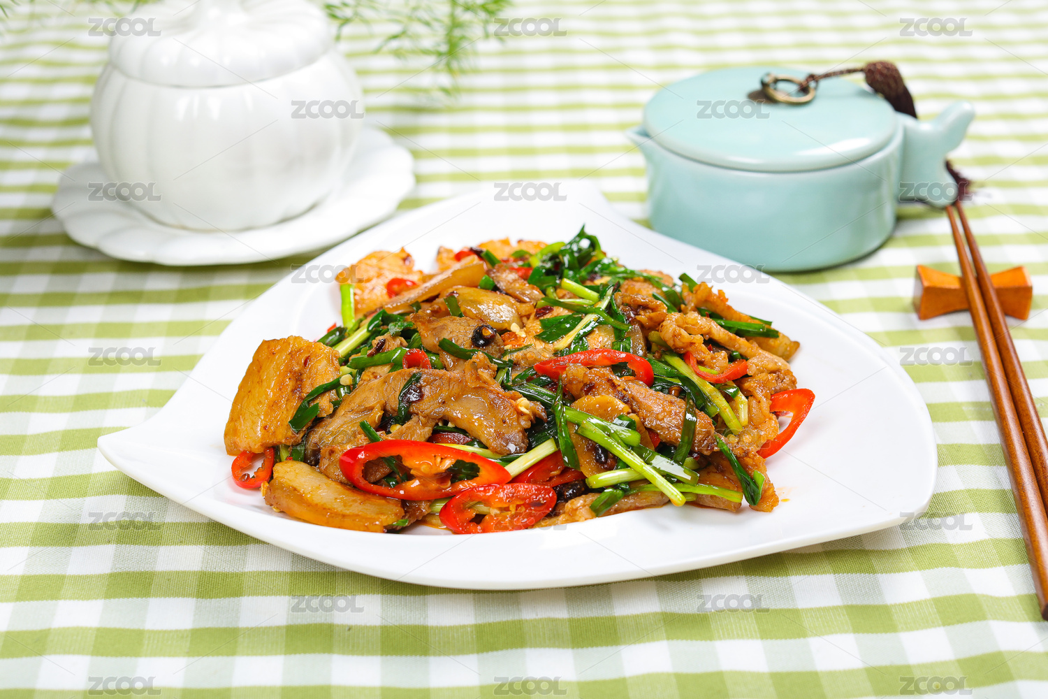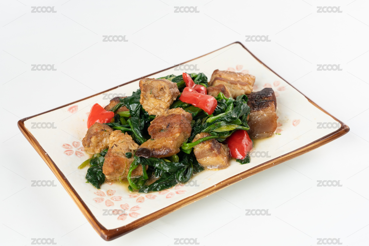 白盤里的川菜菜品咸菜炒五花肉小炒肉