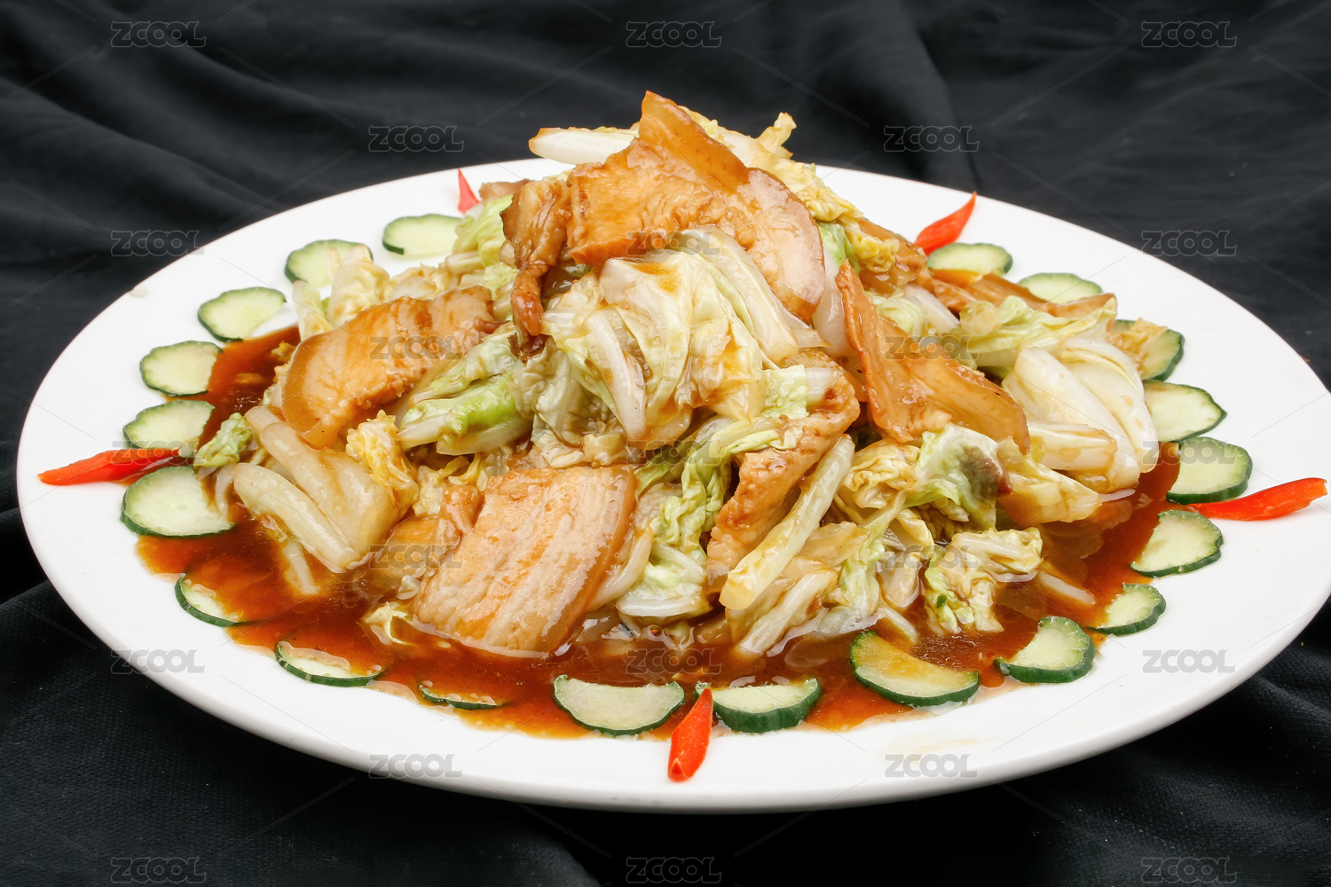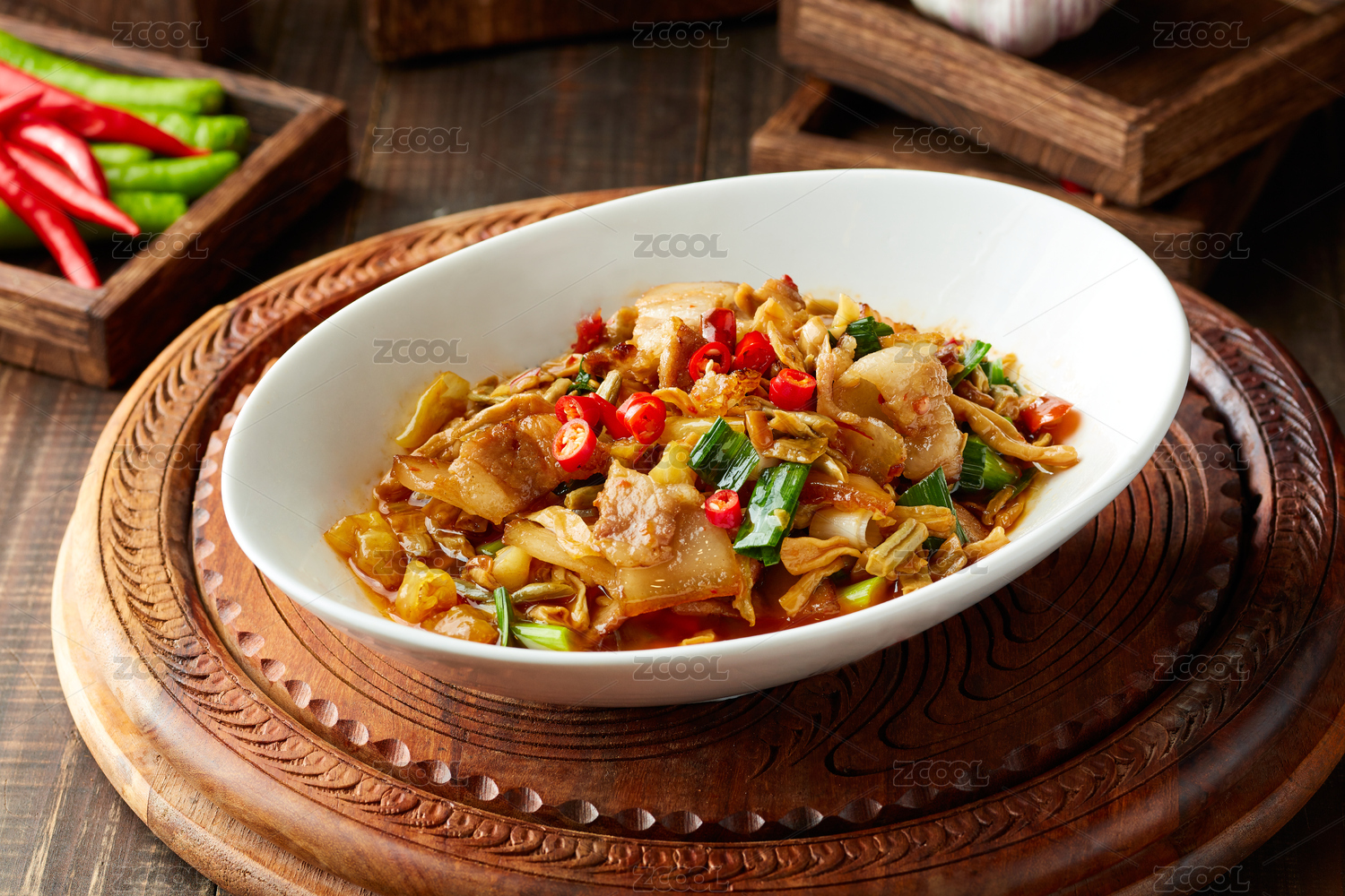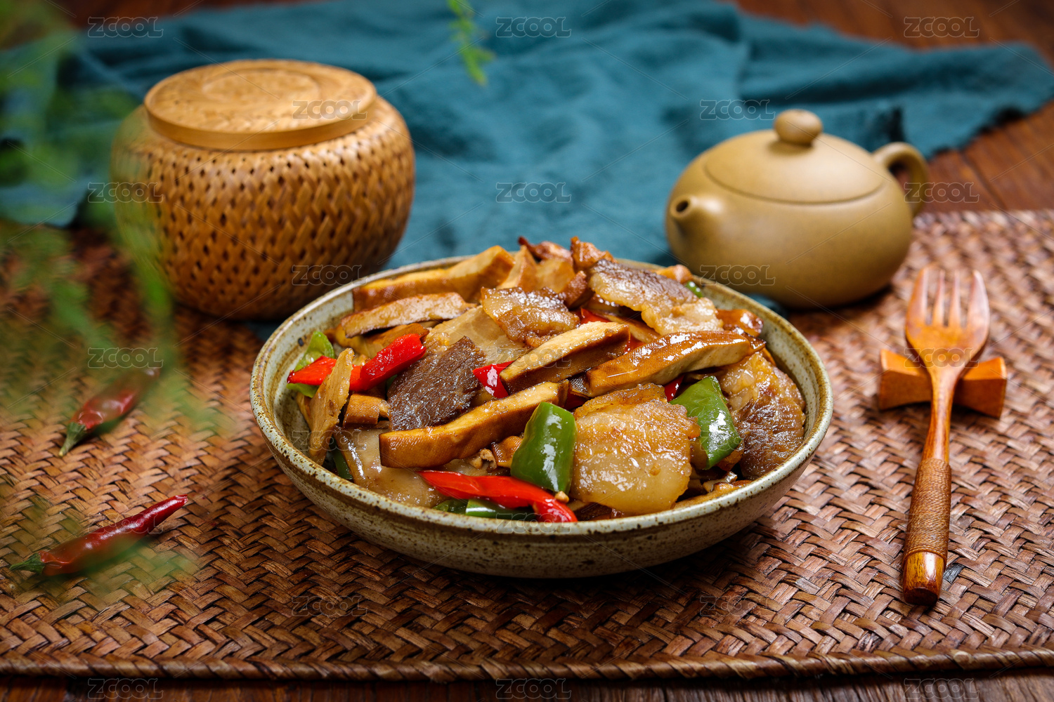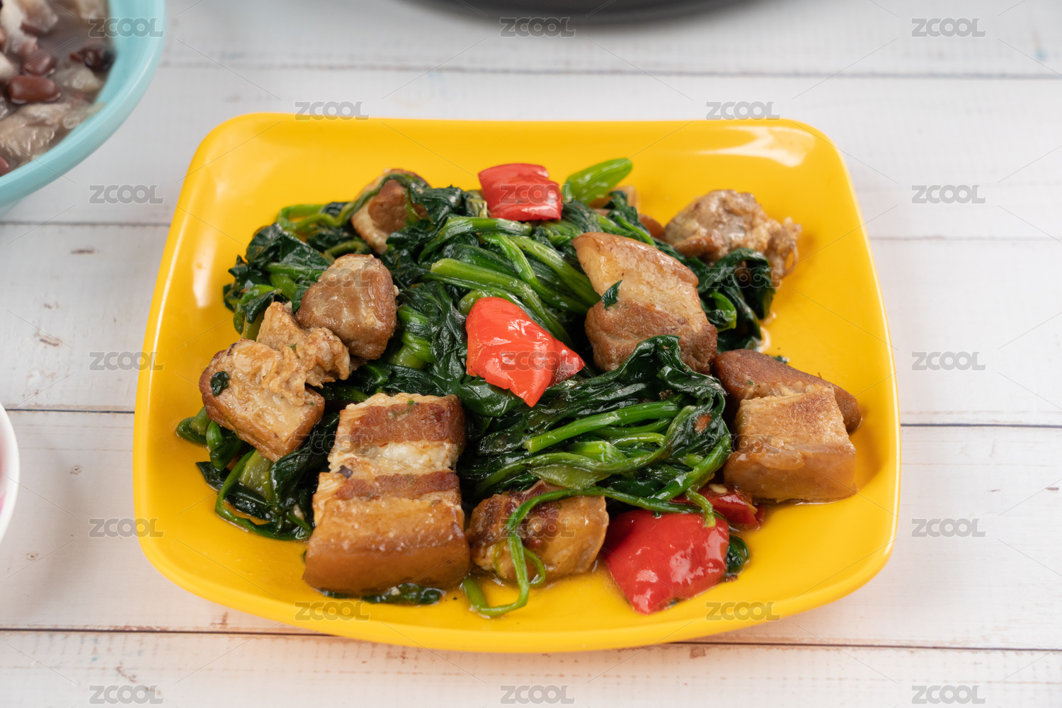 白盤里的川菜菜品咸菜炒五花肉小炒肉