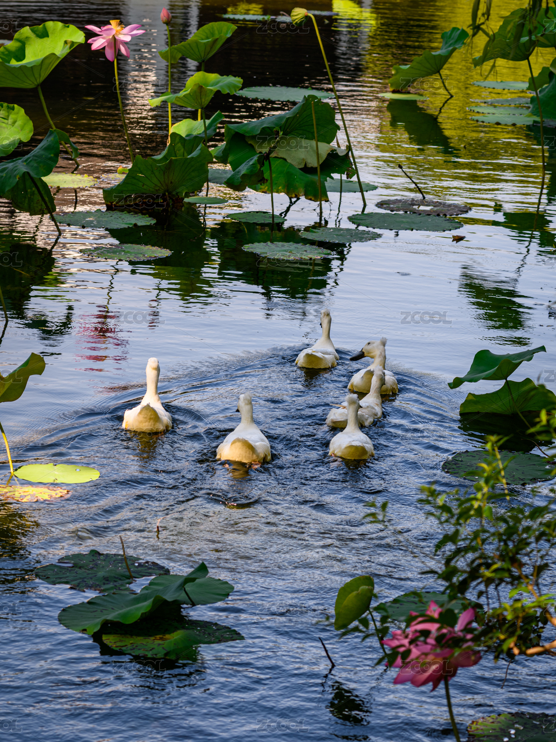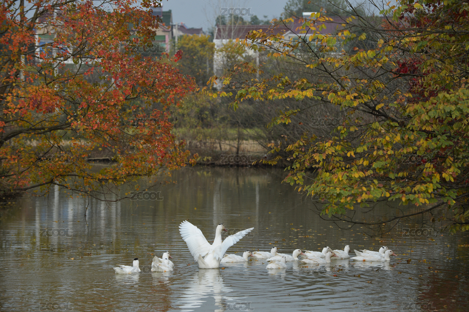 秋日鄉(xiāng)村池塘中一群白鴨游過