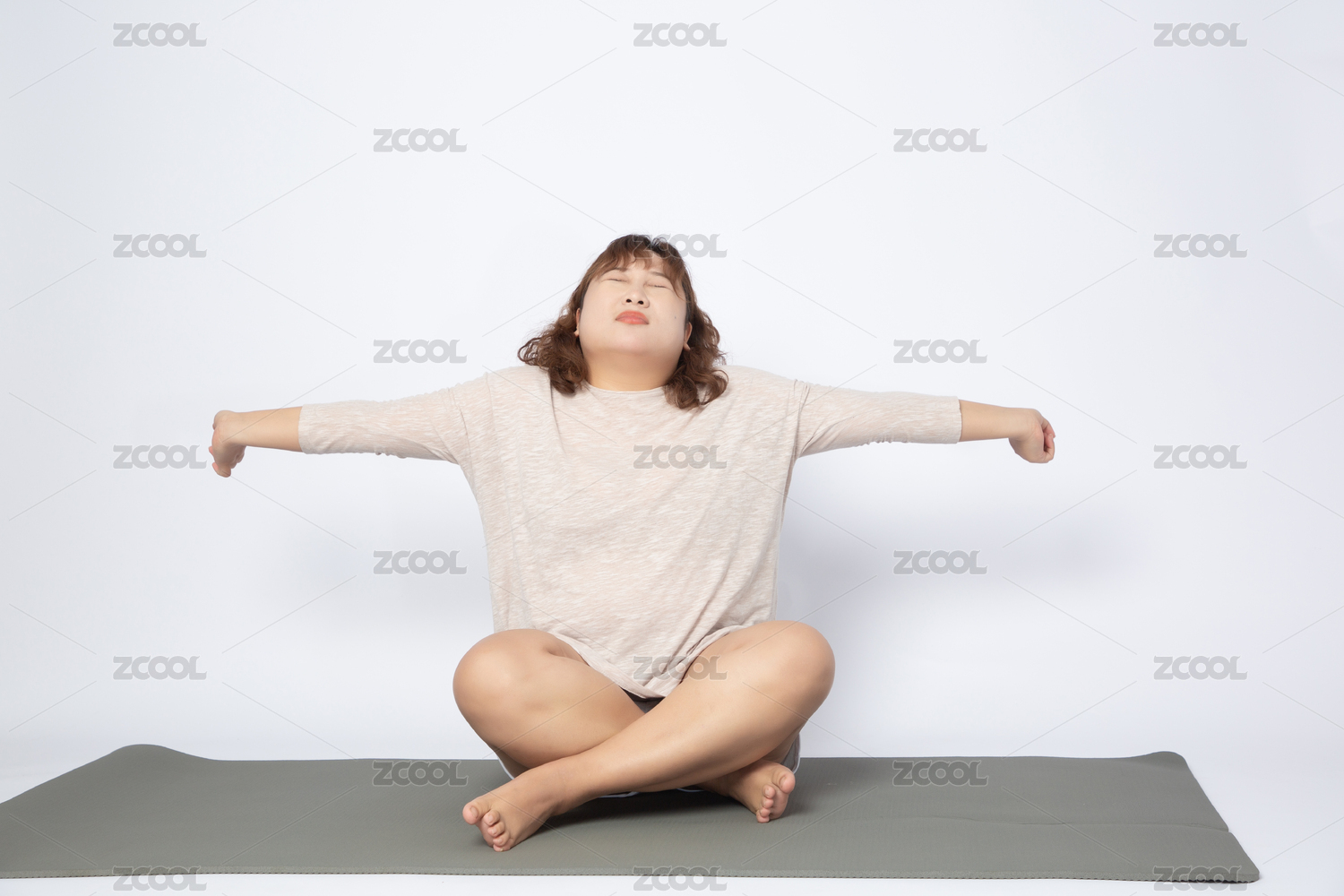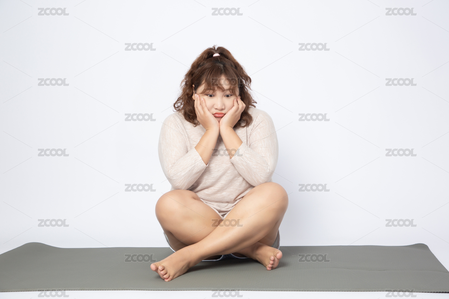 坐在瑜伽墊上心情難過(guò)的亞洲肥胖女孩