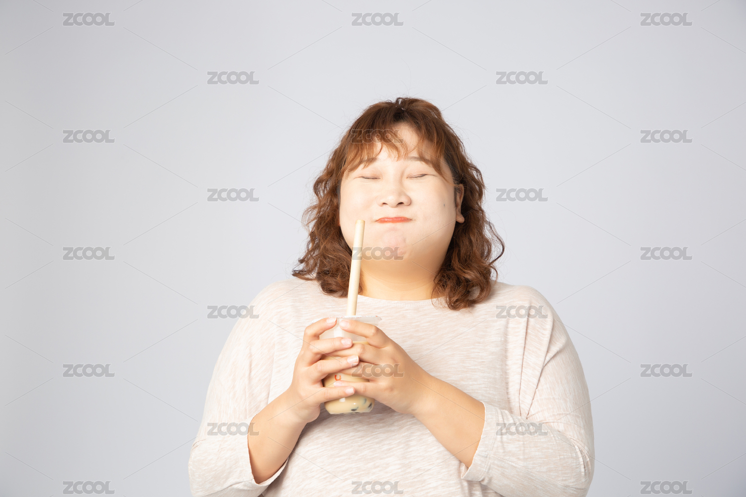 可愛(ài)的亞洲肥胖女孩喝著珍珠奶茶