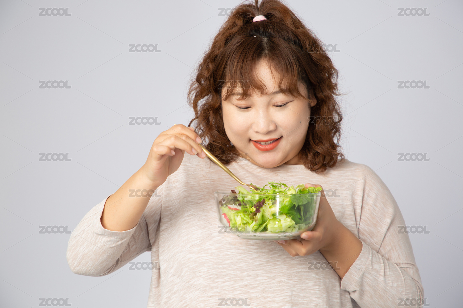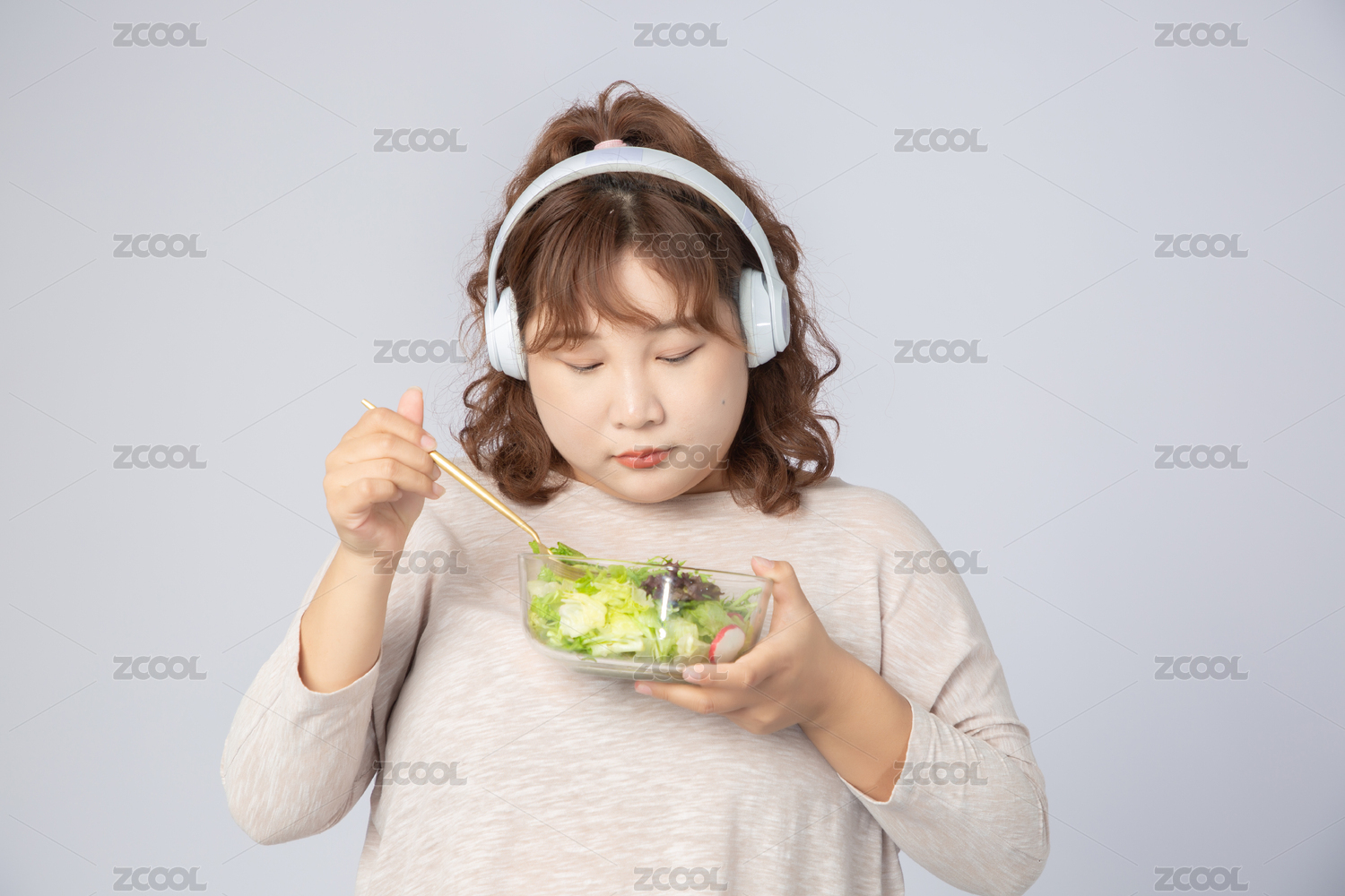 吃沙拉的亞洲肥胖女孩
