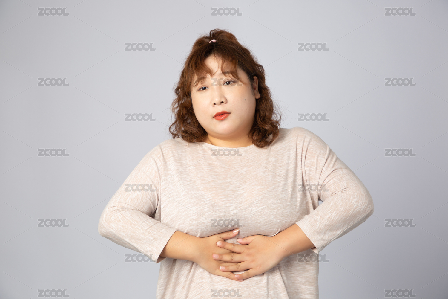 胃疼的亞洲肥胖女孩兒 手捂肚子