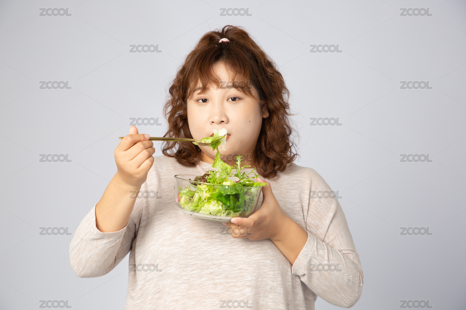 正在吃沙拉的亞洲肥胖女孩