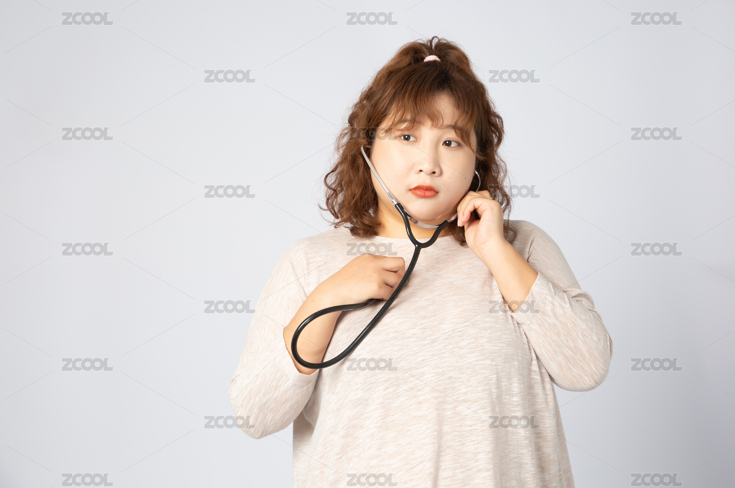 使用聽(tīng)診器的亞洲肥胖女孩