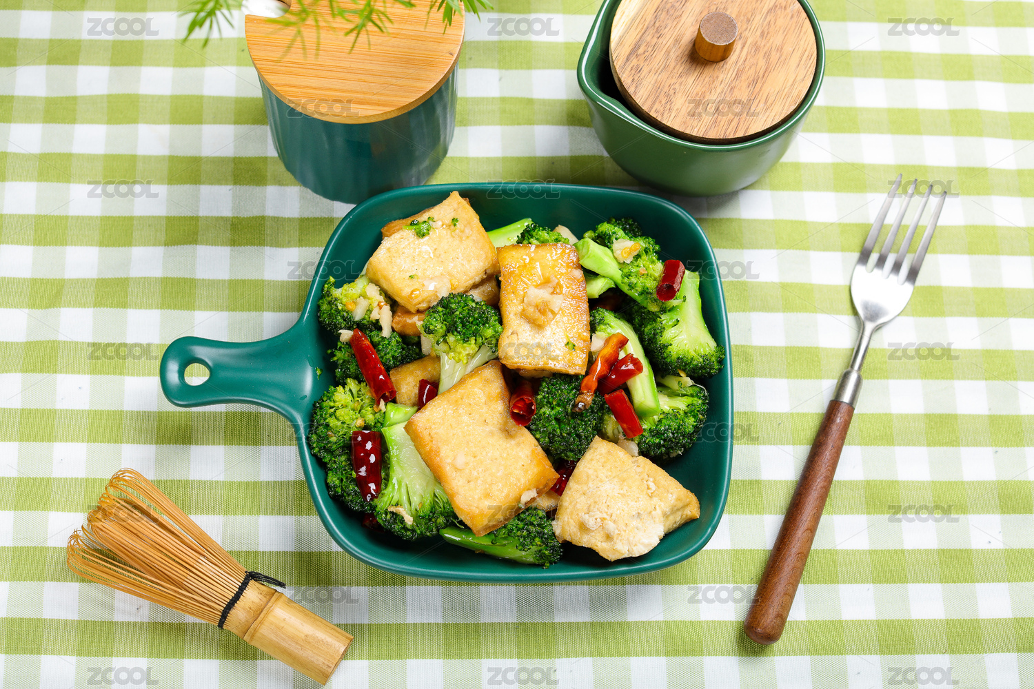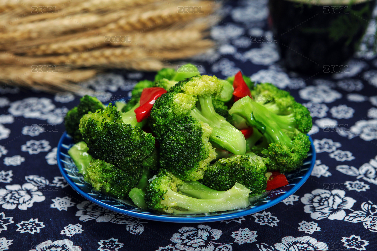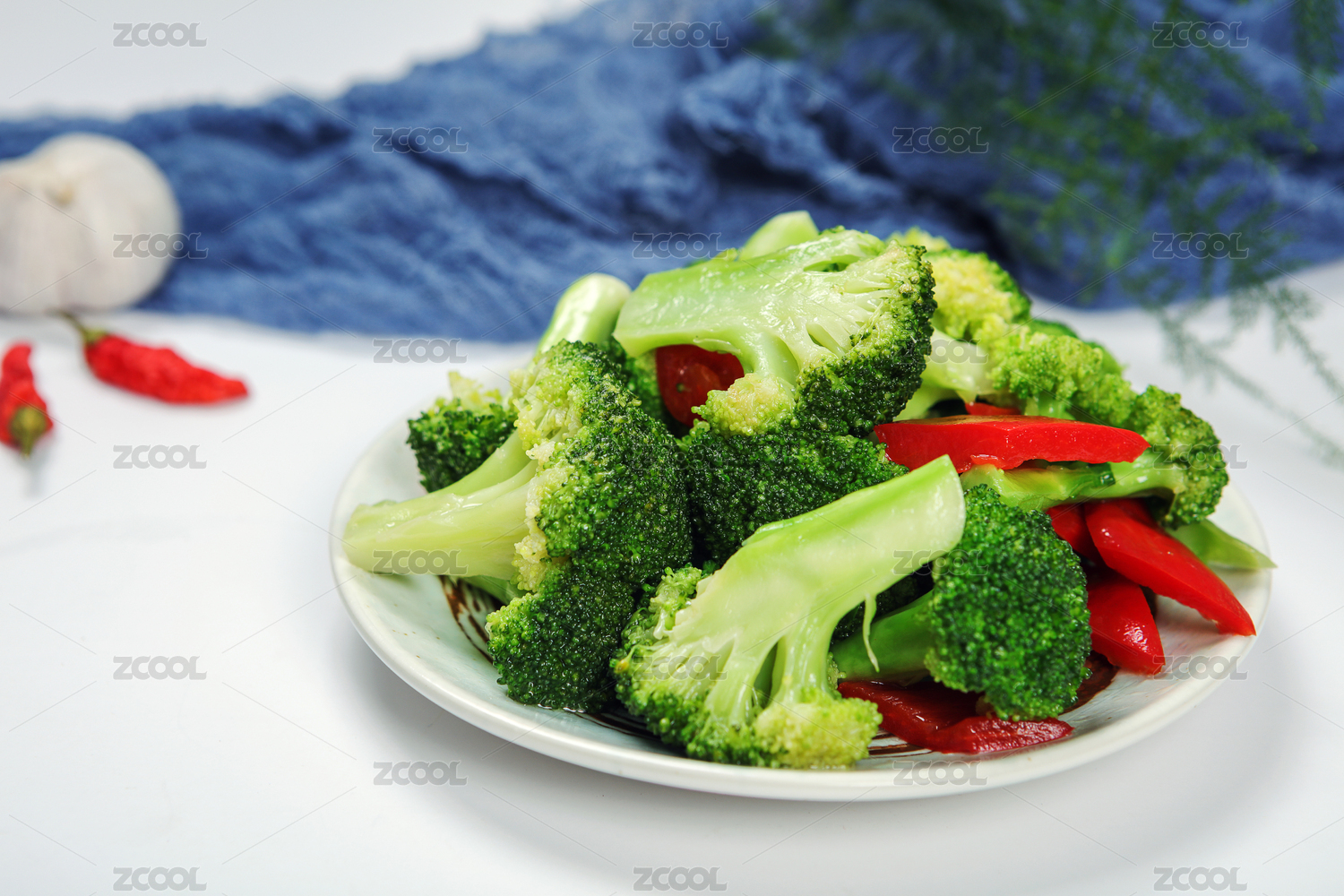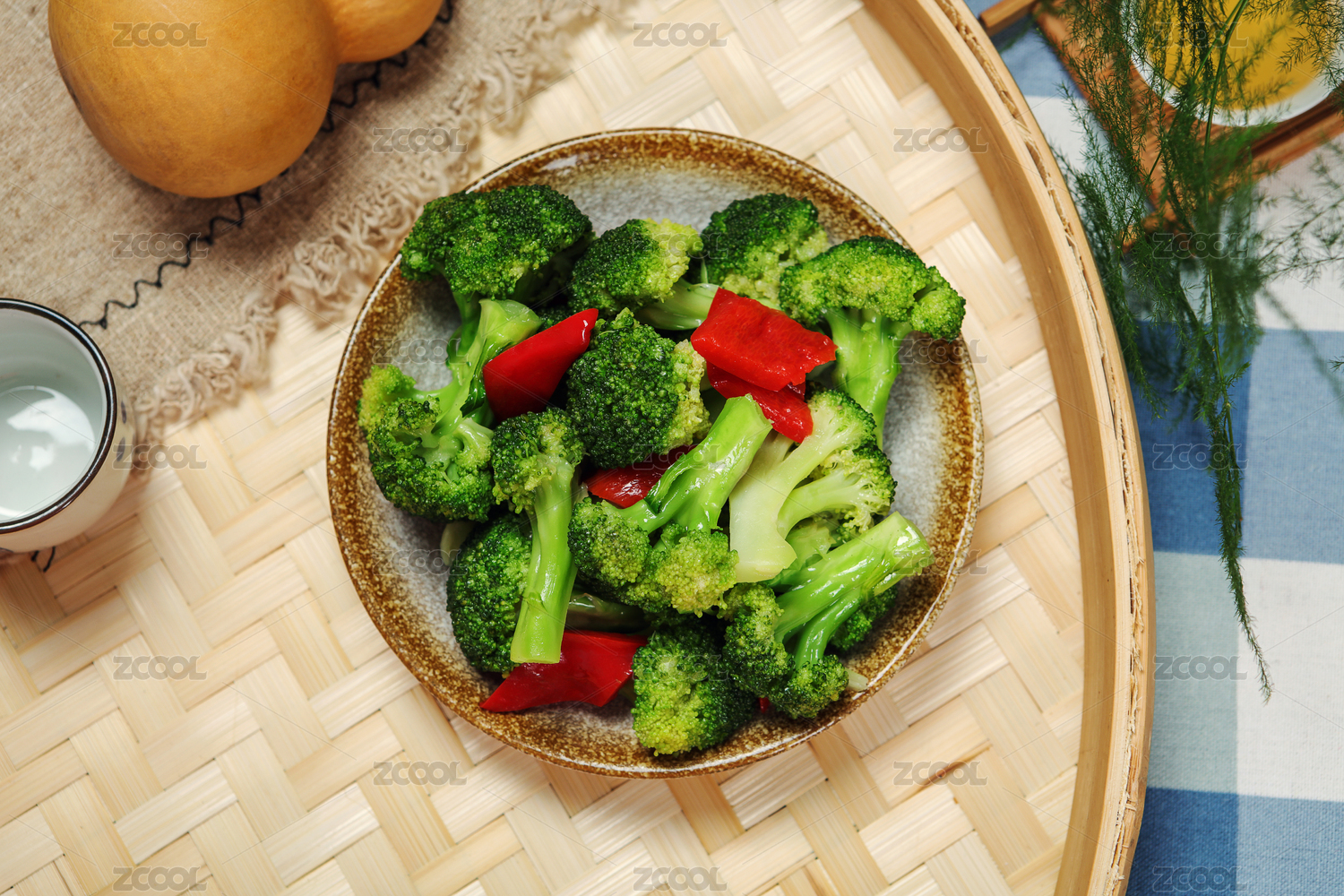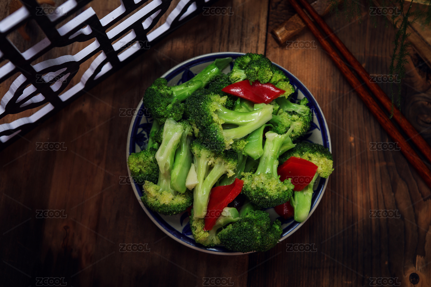 餐桌上擺放的中式菜品彩椒炒西蘭花