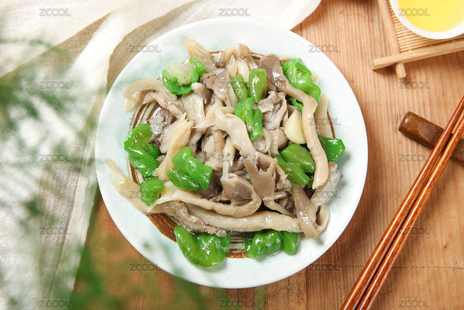 放在木紋板上的一盤(pán)家常菜炒平菇