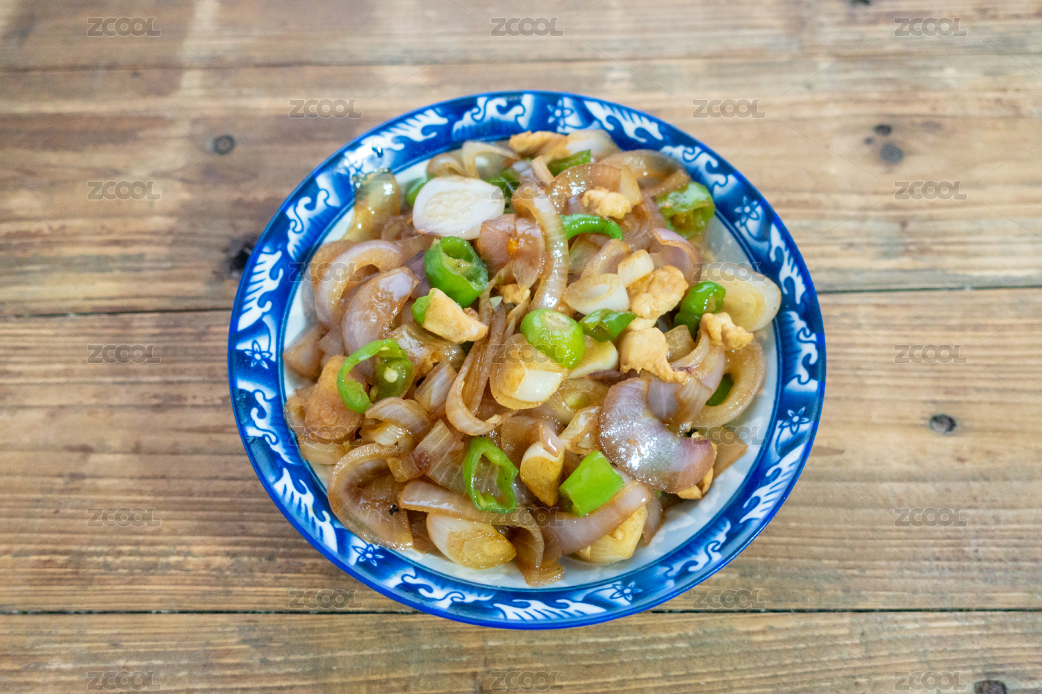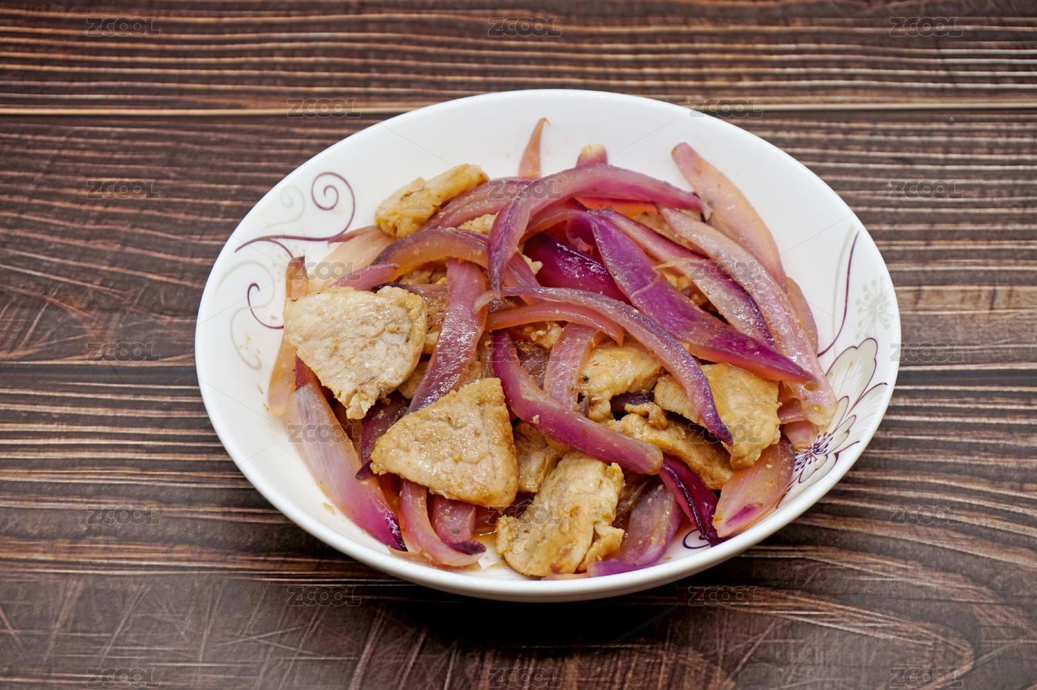 木桌背景中的一盤(pán)洋蔥炒肉