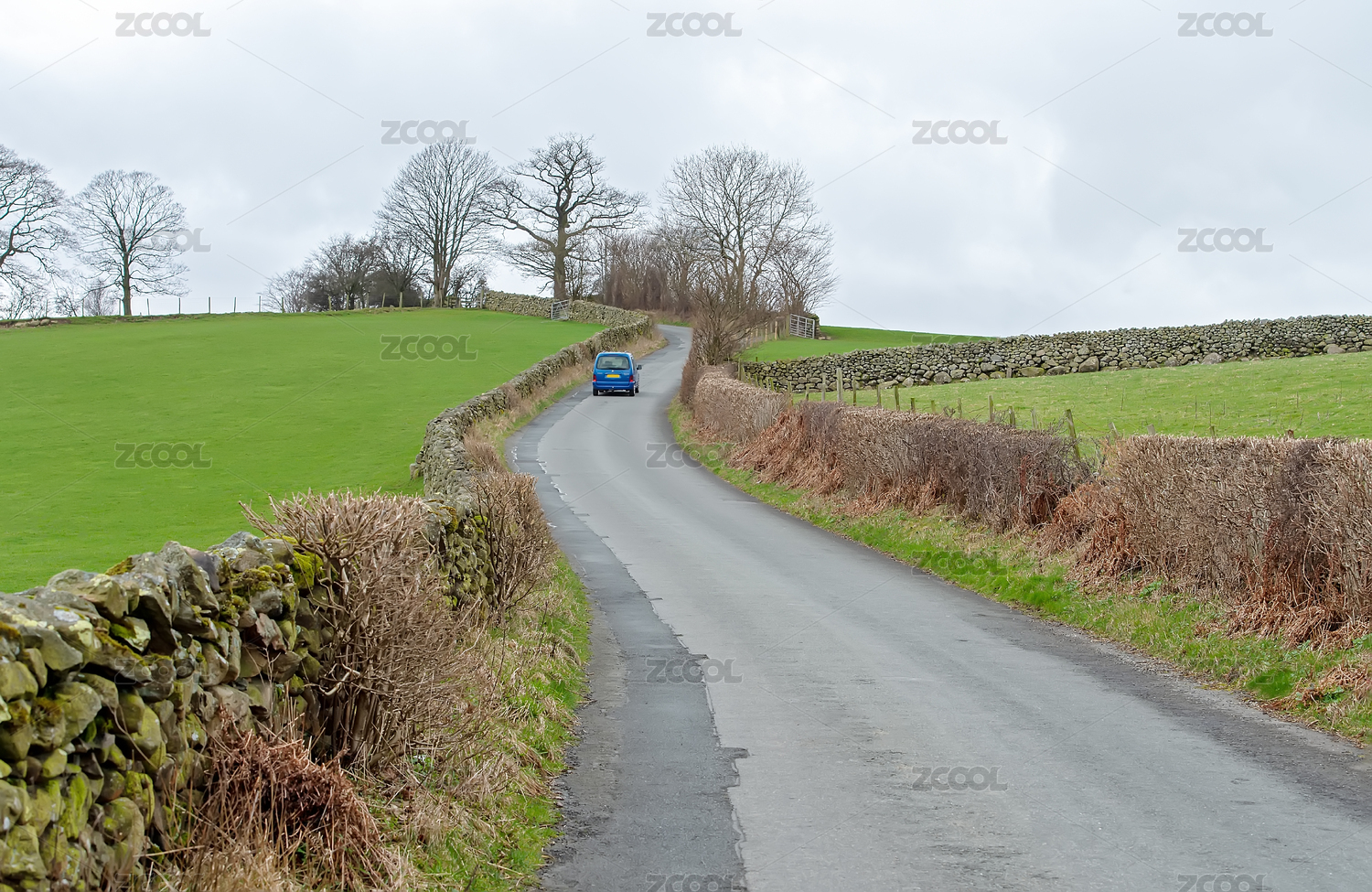 英國湖區(qū)國家公園一輛小車在鄉(xiāng)村小道上行駛