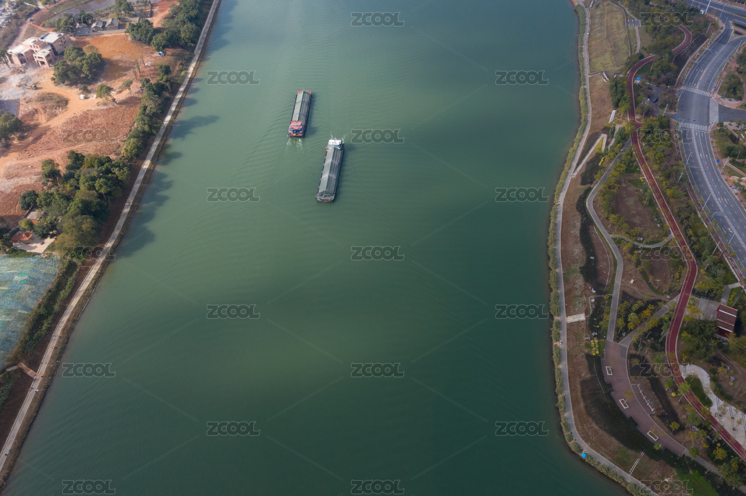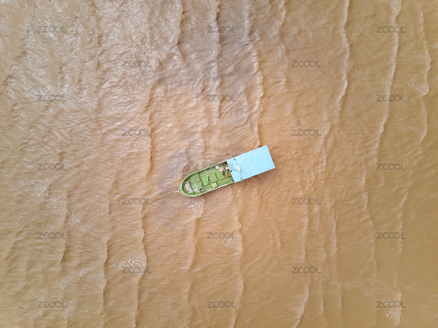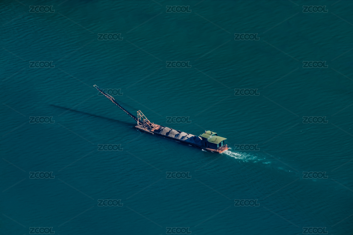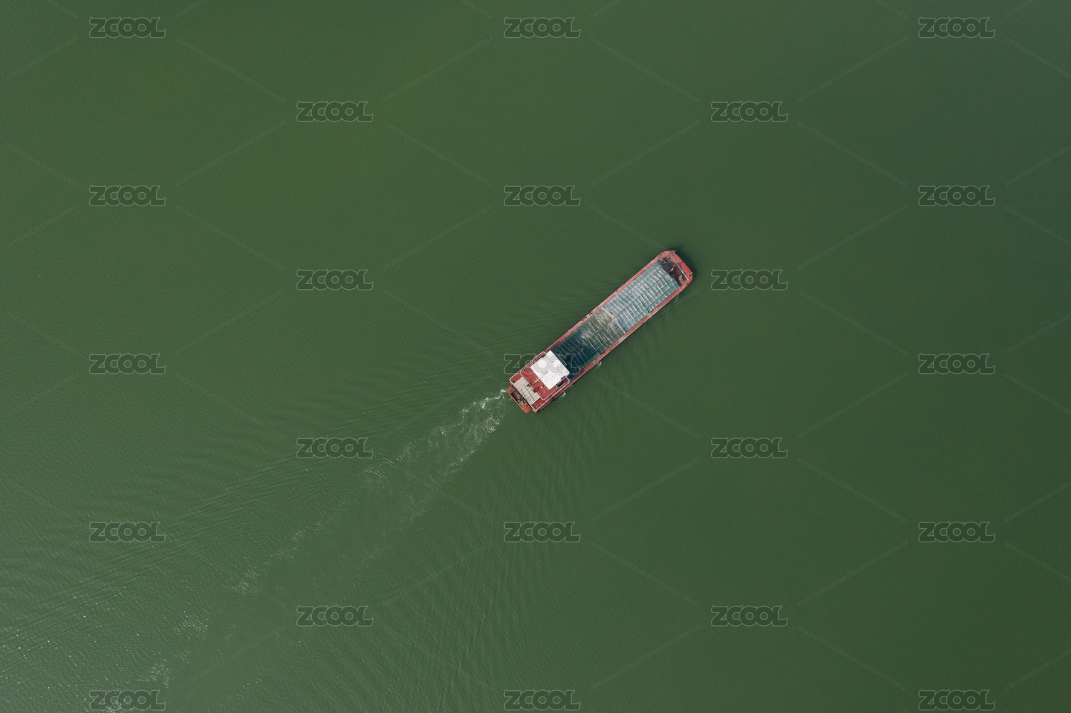 航拍一艘采砂船行駛在江面上頂視圖