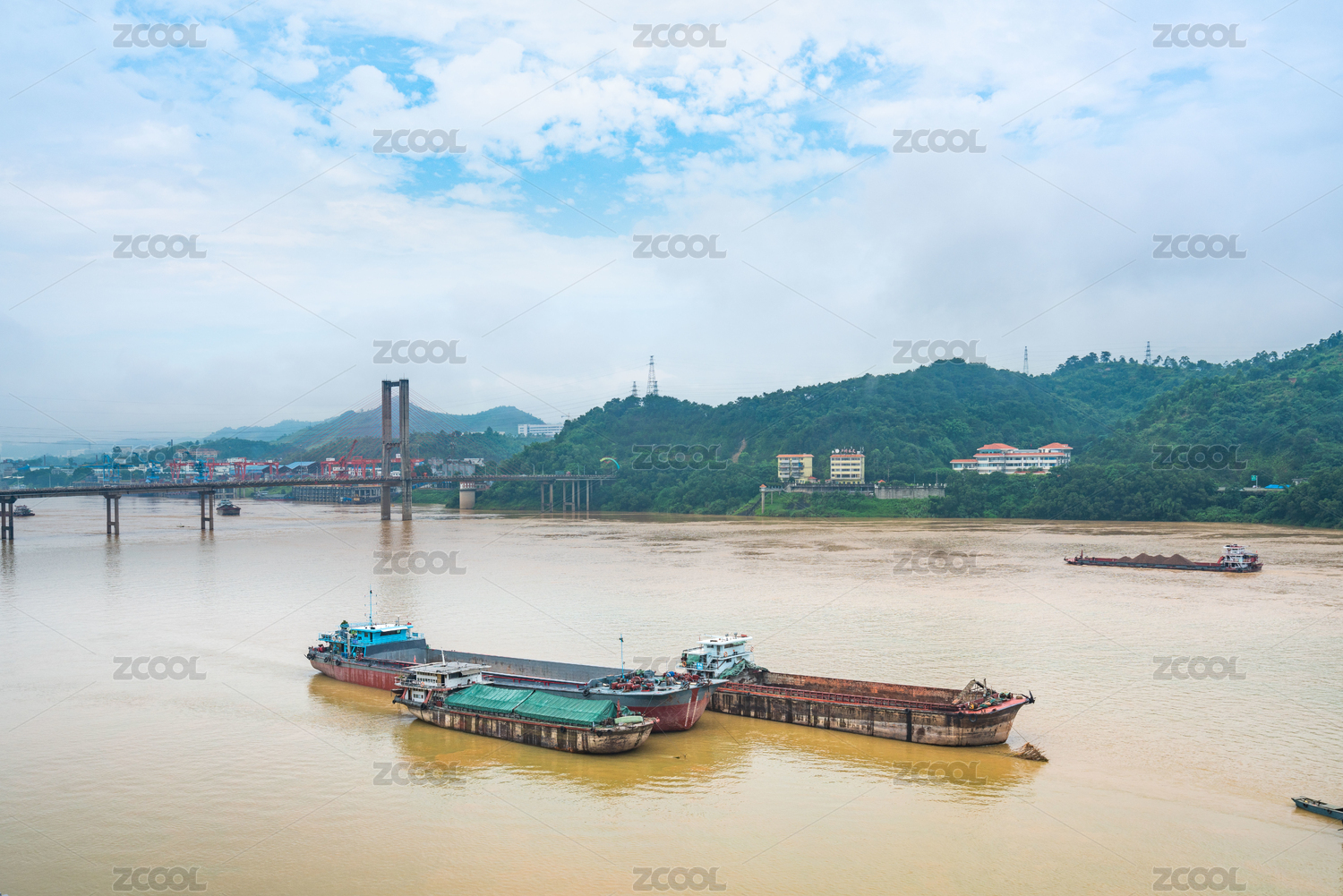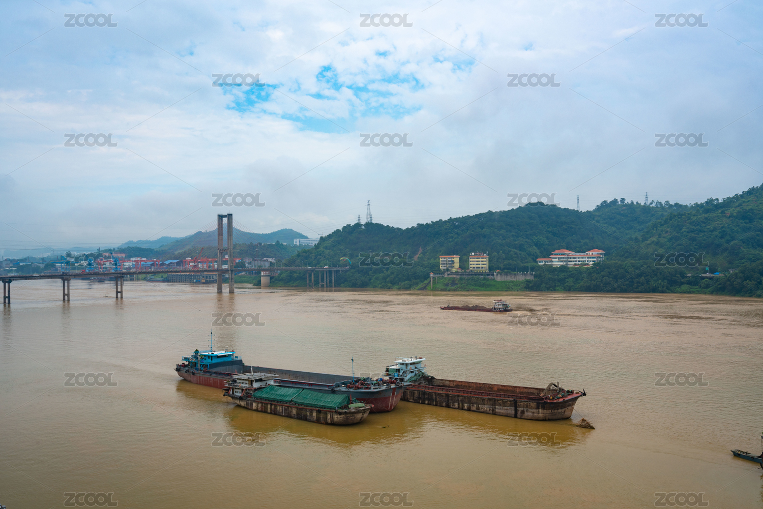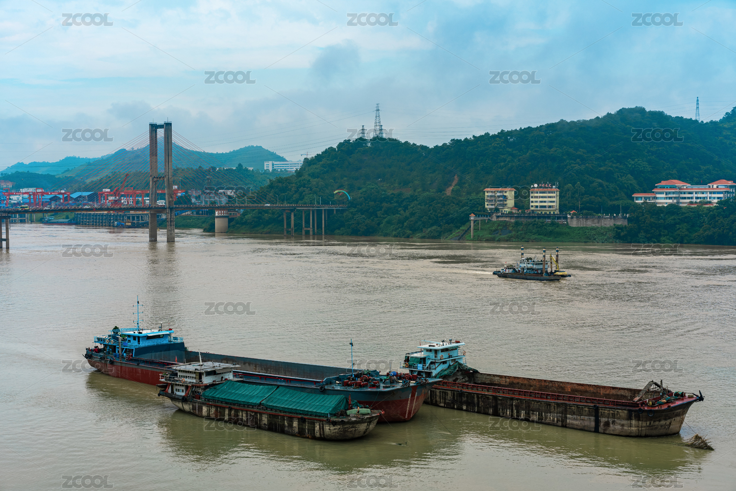 廣西梧州西江汛期,采砂船在河流中