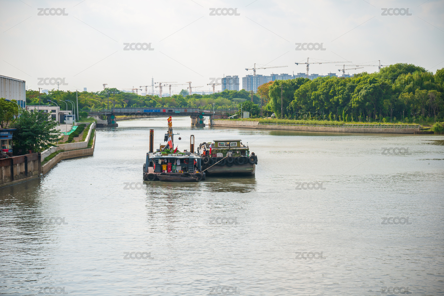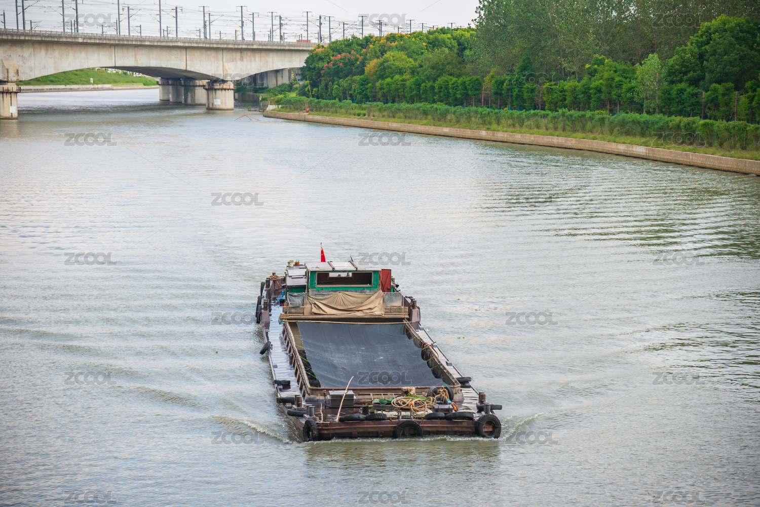 運(yùn)河上航行的一艘運(yùn)沙船特寫