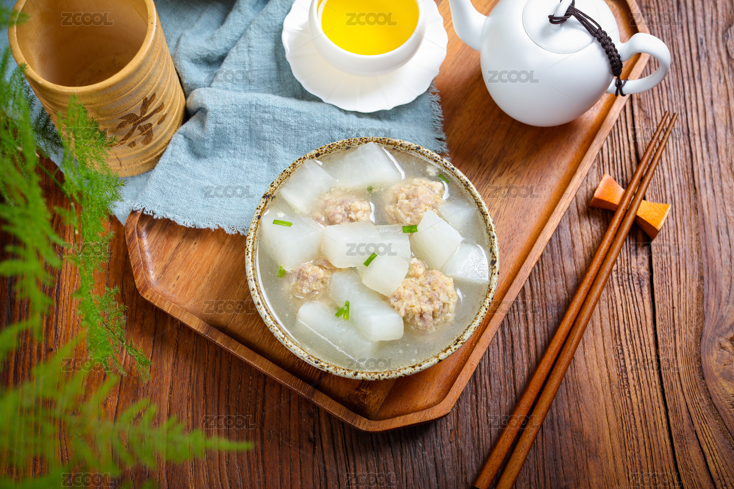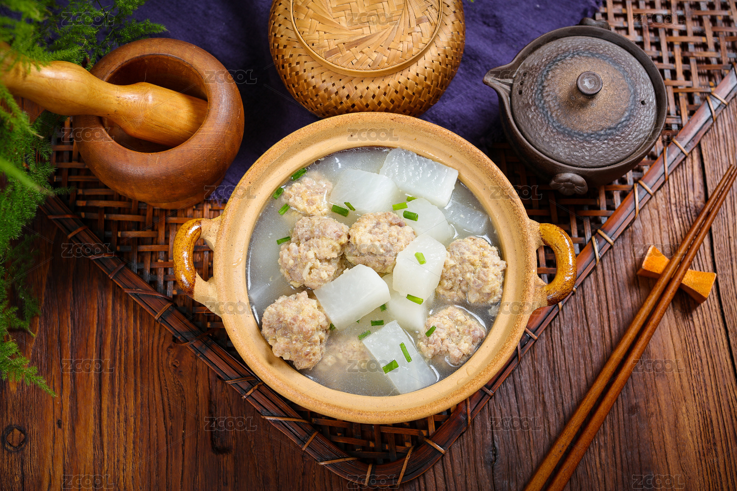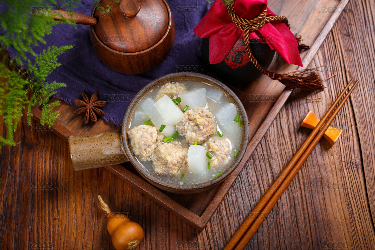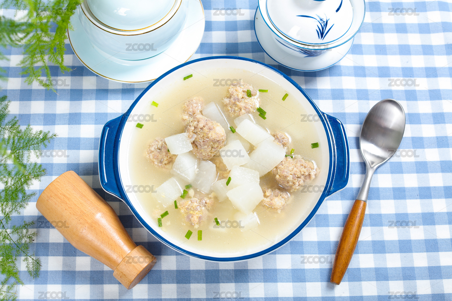 復(fù)古背景上的蔬菜鮮肉丸子湯