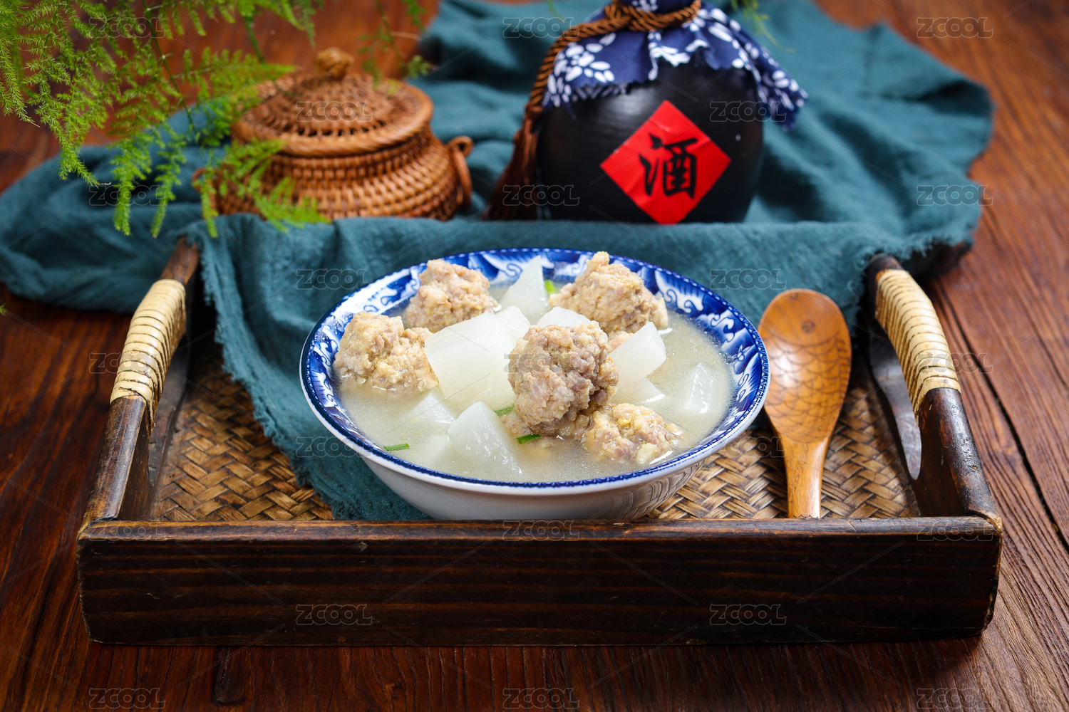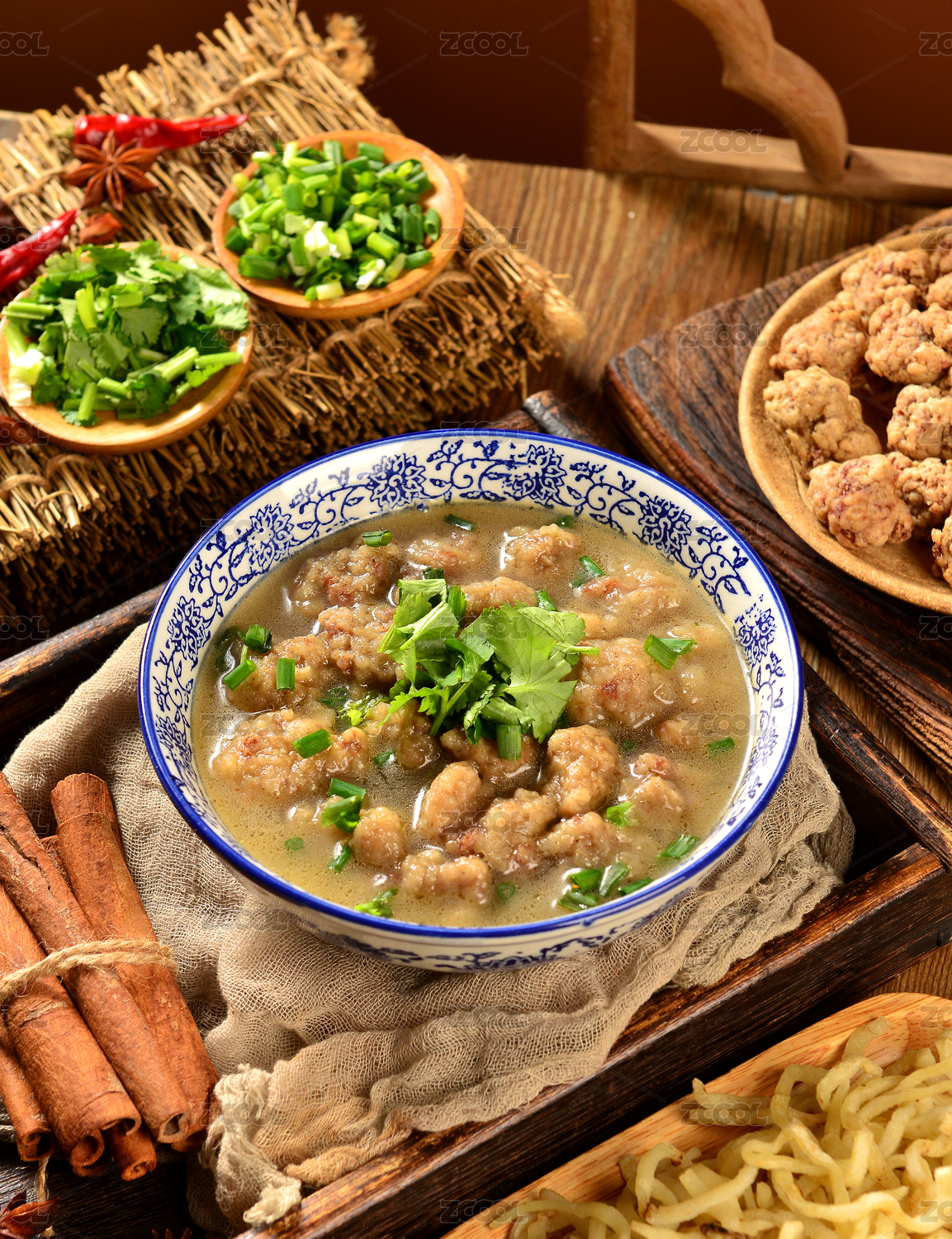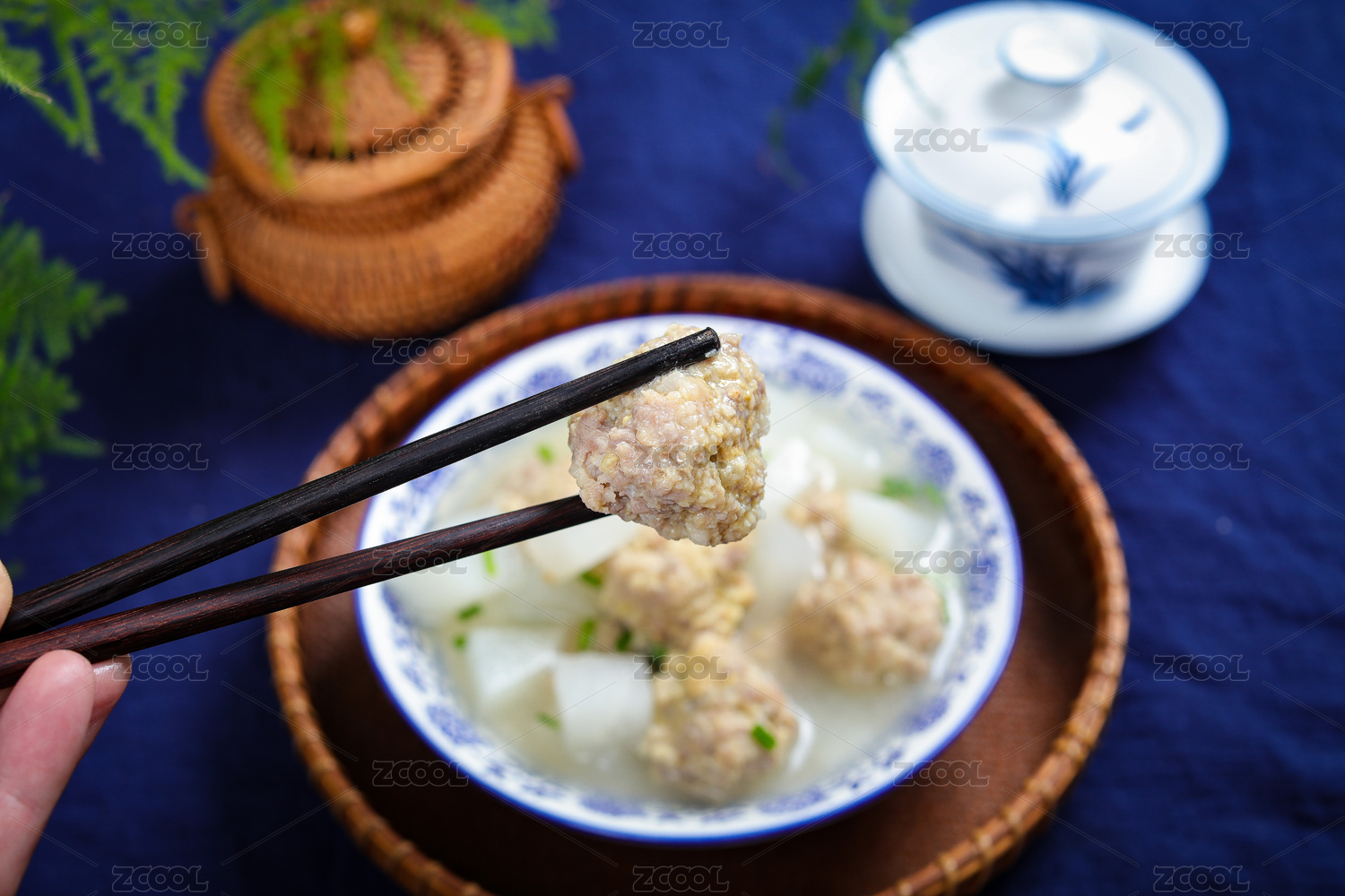 復(fù)古背景上的蔬菜鮮肉丸子湯